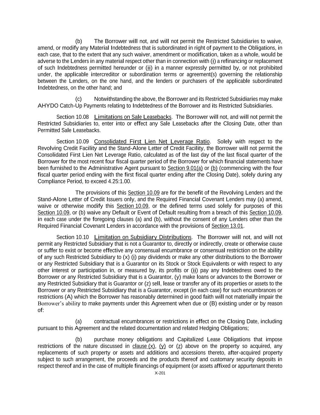 X-201 (b) The Borrower will not, and will not permit the Restricted Subsidiaries to waive, amend, or modify any Material Indebtedness that is subordinated in right of payment to the Obligations, in each case, that to the extent that any such waiver, amendment or modification, taken as a whole, would be adverse to the Lenders in any material respect other than in connection with (i) a refinancing or replacement of such Indebtedness permitted hereunder or (ii) in a manner expressly permitted by, or not prohibited under, the applicable intercreditor or subordination terms or agreement(s) governing the relationship between the Lenders, on the one hand, and the lenders or purchasers of the applicable subordinated Indebtedness, on the other hand; and (c) Notwithstanding the above, the Borrower and its Restricted Subsidiaries may make AHYDO Catch-Up Payments relating to Indebtedness of the Borrower and its Restricted Subsidiaries. Section 10.08 Limitations on Sale Leasebacks. The Borrower will not, and will not permit the Restricted Subsidiaries to, enter into or effect any Sale Leasebacks after the Closing Date, other than Permitted Sale Leasebacks. Section 10.09 Consolidated First Lien Net Leverage Ratio. Solely with respect to the Revolving Credit Facility and the Stand-Alone Letter of Credit Facility, the Borrower will not permit the Consolidated First Lien Net Leverage Ratio, calculated as of the last day of the last fiscal quarter of the Borrower for the most recent four fiscal quarter period of the Borrower for which financial statements have been furnished to the Administrative Agent pursuant to Section 9.01(a) or (b) (commencing with the four fiscal quarter period ending with the first fiscal quarter ending after the Closing Date), solely during any Compliance Period, to exceed 4.25:1.00. The provisions of this Section 10.09 are for the benefit of the Revolving Lenders and the Stand-Alone Letter of Credit Issuers only, and the Required Financial Covenant Lenders may (a) amend, waive or otherwise modify this Section 10.09, or the defined terms used solely for purposes of this Section 10.09, or (b) waive any Default or Event of Default resulting from a breach of this Section 10.09, in each case under the foregoing clauses (a) and (b), without the consent of any Lenders other than the Required Financial Covenant Lenders in accordance with the provisions of Section 13.01. Section 10.10 Limitation on Subsidiary Distributions. The Borrower will not, and will not permit any Restricted Subsidiary that is not a Guarantor to, directly or indirectly, create or otherwise cause or suffer to exist or become effective any consensual encumbrance or consensual restriction on the ability of any such Restricted Subsidiary to (x) (i) pay dividends or make any other distributions to the Borrower or any Restricted Subsidiary that is a Guarantor on its Stock or Stock Equivalents or with respect to any other interest or participation in, or measured by, its profits or (ii) pay any Indebtedness owed to the Borrower or any Restricted Subsidiary that is a Guarantor, (y) make loans or advances to the Borrower or any Restricted Subsidiary that is Guarantor or (z) sell, lease or transfer any of its properties or assets to the Borrower or any Restricted Subsidiary that is a Guarantor, except (in each case) for such encumbrances or restrictions (A) which the Borrower has reasonably determined in good faith will not materially impair the Borrower’s ability to make payments under this Agreement when due or (B) existing under or by reason of: (a) contractual encumbrances or restrictions in effect on the Closing Date, including pursuant to this Agreement and the related documentation and related Hedging Obligations; (b) purchase money obligations and Capitalized Lease Obligations that impose restrictions of the nature discussed in clause (x), (y) or (z) above on the property so acquired, any replacements of such property or assets and additions and accessions thereto, after-acquired property subject to such arrangement, the proceeds and the products thereof and customary security deposits in respect thereof and in the case of multiple financings of equipment (or assets affixed or appurtenant thereto