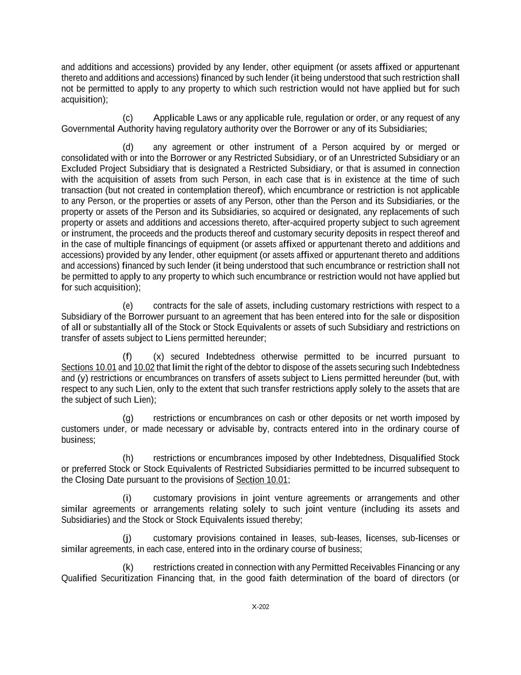 X-202 and additions and accessions) provided by any lender, other equipment (or assets affixed or appurtenant thereto and additions and accessions) financed by such lender (it being understood that such restriction shall not be permitted to apply to any property to which such restriction would not have applied but for such acquisition); (c) Applicable Laws or any applicable rule, regulation or order, or any request of any Governmental Authority having regulatory authority over the Borrower or any of its Subsidiaries; (d) any agreement or other instrument of a Person acquired by or merged or consolidated with or into the Borrower or any Restricted Subsidiary, or of an Unrestricted Subsidiary or an Excluded Project Subsidiary that is designated a Restricted Subsidiary, or that is assumed in connection with the acquisition of assets from such Person, in each case that is in existence at the time of such transaction (but not created in contemplation thereof), which encumbrance or restriction is not applicable to any Person, or the properties or assets of any Person, other than the Person and its Subsidiaries, or the property or assets of the Person and its Subsidiaries, so acquired or designated, any replacements of such property or assets and additions and accessions thereto, after-acquired property subject to such agreement or instrument, the proceeds and the products thereof and customary security deposits in respect thereof and in the case of multiple financings of equipment (or assets affixed or appurtenant thereto and additions and accessions) provided by any lender, other equipment (or assets affixed or appurtenant thereto and additions and accessions) financed by such lender (it being understood that such encumbrance or restriction shall not be permitted to apply to any property to which such encumbrance or restriction would not have applied but for such acquisition); (e) contracts for the sale of assets, including customary restrictions with respect to a Subsidiary of the Borrower pursuant to an agreement that has been entered into for the sale or disposition of all or substantially all of the Stock or Stock Equivalents or assets of such Subsidiary and restrictions on transfer of assets subject to Liens permitted hereunder; (f) (x) secured Indebtedness otherwise permitted to be incurred pursuant to Sections 10.01 and 10.02 that limit the right of the debtor to dispose of the assets securing such Indebtedness and (y) restrictions or encumbrances on transfers of assets subject to Liens permitted hereunder (but, with respect to any such Lien, only to the extent that such transfer restrictions apply solely to the assets that are the subject of such Lien); (g) restrictions or encumbrances on cash or other deposits or net worth imposed by customers under, or made necessary or advisable by, contracts entered into in the ordinary course of business; (h) restrictions or encumbrances imposed by other Indebtedness, Disqualified Stock or preferred Stock or Stock Equivalents of Restricted Subsidiaries permitted to be incurred subsequent to the Closing Date pursuant to the provisions of Section 10.01; (i) customary provisions in joint venture agreements or arrangements and other similar agreements or arrangements relating solely to such joint venture (including its assets and Subsidiaries) and the Stock or Stock Equivalents issued thereby; (j) customary provisions contained in leases, sub-leases, licenses, sub-licenses or similar agreements, in each case, entered into in the ordinary course of business; (k) restrictions created in connection with any Permitted Receivables Financing or any Qualified Securitization Financing that, in the good faith determination of the board of directors (or