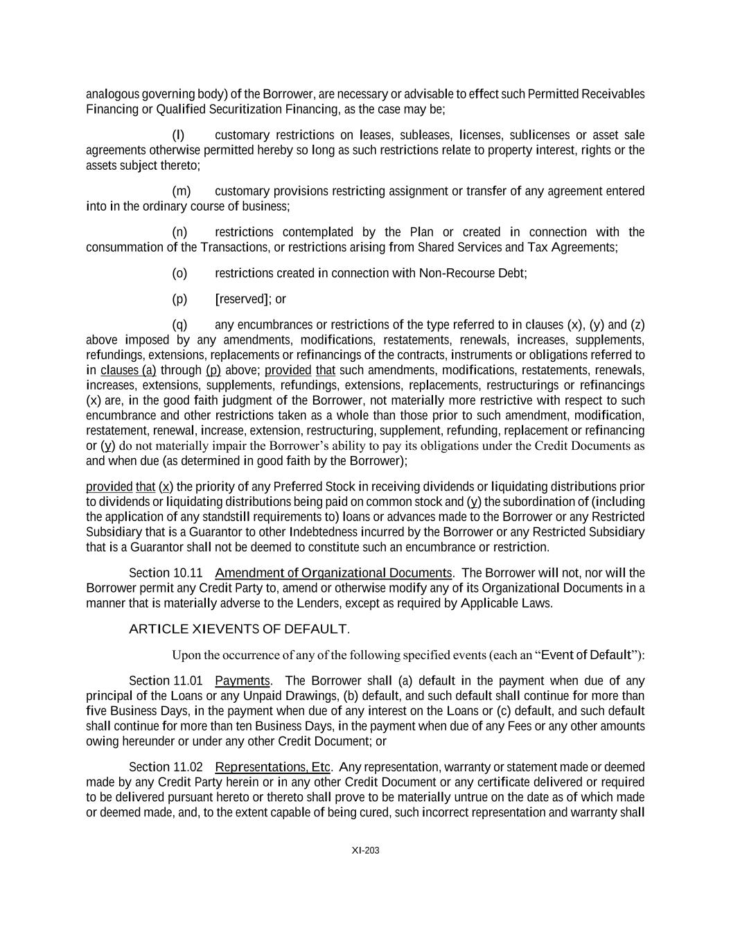 XI-203 analogous governing body) of the Borrower, are necessary or advisable to effect such Permitted Receivables Financing or Qualified Securitization Financing, as the case may be; (l) customary restrictions on leases, subleases, licenses, sublicenses or asset sale agreements otherwise permitted hereby so long as such restrictions relate to property interest, rights or the assets subject thereto; (m) customary provisions restricting assignment or transfer of any agreement entered into in the ordinary course of business; (n) restrictions contemplated by the Plan or created in connection with the consummation of the Transactions, or restrictions arising from Shared Services and Tax Agreements; (o) restrictions created in connection with Non-Recourse Debt; (p) [reserved]; or (q) any encumbrances or restrictions of the type referred to in clauses (x), (y) and (z) above imposed by any amendments, modifications, restatements, renewals, increases, supplements, refundings, extensions, replacements or refinancings of the contracts, instruments or obligations referred to in clauses (a) through (p) above; provided that such amendments, modifications, restatements, renewals, increases, extensions, supplements, refundings, extensions, replacements, restructurings or refinancings (x) are, in the good faith judgment of the Borrower, not materially more restrictive with respect to such encumbrance and other restrictions taken as a whole than those prior to such amendment, modification, restatement, renewal, increase, extension, restructuring, supplement, refunding, replacement or refinancing or (y) do not materially impair the Borrower’s ability to pay its obligations under the Credit Documents as and when due (as determined in good faith by the Borrower); provided that (x) the priority of any Preferred Stock in receiving dividends or liquidating distributions prior to dividends or liquidating distributions being paid on common stock and (y) the subordination of (including the application of any standstill requirements to) loans or advances made to the Borrower or any Restricted Subsidiary that is a Guarantor to other Indebtedness incurred by the Borrower or any Restricted Subsidiary that is a Guarantor shall not be deemed to constitute such an encumbrance or restriction. Section 10.11 Amendment of Organizational Documents. The Borrower will not, nor will the Borrower permit any Credit Party to, amend or otherwise modify any of its Organizational Documents in a manner that is materially adverse to the Lenders, except as required by Applicable Laws. ARTICLE XIEVENTS OF DEFAULT. Upon the occurrence of any of the following specified events (each an “Event of Default”): Section 11.01 Payments. The Borrower shall (a) default in the payment when due of any principal of the Loans or any Unpaid Drawings, (b) default, and such default shall continue for more than five Business Days, in the payment when due of any interest on the Loans or (c) default, and such default shall continue for more than ten Business Days, in the payment when due of any Fees or any other amounts owing hereunder or under any other Credit Document; or Section 11.02 Representations, Etc. Any representation, warranty or statement made or deemed made by any Credit Party herein or in any other Credit Document or any certificate delivered or required to be delivered pursuant hereto or thereto shall prove to be materially untrue on the date as of which made or deemed made, and, to the extent capable of being cured, such incorrect representation and warranty shall