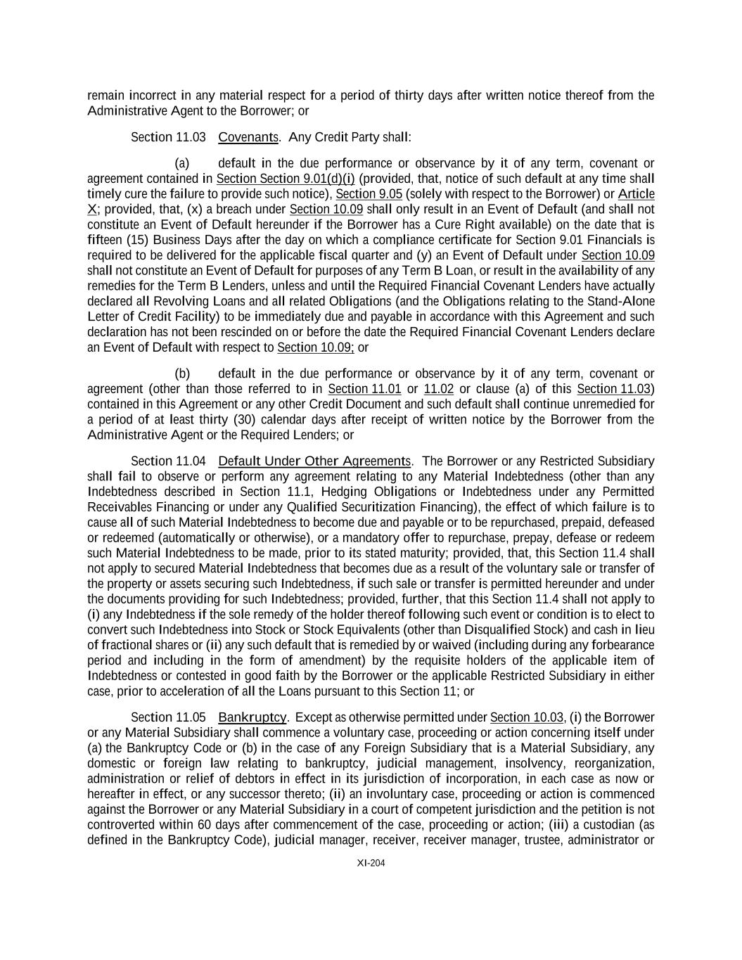 XI-204 remain incorrect in any material respect for a period of thirty days after written notice thereof from the Administrative Agent to the Borrower; or Section 11.03 Covenants. Any Credit Party shall: (a) default in the due performance or observance by it of any term, covenant or agreement contained in Section Section 9.01(d)(i) (provided, that, notice of such default at any time shall timely cure the failure to provide such notice), Section 9.05 (solely with respect to the Borrower) or Article X; provided, that, (x) a breach under Section 10.09 shall only result in an Event of Default (and shall not constitute an Event of Default hereunder if the Borrower has a Cure Right available) on the date that is fifteen (15) Business Days after the day on which a compliance certificate for Section 9.01 Financials is required to be delivered for the applicable fiscal quarter and (y) an Event of Default under Section 10.09 shall not constitute an Event of Default for purposes of any Term B Loan, or result in the availability of any remedies for the Term B Lenders, unless and until the Required Financial Covenant Lenders have actually declared all Revolving Loans and all related Obligations (and the Obligations relating to the Stand-Alone Letter of Credit Facility) to be immediately due and payable in accordance with this Agreement and such declaration has not been rescinded on or before the date the Required Financial Covenant Lenders declare an Event of Default with respect to Section 10.09; or (b) default in the due performance or observance by it of any term, covenant or agreement (other than those referred to in Section 11.01 or 11.02 or clause (a) of this Section 11.03) contained in this Agreement or any other Credit Document and such default shall continue unremedied for a period of at least thirty (30) calendar days after receipt of written notice by the Borrower from the Administrative Agent or the Required Lenders; or Section 11.04 Default Under Other Agreements. The Borrower or any Restricted Subsidiary shall fail to observe or perform any agreement relating to any Material Indebtedness (other than any Indebtedness described in Section 11.1, Hedging Obligations or Indebtedness under any Permitted Receivables Financing or under any Qualified Securitization Financing), the effect of which failure is to cause all of such Material Indebtedness to become due and payable or to be repurchased, prepaid, defeased or redeemed (automatically or otherwise), or a mandatory offer to repurchase, prepay, defease or redeem such Material Indebtedness to be made, prior to its stated maturity; provided, that, this Section 11.4 shall not apply to secured Material Indebtedness that becomes due as a result of the voluntary sale or transfer of the property or assets securing such Indebtedness, if such sale or transfer is permitted hereunder and under the documents providing for such Indebtedness; provided, further, that this Section 11.4 shall not apply to (i) any Indebtedness if the sole remedy of the holder thereof following such event or condition is to elect to convert such Indebtedness into Stock or Stock Equivalents (other than Disqualified Stock) and cash in lieu of fractional shares or (ii) any such default that is remedied by or waived (including during any forbearance period and including in the form of amendment) by the requisite holders of the applicable item of Indebtedness or contested in good faith by the Borrower or the applicable Restricted Subsidiary in either case, prior to acceleration of all the Loans pursuant to this Section 11; or Section 11.05 Bankruptcy. Except as otherwise permitted under Section 10.03, (i) the Borrower or any Material Subsidiary shall commence a voluntary case, proceeding or action concerning itself under (a) the Bankruptcy Code or (b) in the case of any Foreign Subsidiary that is a Material Subsidiary, any domestic or foreign law relating to bankruptcy, judicial management, insolvency, reorganization, administration or relief of debtors in effect in its jurisdiction of incorporation, in each case as now or hereafter in effect, or any successor thereto; (ii) an involuntary case, proceeding or action is commenced against the Borrower or any Material Subsidiary in a court of competent jurisdiction and the petition is not controverted within 60 days after commencement of the case, proceeding or action; (iii) a custodian (as defined in the Bankruptcy Code), judicial manager, receiver, receiver manager, trustee, administrator or