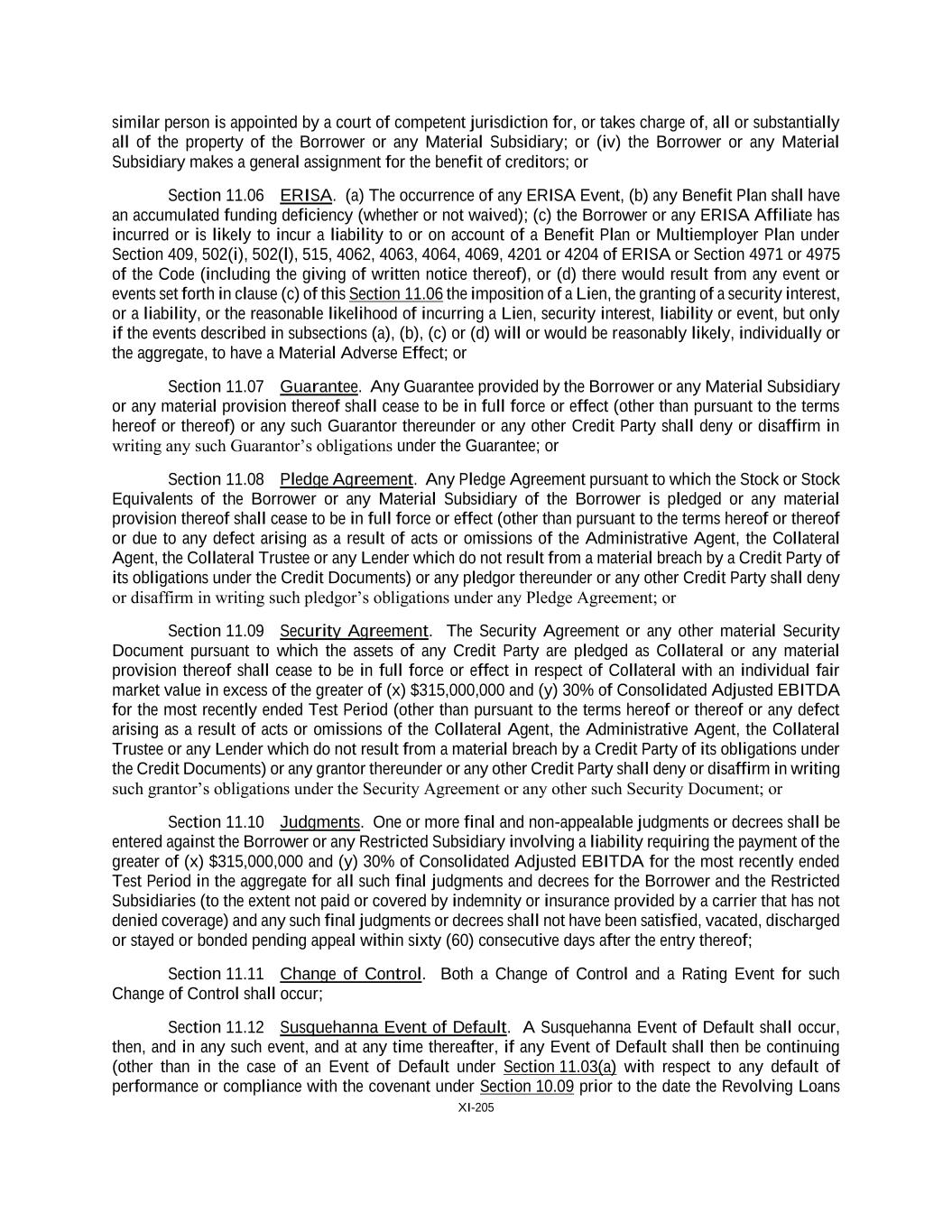 XI-205 similar person is appointed by a court of competent jurisdiction for, or takes charge of, all or substantially all of the property of the Borrower or any Material Subsidiary; or (iv) the Borrower or any Material Subsidiary makes a general assignment for the benefit of creditors; or Section 11.06 ERISA. (a) The occurrence of any ERISA Event, (b) any Benefit Plan shall have an accumulated funding deficiency (whether or not waived); (c) the Borrower or any ERISA Affiliate has incurred or is likely to incur a liability to or on account of a Benefit Plan or Multiemployer Plan under Section 409, 502(i), 502(l), 515, 4062, 4063, 4064, 4069, 4201 or 4204 of ERISA or Section 4971 or 4975 of the Code (including the giving of written notice thereof), or (d) there would result from any event or events set forth in clause (c) of this Section 11.06 the imposition of a Lien, the granting of a security interest, or a liability, or the reasonable likelihood of incurring a Lien, security interest, liability or event, but only if the events described in subsections (a), (b), (c) or (d) will or would be reasonably likely, individually or the aggregate, to have a Material Adverse Effect; or Section 11.07 Guarantee. Any Guarantee provided by the Borrower or any Material Subsidiary or any material provision thereof shall cease to be in full force or effect (other than pursuant to the terms hereof or thereof) or any such Guarantor thereunder or any other Credit Party shall deny or disaffirm in writing any such Guarantor’s obligations under the Guarantee; or Section 11.08 Pledge Agreement. Any Pledge Agreement pursuant to which the Stock or Stock Equivalents of the Borrower or any Material Subsidiary of the Borrower is pledged or any material provision thereof shall cease to be in full force or effect (other than pursuant to the terms hereof or thereof or due to any defect arising as a result of acts or omissions of the Administrative Agent, the Collateral Agent, the Collateral Trustee or any Lender which do not result from a material breach by a Credit Party of its obligations under the Credit Documents) or any pledgor thereunder or any other Credit Party shall deny or disaffirm in writing such pledgor’s obligations under any Pledge Agreement; or Section 11.09 Security Agreement. The Security Agreement or any other material Security Document pursuant to which the assets of any Credit Party are pledged as Collateral or any material provision thereof shall cease to be in full force or effect in respect of Collateral with an individual fair market value in excess of the greater of (x) $315,000,000 and (y) 30% of Consolidated Adjusted EBITDA for the most recently ended Test Period (other than pursuant to the terms hereof or thereof or any defect arising as a result of acts or omissions of the Collateral Agent, the Administrative Agent, the Collateral Trustee or any Lender which do not result from a material breach by a Credit Party of its obligations under the Credit Documents) or any grantor thereunder or any other Credit Party shall deny or disaffirm in writing such grantor’s obligations under the Security Agreement or any other such Security Document; or Section 11.10 Judgments. One or more final and non-appealable judgments or decrees shall be entered against the Borrower or any Restricted Subsidiary involving a liability requiring the payment of the greater of (x) $315,000,000 and (y) 30% of Consolidated Adjusted EBITDA for the most recently ended Test Period in the aggregate for all such final judgments and decrees for the Borrower and the Restricted Subsidiaries (to the extent not paid or covered by indemnity or insurance provided by a carrier that has not denied coverage) and any such final judgments or decrees shall not have been satisfied, vacated, discharged or stayed or bonded pending appeal within sixty (60) consecutive days after the entry thereof; Section 11.11 Change of Control. Both a Change of Control and a Rating Event for such Change of Control shall occur; Section 11.12 Susquehanna Event of Default. A Susquehanna Event of Default shall occur, then, and in any such event, and at any time thereafter, if any Event of Default shall then be continuing (other than in the case of an Event of Default under Section 11.03(a) with respect to any default of performance or compliance with the covenant under Section 10.09 prior to the date the Revolving Loans