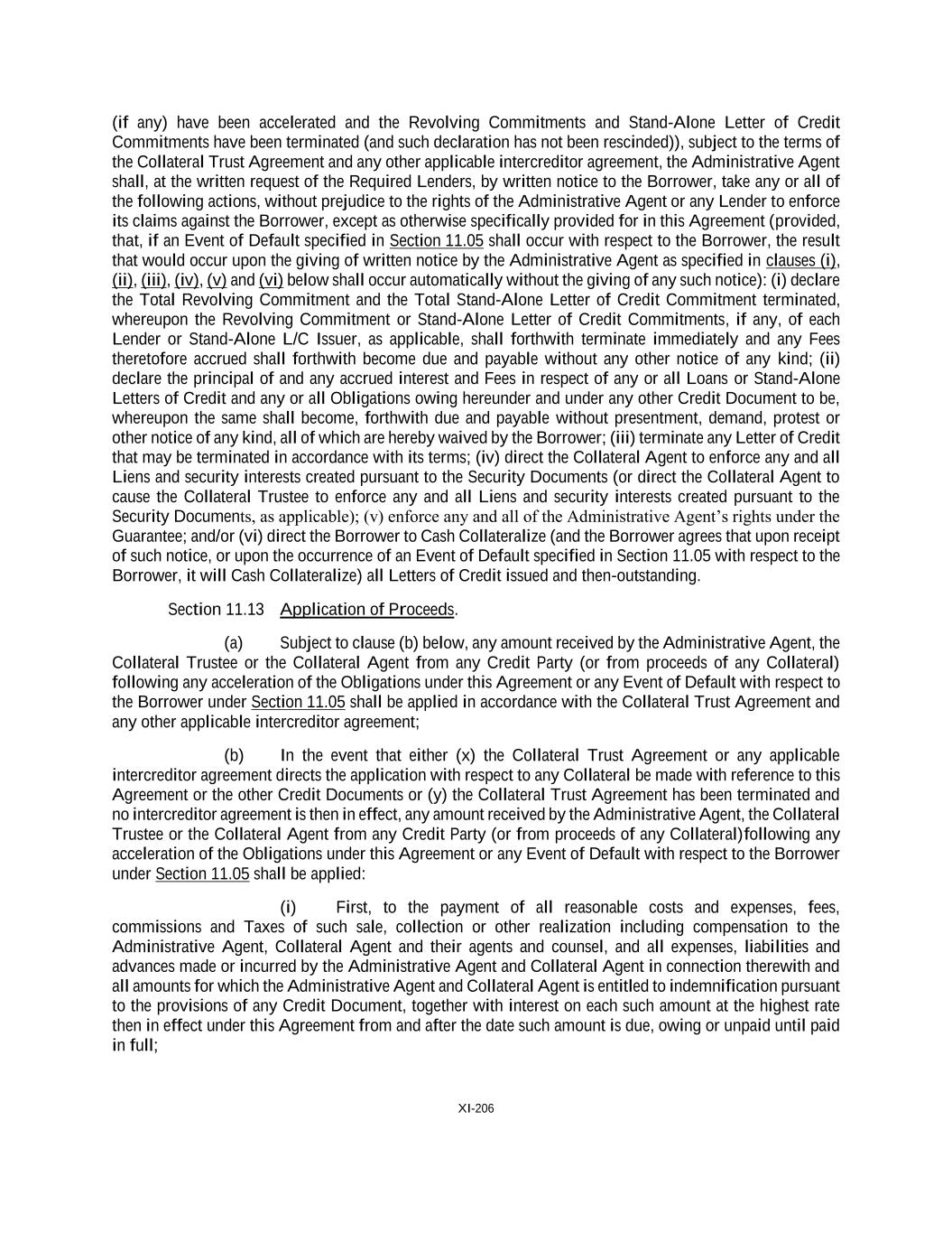 XI-206 (if any) have been accelerated and the Revolving Commitments and Stand-Alone Letter of Credit Commitments have been terminated (and such declaration has not been rescinded)), subject to the terms of the Collateral Trust Agreement and any other applicable intercreditor agreement, the Administrative Agent shall, at the written request of the Required Lenders, by written notice to the Borrower, take any or all of the following actions, without prejudice to the rights of the Administrative Agent or any Lender to enforce its claims against the Borrower, except as otherwise specifically provided for in this Agreement (provided, that, if an Event of Default specified in Section 11.05 shall occur with respect to the Borrower, the result that would occur upon the giving of written notice by the Administrative Agent as specified in clauses (i), (ii), (iii), (iv), (v) and (vi) below shall occur automatically without the giving of any such notice): (i) declare the Total Revolving Commitment and the Total Stand-Alone Letter of Credit Commitment terminated, whereupon the Revolving Commitment or Stand-Alone Letter of Credit Commitments, if any, of each Lender or Stand-Alone L/C Issuer, as applicable, shall forthwith terminate immediately and any Fees theretofore accrued shall forthwith become due and payable without any other notice of any kind; (ii) declare the principal of and any accrued interest and Fees in respect of any or all Loans or Stand-Alone Letters of Credit and any or all Obligations owing hereunder and under any other Credit Document to be, whereupon the same shall become, forthwith due and payable without presentment, demand, protest or other notice of any kind, all of which are hereby waived by the Borrower; (iii) terminate any Letter of Credit that may be terminated in accordance with its terms; (iv) direct the Collateral Agent to enforce any and all Liens and security interests created pursuant to the Security Documents (or direct the Collateral Agent to cause the Collateral Trustee to enforce any and all Liens and security interests created pursuant to the Security Documents, as applicable); (v) enforce any and all of the Administrative Agent’s rights under the Guarantee; and/or (vi) direct the Borrower to Cash Collateralize (and the Borrower agrees that upon receipt of such notice, or upon the occurrence of an Event of Default specified in Section 11.05 with respect to the Borrower, it will Cash Collateralize) all Letters of Credit issued and then-outstanding. Section 11.13 Application of Proceeds. (a) Subject to clause (b) below, any amount received by the Administrative Agent, the Collateral Trustee or the Collateral Agent from any Credit Party (or from proceeds of any Collateral) following any acceleration of the Obligations under this Agreement or any Event of Default with respect to the Borrower under Section 11.05 shall be applied in accordance with the Collateral Trust Agreement and any other applicable intercreditor agreement; (b) In the event that either (x) the Collateral Trust Agreement or any applicable intercreditor agreement directs the application with respect to any Collateral be made with reference to this Agreement or the other Credit Documents or (y) the Collateral Trust Agreement has been terminated and no intercreditor agreement is then in effect, any amount received by the Administrative Agent, the Collateral Trustee or the Collateral Agent from any Credit Party (or from proceeds of any Collateral)following any acceleration of the Obligations under this Agreement or any Event of Default with respect to the Borrower under Section 11.05 shall be applied: (i) First, to the payment of all reasonable costs and expenses, fees, commissions and Taxes of such sale, collection or other realization including compensation to the Administrative Agent, Collateral Agent and their agents and counsel, and all expenses, liabilities and advances made or incurred by the Administrative Agent and Collateral Agent in connection therewith and all amounts for which the Administrative Agent and Collateral Agent is entitled to indemnification pursuant to the provisions of any Credit Document, together with interest on each such amount at the highest rate then in effect under this Agreement from and after the date such amount is due, owing or unpaid until paid in full;