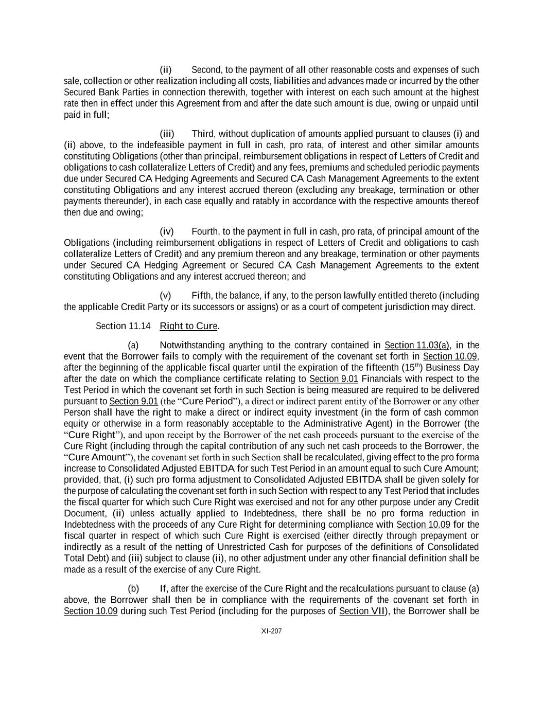 XI-207 (ii) Second, to the payment of all other reasonable costs and expenses of such sale, collection or other realization including all costs, liabilities and advances made or incurred by the other Secured Bank Parties in connection therewith, together with interest on each such amount at the highest rate then in effect under this Agreement from and after the date such amount is due, owing or unpaid until paid in full; (iii) Third, without duplication of amounts applied pursuant to clauses (i) and (ii) above, to the indefeasible payment in full in cash, pro rata, of interest and other similar amounts constituting Obligations (other than principal, reimbursement obligations in respect of Letters of Credit and obligations to cash collateralize Letters of Credit) and any fees, premiums and scheduled periodic payments due under Secured CA Hedging Agreements and Secured CA Cash Management Agreements to the extent constituting Obligations and any interest accrued thereon (excluding any breakage, termination or other payments thereunder), in each case equally and ratably in accordance with the respective amounts thereof then due and owing; (iv) Fourth, to the payment in full in cash, pro rata, of principal amount of the Obligations (including reimbursement obligations in respect of Letters of Credit and obligations to cash collateralize Letters of Credit) and any premium thereon and any breakage, termination or other payments under Secured CA Hedging Agreement or Secured CA Cash Management Agreements to the extent constituting Obligations and any interest accrued thereon; and (v) Fifth, the balance, if any, to the person lawfully entitled thereto (including the applicable Credit Party or its successors or assigns) or as a court of competent jurisdiction may direct. Section 11.14 Right to Cure. (a) Notwithstanding anything to the contrary contained in Section 11.03(a), in the event that the Borrower fails to comply with the requirement of the covenant set forth in Section 10.09, after the beginning of the applicable fiscal quarter until the expiration of the fifteenth (15th) Business Day after the date on which the compliance certificate relating to Section 9.01 Financials with respect to the Test Period in which the covenant set forth in such Section is being measured are required to be delivered pursuant to Section 9.01 (the “Cure Period”), a direct or indirect parent entity of the Borrower or any other Person shall have the right to make a direct or indirect equity investment (in the form of cash common equity or otherwise in a form reasonably acceptable to the Administrative Agent) in the Borrower (the “Cure Right”), and upon receipt by the Borrower of the net cash proceeds pursuant to the exercise of the Cure Right (including through the capital contribution of any such net cash proceeds to the Borrower, the “Cure Amount”), the covenant set forth in such Section shall be recalculated, giving effect to the pro forma increase to Consolidated Adjusted EBITDA for such Test Period in an amount equal to such Cure Amount; provided, that, (i) such pro forma adjustment to Consolidated Adjusted EBITDA shall be given solely for the purpose of calculating the covenant set forth in such Section with respect to any Test Period that includes the fiscal quarter for which such Cure Right was exercised and not for any other purpose under any Credit Document, (ii) unless actually applied to Indebtedness, there shall be no pro forma reduction in Indebtedness with the proceeds of any Cure Right for determining compliance with Section 10.09 for the fiscal quarter in respect of which such Cure Right is exercised (either directly through prepayment or indirectly as a result of the netting of Unrestricted Cash for purposes of the definitions of Consolidated Total Debt) and (iii) subject to clause (ii), no other adjustment under any other financial definition shall be made as a result of the exercise of any Cure Right. (b) If, after the exercise of the Cure Right and the recalculations pursuant to clause (a) above, the Borrower shall then be in compliance with the requirements of the covenant set forth in Section 10.09 during such Test Period (including for the purposes of Section VII), the Borrower shall be