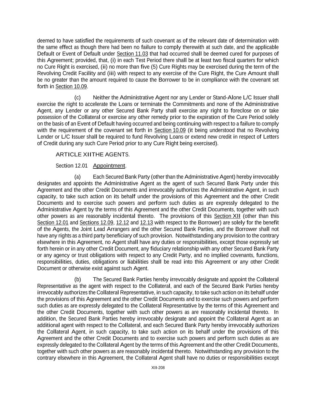 XII-208 deemed to have satisfied the requirements of such covenant as of the relevant date of determination with the same effect as though there had been no failure to comply therewith at such date, and the applicable Default or Event of Default under Section 11.03 that had occurred shall be deemed cured for purposes of this Agreement; provided, that, (i) in each Test Period there shall be at least two fiscal quarters for which no Cure Right is exercised, (ii) no more than five (5) Cure Rights may be exercised during the term of the Revolving Credit Facility and (iii) with respect to any exercise of the Cure Right, the Cure Amount shall be no greater than the amount required to cause the Borrower to be in compliance with the covenant set forth in Section 10.09. (c) Neither the Administrative Agent nor any Lender or Stand-Alone L/C Issuer shall exercise the right to accelerate the Loans or terminate the Commitments and none of the Administrative Agent, any Lender or any other Secured Bank Party shall exercise any right to foreclose on or take possession of the Collateral or exercise any other remedy prior to the expiration of the Cure Period solely on the basis of an Event of Default having occurred and being continuing with respect to a failure to comply with the requirement of the covenant set forth in Section 10.09 (it being understood that no Revolving Lender or L/C Issuer shall be required to fund Revolving Loans or extend new credit in respect of Letters of Credit during any such Cure Period prior to any Cure Right being exercised). ARTICLE XIITHE AGENTS. Section 12.01 Appointment. (a) Each Secured Bank Party (other than the Administrative Agent) hereby irrevocably designates and appoints the Administrative Agent as the agent of such Secured Bank Party under this Agreement and the other Credit Documents and irrevocably authorizes the Administrative Agent, in such capacity, to take such action on its behalf under the provisions of this Agreement and the other Credit Documents and to exercise such powers and perform such duties as are expressly delegated to the Administrative Agent by the terms of this Agreement and the other Credit Documents, together with such other powers as are reasonably incidental thereto. The provisions of this Section XII (other than this Section 12.01 and Sections 12.09, 12.12 and 12.13 with respect to the Borrower) are solely for the benefit of the Agents, the Joint Lead Arrangers and the other Secured Bank Parties, and the Borrower shall not have any rights as a third party beneficiary of such provision. Notwithstanding any provision to the contrary elsewhere in this Agreement, no Agent shall have any duties or responsibilities, except those expressly set forth herein or in any other Credit Document, any fiduciary relationship with any other Secured Bank Party or any agency or trust obligations with respect to any Credit Party, and no implied covenants, functions, responsibilities, duties, obligations or liabilities shall be read into this Agreement or any other Credit Document or otherwise exist against such Agent. (b) The Secured Bank Parties hereby irrevocably designate and appoint the Collateral Representative as the agent with respect to the Collateral, and each of the Secured Bank Parties hereby irrevocably authorizes the Collateral Representative, in such capacity, to take such action on its behalf under the provisions of this Agreement and the other Credit Documents and to exercise such powers and perform such duties as are expressly delegated to the Collateral Representative by the terms of this Agreement and the other Credit Documents, together with such other powers as are reasonably incidental thereto. In addition, the Secured Bank Parties hereby irrevocably designate and appoint the Collateral Agent as an additional agent with respect to the Collateral, and each Secured Bank Party hereby irrevocably authorizes the Collateral Agent, in such capacity, to take such action on its behalf under the provisions of this Agreement and the other Credit Documents and to exercise such powers and perform such duties as are expressly delegated to the Collateral Agent by the terms of this Agreement and the other Credit Documents, together with such other powers as are reasonably incidental thereto. Notwithstanding any provision to the contrary elsewhere in this Agreement, the Collateral Agent shall have no duties or responsibilities except