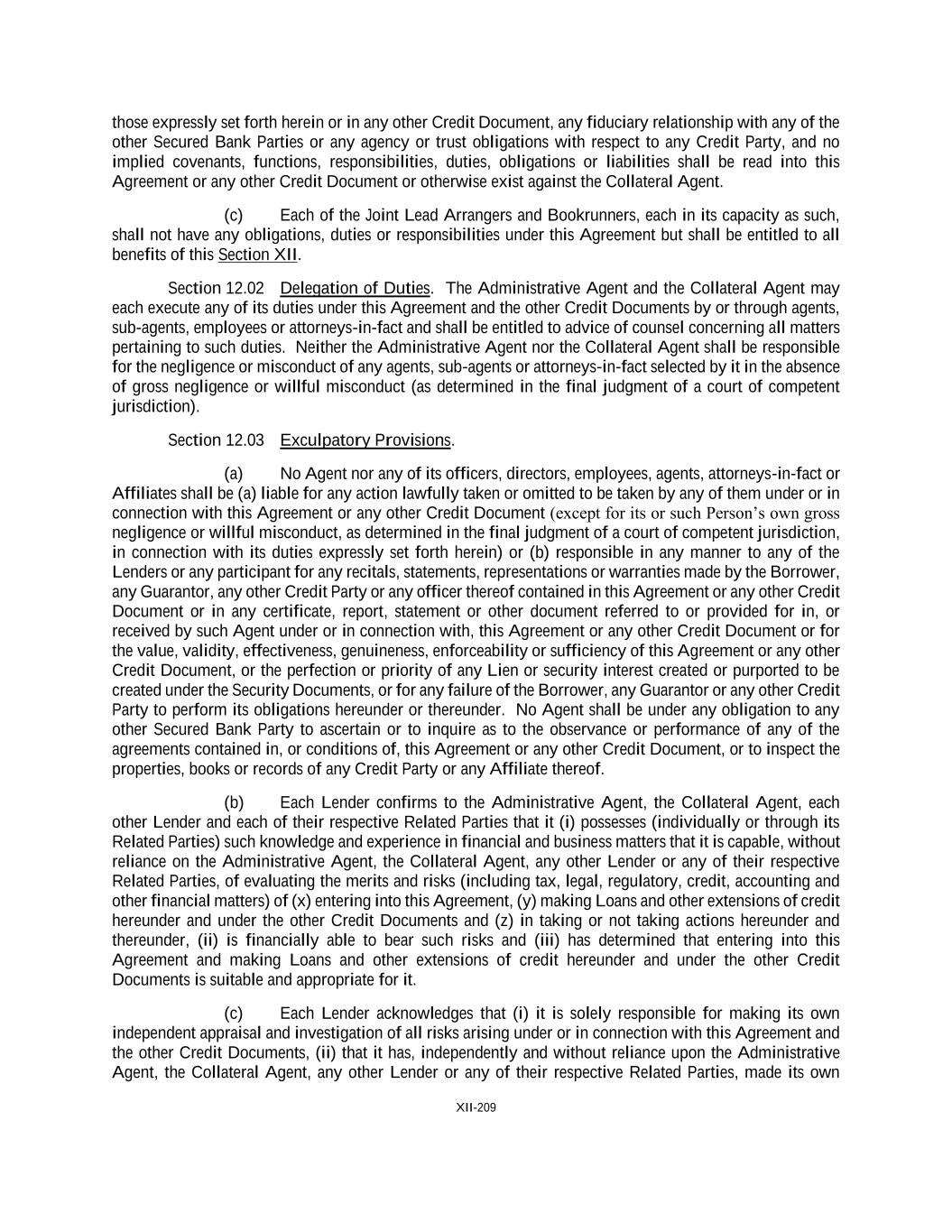 XII-209 those expressly set forth herein or in any other Credit Document, any fiduciary relationship with any of the other Secured Bank Parties or any agency or trust obligations with respect to any Credit Party, and no implied covenants, functions, responsibilities, duties, obligations or liabilities shall be read into this Agreement or any other Credit Document or otherwise exist against the Collateral Agent. (c) Each of the Joint Lead Arrangers and Bookrunners, each in its capacity as such, shall not have any obligations, duties or responsibilities under this Agreement but shall be entitled to all benefits of this Section XII. Section 12.02 Delegation of Duties. The Administrative Agent and the Collateral Agent may each execute any of its duties under this Agreement and the other Credit Documents by or through agents, sub-agents, employees or attorneys-in-fact and shall be entitled to advice of counsel concerning all matters pertaining to such duties. Neither the Administrative Agent nor the Collateral Agent shall be responsible for the negligence or misconduct of any agents, sub-agents or attorneys-in-fact selected by it in the absence of gross negligence or willful misconduct (as determined in the final judgment of a court of competent jurisdiction). Section 12.03 Exculpatory Provisions. (a) No Agent nor any of its officers, directors, employees, agents, attorneys-in-fact or Affiliates shall be (a) liable for any action lawfully taken or omitted to be taken by any of them under or in connection with this Agreement or any other Credit Document (except for its or such Person’s own gross negligence or willful misconduct, as determined in the final judgment of a court of competent jurisdiction, in connection with its duties expressly set forth herein) or (b) responsible in any manner to any of the Lenders or any participant for any recitals, statements, representations or warranties made by the Borrower, any Guarantor, any other Credit Party or any officer thereof contained in this Agreement or any other Credit Document or in any certificate, report, statement or other document referred to or provided for in, or received by such Agent under or in connection with, this Agreement or any other Credit Document or for the value, validity, effectiveness, genuineness, enforceability or sufficiency of this Agreement or any other Credit Document, or the perfection or priority of any Lien or security interest created or purported to be created under the Security Documents, or for any failure of the Borrower, any Guarantor or any other Credit Party to perform its obligations hereunder or thereunder. No Agent shall be under any obligation to any other Secured Bank Party to ascertain or to inquire as to the observance or performance of any of the agreements contained in, or conditions of, this Agreement or any other Credit Document, or to inspect the properties, books or records of any Credit Party or any Affiliate thereof. (b) Each Lender confirms to the Administrative Agent, the Collateral Agent, each other Lender and each of their respective Related Parties that it (i) possesses (individually or through its Related Parties) such knowledge and experience in financial and business matters that it is capable, without reliance on the Administrative Agent, the Collateral Agent, any other Lender or any of their respective Related Parties, of evaluating the merits and risks (including tax, legal, regulatory, credit, accounting and other financial matters) of (x) entering into this Agreement, (y) making Loans and other extensions of credit hereunder and under the other Credit Documents and (z) in taking or not taking actions hereunder and thereunder, (ii) is financially able to bear such risks and (iii) has determined that entering into this Agreement and making Loans and other extensions of credit hereunder and under the other Credit Documents is suitable and appropriate for it. (c) Each Lender acknowledges that (i) it is solely responsible for making its own independent appraisal and investigation of all risks arising under or in connection with this Agreement and the other Credit Documents, (ii) that it has, independently and without reliance upon the Administrative Agent, the Collateral Agent, any other Lender or any of their respective Related Parties, made its own