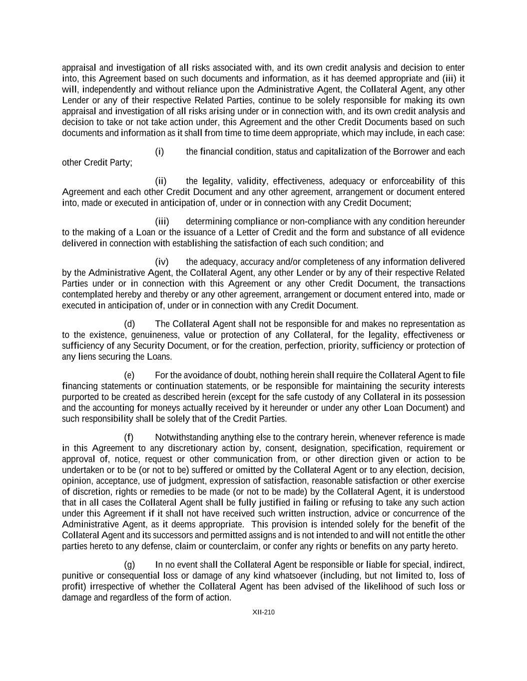 XII-210 appraisal and investigation of all risks associated with, and its own credit analysis and decision to enter into, this Agreement based on such documents and information, as it has deemed appropriate and (iii) it will, independently and without reliance upon the Administrative Agent, the Collateral Agent, any other Lender or any of their respective Related Parties, continue to be solely responsible for making its own appraisal and investigation of all risks arising under or in connection with, and its own credit analysis and decision to take or not take action under, this Agreement and the other Credit Documents based on such documents and information as it shall from time to time deem appropriate, which may include, in each case: (i) the financial condition, status and capitalization of the Borrower and each other Credit Party; (ii) the legality, validity, effectiveness, adequacy or enforceability of this Agreement and each other Credit Document and any other agreement, arrangement or document entered into, made or executed in anticipation of, under or in connection with any Credit Document; (iii) determining compliance or non-compliance with any condition hereunder to the making of a Loan or the issuance of a Letter of Credit and the form and substance of all evidence delivered in connection with establishing the satisfaction of each such condition; and (iv) the adequacy, accuracy and/or completeness of any information delivered by the Administrative Agent, the Collateral Agent, any other Lender or by any of their respective Related Parties under or in connection with this Agreement or any other Credit Document, the transactions contemplated hereby and thereby or any other agreement, arrangement or document entered into, made or executed in anticipation of, under or in connection with any Credit Document. (d) The Collateral Agent shall not be responsible for and makes no representation as to the existence, genuineness, value or protection of any Collateral, for the legality, effectiveness or sufficiency of any Security Document, or for the creation, perfection, priority, sufficiency or protection of any liens securing the Loans. (e) For the avoidance of doubt, nothing herein shall require the Collateral Agent to file financing statements or continuation statements, or be responsible for maintaining the security interests purported to be created as described herein (except for the safe custody of any Collateral in its possession and the accounting for moneys actually received by it hereunder or under any other Loan Document) and such responsibility shall be solely that of the Credit Parties. (f) Notwithstanding anything else to the contrary herein, whenever reference is made in this Agreement to any discretionary action by, consent, designation, specification, requirement or approval of, notice, request or other communication from, or other direction given or action to be undertaken or to be (or not to be) suffered or omitted by the Collateral Agent or to any election, decision, opinion, acceptance, use of judgment, expression of satisfaction, reasonable satisfaction or other exercise of discretion, rights or remedies to be made (or not to be made) by the Collateral Agent, it is understood that in all cases the Collateral Agent shall be fully justified in failing or refusing to take any such action under this Agreement if it shall not have received such written instruction, advice or concurrence of the Administrative Agent, as it deems appropriate. This provision is intended solely for the benefit of the Collateral Agent and its successors and permitted assigns and is not intended to and will not entitle the other parties hereto to any defense, claim or counterclaim, or confer any rights or benefits on any party hereto. (g) In no event shall the Collateral Agent be responsible or liable for special, indirect, punitive or consequential loss or damage of any kind whatsoever (including, but not limited to, loss of profit) irrespective of whether the Collateral Agent has been advised of the likelihood of such loss or damage and regardless of the form of action.