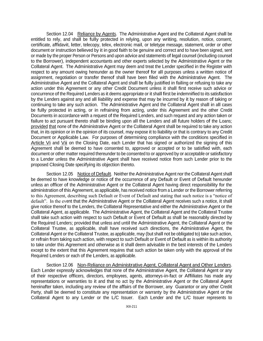 XII-211 Section 12.04 Reliance by Agents. The Administrative Agent and the Collateral Agent shall be entitled to rely, and shall be fully protected in relying, upon any writing, resolution, notice, consent, certificate, affidavit, letter, telecopy, telex, electronic mail, or teletype message, statement, order or other document or instruction believed by it in good faith to be genuine and correct and to have been signed, sent or made by the proper Person or Persons and upon advice and statements of legal counsel (including counsel to the Borrower), independent accountants and other experts selected by the Administrative Agent or the Collateral Agent. The Administrative Agent may deem and treat the Lender specified in the Register with respect to any amount owing hereunder as the owner thereof for all purposes unless a written notice of assignment, negotiation or transfer thereof shall have been filed with the Administrative Agent. The Administrative Agent and the Collateral Agent and shall be fully justified in failing or refusing to take any action under this Agreement or any other Credit Document unless it shall first receive such advice or concurrence of the Required Lenders as it deems appropriate or it shall first be indemnified to its satisfaction by the Lenders against any and all liability and expense that may be incurred by it by reason of taking or continuing to take any such action. The Administrative Agent and the Collateral Agent shall in all cases be fully protected in acting, or in refraining from acting, under this Agreement and the other Credit Documents in accordance with a request of the Required Lenders, and such request and any action taken or failure to act pursuant thereto shall be binding upon all the Lenders and all future holders of the Loans; provided that none of the Administrative Agent or the Collateral Agent shall be required to take any action that, in its opinion or in the opinion of its counsel, may expose it to liability or that is contrary to any Credit Document or Applicable Law. For purposes of determining compliance with the conditions specified in Article Vi and Vii on the Closing Date, each Lender that has signed or authorized the signing of this Agreement shall be deemed to have consented to, approved or accepted or to be satisfied with, each document or other matter required thereunder to be consented to or approved by or acceptable or satisfactory to a Lender unless the Administrative Agent shall have received notice from such Lender prior to the proposed Closing Date specifying its objection thereto. Section 12.05 Notice of Default. Neither the Administrative Agent nor the Collateral Agent shall be deemed to have knowledge or notice of the occurrence of any Default or Event of Default hereunder unless an officer of the Administrative Agent or the Collateral Agent having direct responsibility for the administration of this Agreement, as applicable, has received notice from a Lender or the Borrower referring to this Agreement, describing such Default or Event of Default and stating that such notice is a “notice of default”. In the event that the Administrative Agent or the Collateral Agent receives such a notice, it shall give notice thereof to the Lenders, the Collateral Representative and either the Administrative Agent or the Collateral Agent, as applicable. The Administrative Agent, the Collateral Agent and the Collateral Trustee shall take such action with respect to such Default or Event of Default as shall be reasonably directed by the Required Lenders; provided that unless and until the Administrative Agent, the Collateral Agent or the Collateral Trustee, as applicable, shall have received such directions, the Administrative Agent, the Collateral Agent or the Collateral Trustee, as applicable, may (but shall not be obligated to) take such action, or refrain from taking such action, with respect to such Default or Event of Default as is within its authority to take under this Agreement and otherwise as it shall deem advisable in the best interests of the Lenders except to the extent that this Agreement requires that such action be taken only with the approval of the Required Lenders or each of the Lenders, as applicable. Section 12.06 Non-Reliance on Administrative Agent, Collateral Agent and Other Lenders. Each Lender expressly acknowledges that none of the Administrative Agent, the Collateral Agent or any of their respective officers, directors, employees, agents, attorneys-in-fact or Affiliates has made any representations or warranties to it and that no act by the Administrative Agent or the Collateral Agent hereinafter taken, including any review of the affairs of the Borrower, any Guarantor or any other Credit Party, shall be deemed to constitute any representation or warranty by the Administrative Agent or the Collateral Agent to any Lender or the L/C Issuer. Each Lender and the L/C Issuer represents to