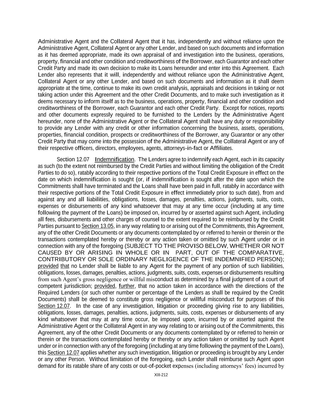 XII-212 Administrative Agent and the Collateral Agent that it has, independently and without reliance upon the Administrative Agent, Collateral Agent or any other Lender, and based on such documents and information as it has deemed appropriate, made its own appraisal of and investigation into the business, operations, property, financial and other condition and creditworthiness of the Borrower, each Guarantor and each other Credit Party and made its own decision to make its Loans hereunder and enter into this Agreement. Each Lender also represents that it will, independently and without reliance upon the Administrative Agent, Collateral Agent or any other Lender, and based on such documents and information as it shall deem appropriate at the time, continue to make its own credit analysis, appraisals and decisions in taking or not taking action under this Agreement and the other Credit Documents, and to make such investigation as it deems necessary to inform itself as to the business, operations, property, financial and other condition and creditworthiness of the Borrower, each Guarantor and each other Credit Party. Except for notices, reports and other documents expressly required to be furnished to the Lenders by the Administrative Agent hereunder, none of the Administrative Agent or the Collateral Agent shall have any duty or responsibility to provide any Lender with any credit or other information concerning the business, assets, operations, properties, financial condition, prospects or creditworthiness of the Borrower, any Guarantor or any other Credit Party that may come into the possession of the Administrative Agent, the Collateral Agent or any of their respective officers, directors, employees, agents, attorneys-in-fact or Affiliates. Section 12.07 Indemnification. The Lenders agree to indemnify each Agent, each in its capacity as such (to the extent not reimbursed by the Credit Parties and without limiting the obligation of the Credit Parties to do so), ratably according to their respective portions of the Total Credit Exposure in effect on the date on which indemnification is sought (or, if indemnification is sought after the date upon which the Commitments shall have terminated and the Loans shall have been paid in full, ratably in accordance with their respective portions of the Total Credit Exposure in effect immediately prior to such date), from and against any and all liabilities, obligations, losses, damages, penalties, actions, judgments, suits, costs, expenses or disbursements of any kind whatsoever that may at any time occur (including at any time following the payment of the Loans) be imposed on, incurred by or asserted against such Agent, including all fees, disbursements and other charges of counsel to the extent required to be reimbursed by the Credit Parties pursuant to Section 13.05, in any way relating to or arising out of the Commitments, this Agreement, any of the other Credit Documents or any documents contemplated by or referred to herein or therein or the transactions contemplated hereby or thereby or any action taken or omitted by such Agent under or in connection with any of the foregoing (SUBJECT TO THE PROVISO BELOW, WHETHER OR NOT CAUSED BY OR ARISING IN WHOLE OR IN PART, OUT OF THE COMPARATIVE, CONTRIBUTORY OR SOLE ORDINARY NEGLIGENCE OF THE INDEMNIFIED PERSON); provided that no Lender shall be liable to any Agent for the payment of any portion of such liabilities, obligations, losses, damages, penalties, actions, judgments, suits, costs, expenses or disbursements resulting from such Agent’s gross negligence or willful misconduct as determined by a final judgment of a court of competent jurisdiction; provided, further, that no action taken in accordance with the directions of the Required Lenders (or such other number or percentage of the Lenders as shall be required by the Credit Documents) shall be deemed to constitute gross negligence or willful misconduct for purposes of this Section 12.07. In the case of any investigation, litigation or proceeding giving rise to any liabilities, obligations, losses, damages, penalties, actions, judgments, suits, costs, expenses or disbursements of any kind whatsoever that may at any time occur, be imposed upon, incurred by or asserted against the Administrative Agent or the Collateral Agent in any way relating to or arising out of the Commitments, this Agreement, any of the other Credit Documents or any documents contemplated by or referred to herein or therein or the transactions contemplated hereby or thereby or any action taken or omitted by such Agent under or in connection with any of the foregoing (including at any time following the payment of the Loans), this Section 12.07 applies whether any such investigation, litigation or proceeding is brought by any Lender or any other Person. Without limitation of the foregoing, each Lender shall reimburse such Agent upon demand for its ratable share of any costs or out-of-pocket expenses (including attorneys’ fees) incurred by
