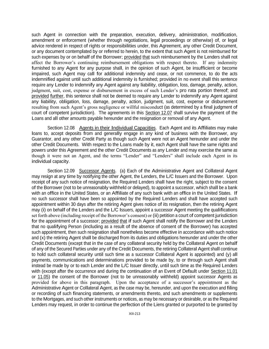 XII-213 such Agent in connection with the preparation, execution, delivery, administration, modification, amendment or enforcement (whether through negotiations, legal proceedings or otherwise) of, or legal advice rendered in respect of rights or responsibilities under, this Agreement, any other Credit Document, or any document contemplated by or referred to herein, to the extent that such Agent is not reimbursed for such expenses by or on behalf of the Borrower; provided that such reimbursement by the Lenders shall not affect the Borrower’s continuing reimbursement obligations with respect thereto. If any indemnity furnished to any Agent for any purpose shall, in the opinion of such Agent, be insufficient or become impaired, such Agent may call for additional indemnity and cease, or not commence, to do the acts indemnified against until such additional indemnity is furnished; provided in no event shall this sentence require any Lender to indemnify any Agent against any liability, obligation, loss, damage, penalty, action, judgment, suit, cost, expense or disbursement in excess of such Lender’s pro rata portion thereof; and provided further, this sentence shall not be deemed to require any Lender to indemnify any Agent against any liability, obligation, loss, damage, penalty, action, judgment, suit, cost, expense or disbursement resulting from such Agent’s gross negligence or willful misconduct (as determined by a final judgment of court of competent jurisdiction). The agreements in this Section 12.07 shall survive the payment of the Loans and all other amounts payable hereunder and the resignation or removal of any Agent. Section 12.08 Agents in their Individual Capacities. Each Agent and its Affiliates may make loans to, accept deposits from and generally engage in any kind of business with the Borrower, any Guarantor, and any other Credit Party as though such Agent were not an Agent hereunder and under the other Credit Documents. With respect to the Loans made by it, each Agent shall have the same rights and powers under this Agreement and the other Credit Documents as any Lender and may exercise the same as though it were not an Agent, and the terms “Lender” and “Lenders” shall include each Agent in its individual capacity. Section 12.09 Successor Agents. (a) Each of the Administrative Agent and Collateral Agent may resign at any time by notifying the other Agent, the Lenders, the L/C Issuers and the Borrower. Upon receipt of any such notice of resignation, the Required Lenders shall have the right, subject to the consent of the Borrower (not to be unreasonably withheld or delayed), to appoint a successor, which shall be a bank with an office in the United States, or an Affiliate of any such bank with an office in the United States. If no such successor shall have been so appointed by the Required Lenders and shall have accepted such appointment within 30 days after the retiring Agent gives notice of its resignation, then the retiring Agent may (i) on behalf of the Lenders and the L/C Issuers, appoint a successor Agent meeting the qualifications set forth above (including receipt of the Borrower’s consent) or (ii) petition a court of competent jurisdiction for the appointment of a successor; provided that if such Agent shall notify the Borrower and the Lenders that no qualifying Person (including as a result of the absence of consent of the Borrower) has accepted such appointment, then such resignation shall nonetheless become effective in accordance with such notice and (x) the retiring Agent shall be discharged from its duties and obligations hereunder and under the other Credit Documents (except that in the case of any collateral security held by the Collateral Agent on behalf of any of the Secured Parties under any of the Credit Documents, the retiring Collateral Agent shall continue to hold such collateral security until such time as a successor Collateral Agent is appointed) and (y) all payments, communications and determinations provided to be made by, to or through such Agent shall instead be made by or to each Lender and the L/C Issuer directly, until such time as the Required Lenders with (except after the occurrence and during the continuation of an Event of Default under Section 11.01 or 11.05) the consent of the Borrower (not to be unreasonably withheld) appoint successor Agents as provided for above in this paragraph. Upon the acceptance of a successor’s appointment as the Administrative Agent or Collateral Agent, as the case may be, hereunder, and upon the execution and filing or recording of such financing statements, or amendments thereto, and such amendments or supplements to the Mortgages, and such other instruments or notices, as may be necessary or desirable, or as the Required Lenders may request, in order to continue the perfection of the Liens granted or purported to be granted by