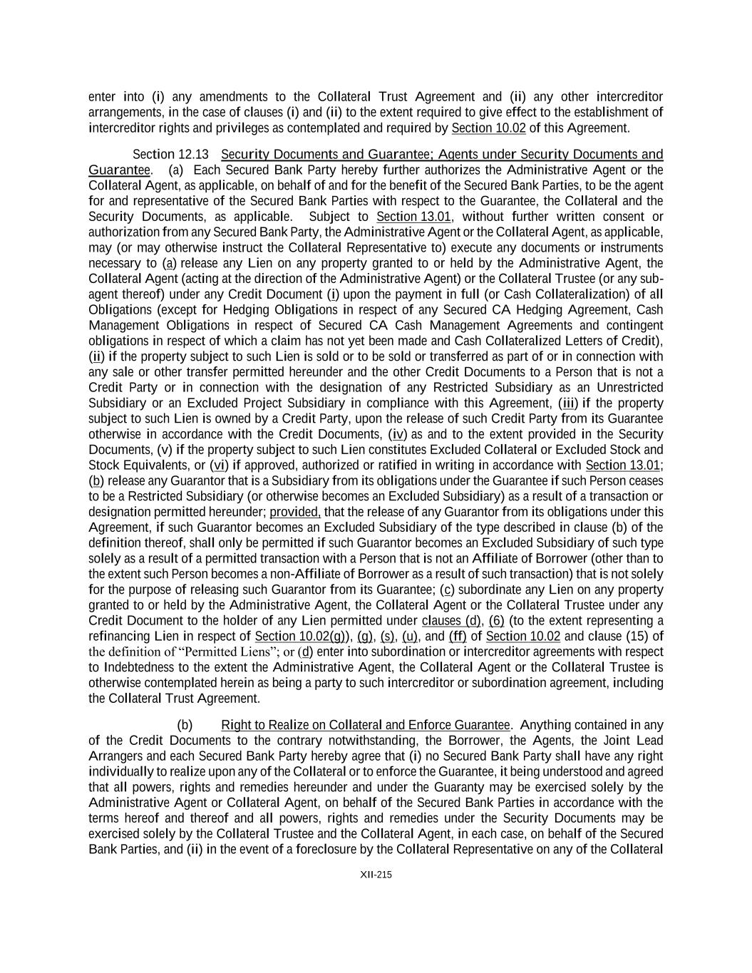 XII-215 enter into (i) any amendments to the Collateral Trust Agreement and (ii) any other intercreditor arrangements, in the case of clauses (i) and (ii) to the extent required to give effect to the establishment of intercreditor rights and privileges as contemplated and required by Section 10.02 of this Agreement. Section 12.13 Security Documents and Guarantee; Agents under Security Documents and Guarantee. (a) Each Secured Bank Party hereby further authorizes the Administrative Agent or the Collateral Agent, as applicable, on behalf of and for the benefit of the Secured Bank Parties, to be the agent for and representative of the Secured Bank Parties with respect to the Guarantee, the Collateral and the Security Documents, as applicable. Subject to Section 13.01, without further written consent or authorization from any Secured Bank Party, the Administrative Agent or the Collateral Agent, as applicable, may (or may otherwise instruct the Collateral Representative to) execute any documents or instruments necessary to (a) release any Lien on any property granted to or held by the Administrative Agent, the Collateral Agent (acting at the direction of the Administrative Agent) or the Collateral Trustee (or any sub- agent thereof) under any Credit Document (i) upon the payment in full (or Cash Collateralization) of all Obligations (except for Hedging Obligations in respect of any Secured CA Hedging Agreement, Cash Management Obligations in respect of Secured CA Cash Management Agreements and contingent obligations in respect of which a claim has not yet been made and Cash Collateralized Letters of Credit), (ii) if the property subject to such Lien is sold or to be sold or transferred as part of or in connection with any sale or other transfer permitted hereunder and the other Credit Documents to a Person that is not a Credit Party or in connection with the designation of any Restricted Subsidiary as an Unrestricted Subsidiary or an Excluded Project Subsidiary in compliance with this Agreement, (iii) if the property subject to such Lien is owned by a Credit Party, upon the release of such Credit Party from its Guarantee otherwise in accordance with the Credit Documents, (iv) as and to the extent provided in the Security Documents, (v) if the property subject to such Lien constitutes Excluded Collateral or Excluded Stock and Stock Equivalents, or (vi) if approved, authorized or ratified in writing in accordance with Section 13.01; (b) release any Guarantor that is a Subsidiary from its obligations under the Guarantee if such Person ceases to be a Restricted Subsidiary (or otherwise becomes an Excluded Subsidiary) as a result of a transaction or designation permitted hereunder; provided, that the release of any Guarantor from its obligations under this Agreement, if such Guarantor becomes an Excluded Subsidiary of the type described in clause (b) of the definition thereof, shall only be permitted if such Guarantor becomes an Excluded Subsidiary of such type solely as a result of a permitted transaction with a Person that is not an Affiliate of Borrower (other than to the extent such Person becomes a non-Affiliate of Borrower as a result of such transaction) that is not solely for the purpose of releasing such Guarantor from its Guarantee; (c) subordinate any Lien on any property granted to or held by the Administrative Agent, the Collateral Agent or the Collateral Trustee under any Credit Document to the holder of any Lien permitted under clauses (d), (6) (to the extent representing a refinancing Lien in respect of Section 10.02(g)), (g), (s), (u), and (ff) of Section 10.02 and clause (15) of the definition of “Permitted Liens”; or (d) enter into subordination or intercreditor agreements with respect to Indebtedness to the extent the Administrative Agent, the Collateral Agent or the Collateral Trustee is otherwise contemplated herein as being a party to such intercreditor or subordination agreement, including the Collateral Trust Agreement. (b) Right to Realize on Collateral and Enforce Guarantee. Anything contained in any of the Credit Documents to the contrary notwithstanding, the Borrower, the Agents, the Joint Lead Arrangers and each Secured Bank Party hereby agree that (i) no Secured Bank Party shall have any right individually to realize upon any of the Collateral or to enforce the Guarantee, it being understood and agreed that all powers, rights and remedies hereunder and under the Guaranty may be exercised solely by the Administrative Agent or Collateral Agent, on behalf of the Secured Bank Parties in accordance with the terms hereof and thereof and all powers, rights and remedies under the Security Documents may be exercised solely by the Collateral Trustee and the Collateral Agent, in each case, on behalf of the Secured Bank Parties, and (ii) in the event of a foreclosure by the Collateral Representative on any of the Collateral