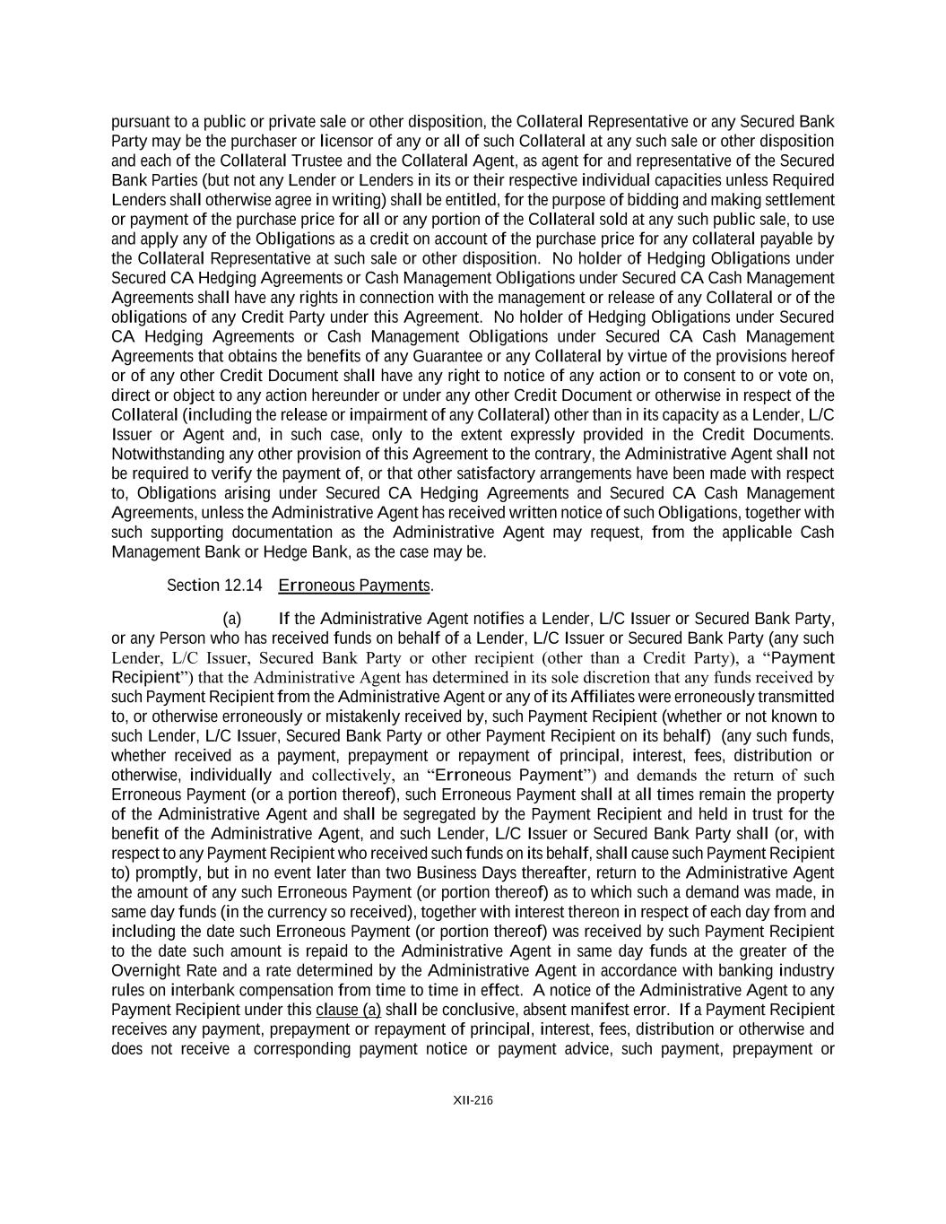 XII-216 pursuant to a public or private sale or other disposition, the Collateral Representative or any Secured Bank Party may be the purchaser or licensor of any or all of such Collateral at any such sale or other disposition and each of the Collateral Trustee and the Collateral Agent, as agent for and representative of the Secured Bank Parties (but not any Lender or Lenders in its or their respective individual capacities unless Required Lenders shall otherwise agree in writing) shall be entitled, for the purpose of bidding and making settlement or payment of the purchase price for all or any portion of the Collateral sold at any such public sale, to use and apply any of the Obligations as a credit on account of the purchase price for any collateral payable by the Collateral Representative at such sale or other disposition. No holder of Hedging Obligations under Secured CA Hedging Agreements or Cash Management Obligations under Secured CA Cash Management Agreements shall have any rights in connection with the management or release of any Collateral or of the obligations of any Credit Party under this Agreement. No holder of Hedging Obligations under Secured CA Hedging Agreements or Cash Management Obligations under Secured CA Cash Management Agreements that obtains the benefits of any Guarantee or any Collateral by virtue of the provisions hereof or of any other Credit Document shall have any right to notice of any action or to consent to or vote on, direct or object to any action hereunder or under any other Credit Document or otherwise in respect of the Collateral (including the release or impairment of any Collateral) other than in its capacity as a Lender, L/C Issuer or Agent and, in such case, only to the extent expressly provided in the Credit Documents. Notwithstanding any other provision of this Agreement to the contrary, the Administrative Agent shall not be required to verify the payment of, or that other satisfactory arrangements have been made with respect to, Obligations arising under Secured CA Hedging Agreements and Secured CA Cash Management Agreements, unless the Administrative Agent has received written notice of such Obligations, together with such supporting documentation as the Administrative Agent may request, from the applicable Cash Management Bank or Hedge Bank, as the case may be. Section 12.14 Erroneous Payments. (a) If the Administrative Agent notifies a Lender, L/C Issuer or Secured Bank Party, or any Person who has received funds on behalf of a Lender, L/C Issuer or Secured Bank Party (any such Lender, L/C Issuer, Secured Bank Party or other recipient (other than a Credit Party), a “Payment Recipient”) that the Administrative Agent has determined in its sole discretion that any funds received by such Payment Recipient from the Administrative Agent or any of its Affiliates were erroneously transmitted to, or otherwise erroneously or mistakenly received by, such Payment Recipient (whether or not known to such Lender, L/C Issuer, Secured Bank Party or other Payment Recipient on its behalf) (any such funds, whether received as a payment, prepayment or repayment of principal, interest, fees, distribution or otherwise, individually and collectively, an “Erroneous Payment”) and demands the return of such Erroneous Payment (or a portion thereof), such Erroneous Payment shall at all times remain the property of the Administrative Agent and shall be segregated by the Payment Recipient and held in trust for the benefit of the Administrative Agent, and such Lender, L/C Issuer or Secured Bank Party shall (or, with respect to any Payment Recipient who received such funds on its behalf, shall cause such Payment Recipient to) promptly, but in no event later than two Business Days thereafter, return to the Administrative Agent the amount of any such Erroneous Payment (or portion thereof) as to which such a demand was made, in same day funds (in the currency so received), together with interest thereon in respect of each day from and including the date such Erroneous Payment (or portion thereof) was received by such Payment Recipient to the date such amount is repaid to the Administrative Agent in same day funds at the greater of the Overnight Rate and a rate determined by the Administrative Agent in accordance with banking industry rules on interbank compensation from time to time in effect. A notice of the Administrative Agent to any Payment Recipient under this clause (a) shall be conclusive, absent manifest error. If a Payment Recipient receives any payment, prepayment or repayment of principal, interest, fees, distribution or otherwise and does not receive a corresponding payment notice or payment advice, such payment, prepayment or