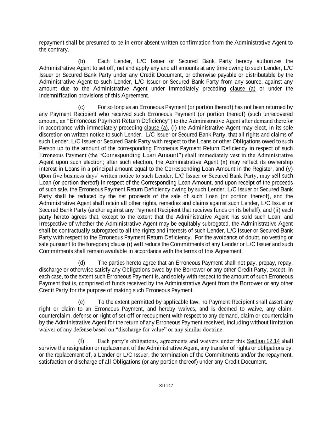 XII-217 repayment shall be presumed to be in error absent written confirmation from the Administrative Agent to the contrary. (b) Each Lender, L/C Issuer or Secured Bank Party hereby authorizes the Administrative Agent to set off, net and apply any and all amounts at any time owing to such Lender, L/C Issuer or Secured Bank Party under any Credit Document, or otherwise payable or distributable by the Administrative Agent to such Lender, L/C Issuer or Secured Bank Party from any source, against any amount due to the Administrative Agent under immediately preceding clause (a) or under the indemnification provisions of this Agreement. (c) For so long as an Erroneous Payment (or portion thereof) has not been returned by any Payment Recipient who received such Erroneous Payment (or portion thereof) (such unrecovered amount, an “Erroneous Payment Return Deficiency”) to the Administrative Agent after demand therefor in accordance with immediately preceding clause (a), (i) the Administrative Agent may elect, in its sole discretion on written notice to such Lender, L/C Issuer or Secured Bank Party, that all rights and claims of such Lender, L/C Issuer or Secured Bank Party with respect to the Loans or other Obligations owed to such Person up to the amount of the corresponding Erroneous Payment Return Deficiency in respect of such Erroneous Payment (the “Corresponding Loan Amount”) shall immediately vest in the Administrative Agent upon such election; after such election, the Administrative Agent (x) may reflect its ownership interest in Loans in a principal amount equal to the Corresponding Loan Amount in the Register, and (y) upon five business days’ written notice to such Lender, L/C Issuer or Secured Bank Party, may sell such Loan (or portion thereof) in respect of the Corresponding Loan Amount, and upon receipt of the proceeds of such sale, the Erroneous Payment Return Deficiency owing by such Lender, L/C Issuer or Secured Bank Party shall be reduced by the net proceeds of the sale of such Loan (or portion thereof), and the Administrative Agent shall retain all other rights, remedies and claims against such Lender, L/C Issuer or Secured Bank Party (and/or against any Payment Recipient that receives funds on its behalf), and (ii) each party hereto agrees that, except to the extent that the Administrative Agent has sold such Loan, and irrespective of whether the Administrative Agent may be equitably subrogated, the Administrative Agent shall be contractually subrogated to all the rights and interests of such Lender, L/C Issuer or Secured Bank Party with respect to the Erroneous Payment Return Deficiency. For the avoidance of doubt, no vesting or sale pursuant to the foregoing clause (i) will reduce the Commitments of any Lender or L/C Issuer and such Commitments shall remain available in accordance with the terms of this Agreement. (d) The parties hereto agree that an Erroneous Payment shall not pay, prepay, repay, discharge or otherwise satisfy any Obligations owed by the Borrower or any other Credit Party, except, in each case, to the extent such Erroneous Payment is, and solely with respect to the amount of such Erroneous Payment that is, comprised of funds received by the Administrative Agent from the Borrower or any other Credit Party for the purpose of making such Erroneous Payment. (e) To the extent permitted by applicable law, no Payment Recipient shall assert any right or claim to an Erroneous Payment, and hereby waives, and is deemed to waive, any claim, counterclaim, defense or right of set-off or recoupment with respect to any demand, claim or counterclaim by the Administrative Agent for the return of any Erroneous Payment received, including without limitation waiver of any defense based on “discharge for value” or any similar doctrine. (f) Each party’s obligations, agreements and waivers under this Section 12.14 shall survive the resignation or replacement of the Administrative Agent, any transfer of rights or obligations by, or the replacement of, a Lender or L/C Issuer, the termination of the Commitments and/or the repayment, satisfaction or discharge of all Obligations (or any portion thereof) under any Credit Document.