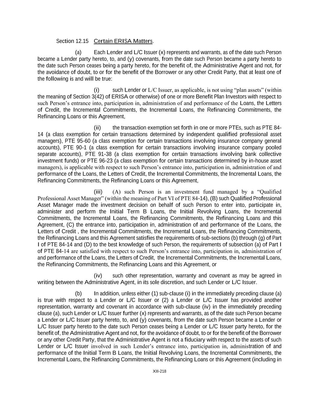 XII-218 Section 12.15 Certain ERISA Matters. (a) Each Lender and L/C Issuer (x) represents and warrants, as of the date such Person became a Lender party hereto, to, and (y) covenants, from the date such Person became a party hereto to the date such Person ceases being a party hereto, for the benefit of, the Administrative Agent and not, for the avoidance of doubt, to or for the benefit of the Borrower or any other Credit Party, that at least one of the following is and will be true: (i) such Lender or L/C Issuer, as applicable, is not using “plan assets” (within the meaning of Section 3(42) of ERISA or otherwise) of one or more Benefit Plan Investors with respect to such Person’s entrance into, participation in, administration of and performance of the Loans, the Letters of Credit, the Incremental Commitments, the Incremental Loans, the Refinancing Commitments, the Refinancing Loans or this Agreement, (ii) the transaction exemption set forth in one or more PTEs, such as PTE 84- 14 (a class exemption for certain transactions determined by independent qualified professional asset managers), PTE 95-60 (a class exemption for certain transactions involving insurance company general accounts), PTE 90-1 (a class exemption for certain transactions involving insurance company pooled separate accounts), PTE 91-38 (a class exemption for certain transactions involving bank collective investment funds) or PTE 96-23 (a class exemption for certain transactions determined by in-house asset managers), is applicable with respect to such Person’s entrance into, participation in, administration of and performance of the Loans, the Letters of Credit, the Incremental Commitments, the Incremental Loans, the Refinancing Commitments, the Refinancing Loans or this Agreement, (iii) (A) such Person is an investment fund managed by a “Qualified Professional Asset Manager” (within the meaning of Part VI of PTE 84-14), (B) such Qualified Professional Asset Manager made the investment decision on behalf of such Person to enter into, participate in, administer and perform the Initial Term B Loans, the Initial Revolving Loans, the Incremental Commitments, the Incremental Loans, the Refinancing Commitments, the Refinancing Loans and this Agreement, (C) the entrance into, participation in, administration of and performance of the Loans, the Letters of Credit , the Incremental Commitments, the Incremental Loans, the Refinancing Commitments, the Refinancing Loans and this Agreement satisfies the requirements of sub-sections (b) through (g) of Part I of PTE 84-14 and (D) to the best knowledge of such Person, the requirements of subsection (a) of Part I of PTE 84-14 are satisfied with respect to such Person’s entrance into, participation in, administration of and performance of the Loans, the Letters of Credit, the Incremental Commitments, the Incremental Loans, the Refinancing Commitments, the Refinancing Loans and this Agreement, or (iv) such other representation, warranty and covenant as may be agreed in writing between the Administrative Agent, in its sole discretion, and such Lender or L/C Issuer. (b) In addition, unless either (1) sub-clause (i) in the immediately preceding clause (a) is true with respect to a Lender or L/C Issuer or (2) a Lender or L/C Issuer has provided another representation, warranty and covenant in accordance with sub-clause (iv) in the immediately preceding clause (a), such Lender or L/C Issuer further (x) represents and warrants, as of the date such Person became a Lender or L/C Issuer party hereto, to, and (y) covenants, from the date such Person became a Lender or L/C Issuer party hereto to the date such Person ceases being a Lender or L/C Issuer party hereto, for the benefit of, the Administrative Agent and not, for the avoidance of doubt, to or for the benefit of the Borrower or any other Credit Party, that the Administrative Agent is not a fiduciary with respect to the assets of such Lender or L/C Issuer involved in such Lender’s entrance into, participation in, administration of and performance of the Initial Term B Loans, the Initial Revolving Loans, the Incremental Commitments, the Incremental Loans, the Refinancing Commitments, the Refinancing Loans or this Agreement (including in