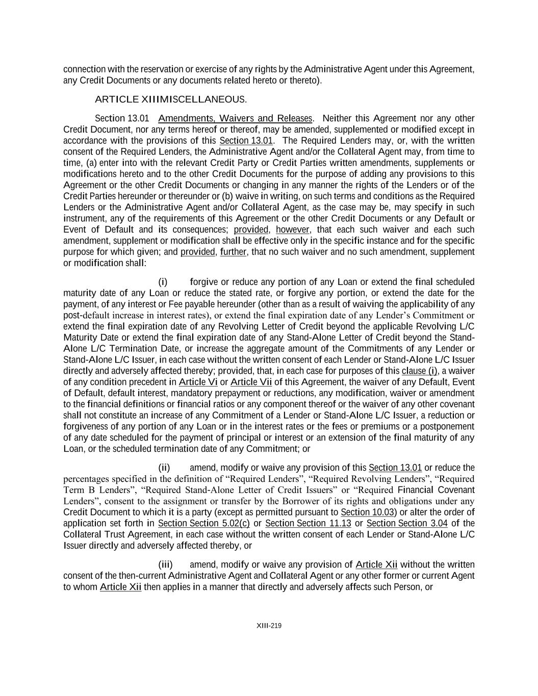 XIII-219 connection with the reservation or exercise of any rights by the Administrative Agent under this Agreement, any Credit Documents or any documents related hereto or thereto). ARTICLE XIIIMISCELLANEOUS. Section 13.01 Amendments, Waivers and Releases. Neither this Agreement nor any other Credit Document, nor any terms hereof or thereof, may be amended, supplemented or modified except in accordance with the provisions of this Section 13.01. The Required Lenders may, or, with the written consent of the Required Lenders, the Administrative Agent and/or the Collateral Agent may, from time to time, (a) enter into with the relevant Credit Party or Credit Parties written amendments, supplements or modifications hereto and to the other Credit Documents for the purpose of adding any provisions to this Agreement or the other Credit Documents or changing in any manner the rights of the Lenders or of the Credit Parties hereunder or thereunder or (b) waive in writing, on such terms and conditions as the Required Lenders or the Administrative Agent and/or Collateral Agent, as the case may be, may specify in such instrument, any of the requirements of this Agreement or the other Credit Documents or any Default or Event of Default and its consequences; provided, however, that each such waiver and each such amendment, supplement or modification shall be effective only in the specific instance and for the specific purpose for which given; and provided, further, that no such waiver and no such amendment, supplement or modification shall: (i) forgive or reduce any portion of any Loan or extend the final scheduled maturity date of any Loan or reduce the stated rate, or forgive any portion, or extend the date for the payment, of any interest or Fee payable hereunder (other than as a result of waiving the applicability of any post-default increase in interest rates), or extend the final expiration date of any Lender’s Commitment or extend the final expiration date of any Revolving Letter of Credit beyond the applicable Revolving L/C Maturity Date or extend the final expiration date of any Stand-Alone Letter of Credit beyond the Stand- Alone L/C Termination Date, or increase the aggregate amount of the Commitments of any Lender or Stand-Alone L/C Issuer, in each case without the written consent of each Lender or Stand-Alone L/C Issuer directly and adversely affected thereby; provided, that, in each case for purposes of this clause (i), a waiver of any condition precedent in Article Vi or Article Vii of this Agreement, the waiver of any Default, Event of Default, default interest, mandatory prepayment or reductions, any modification, waiver or amendment to the financial definitions or financial ratios or any component thereof or the waiver of any other covenant shall not constitute an increase of any Commitment of a Lender or Stand-Alone L/C Issuer, a reduction or forgiveness of any portion of any Loan or in the interest rates or the fees or premiums or a postponement of any date scheduled for the payment of principal or interest or an extension of the final maturity of any Loan, or the scheduled termination date of any Commitment; or (ii) amend, modify or waive any provision of this Section 13.01 or reduce the percentages specified in the definition of “Required Lenders”, “Required Revolving Lenders”, “Required Term B Lenders”, “Required Stand-Alone Letter of Credit Issuers” or “Required Financial Covenant Lenders”, consent to the assignment or transfer by the Borrower of its rights and obligations under any Credit Document to which it is a party (except as permitted pursuant to Section 10.03) or alter the order of application set forth in Section Section 5.02(c) or Section Section 11.13 or Section Section 3.04 of the Collateral Trust Agreement, in each case without the written consent of each Lender or Stand-Alone L/C Issuer directly and adversely affected thereby, or (iii) amend, modify or waive any provision of Article Xii without the written consent of the then-current Administrative Agent and Collateral Agent or any other former or current Agent to whom Article Xii then applies in a manner that directly and adversely affects such Person, or