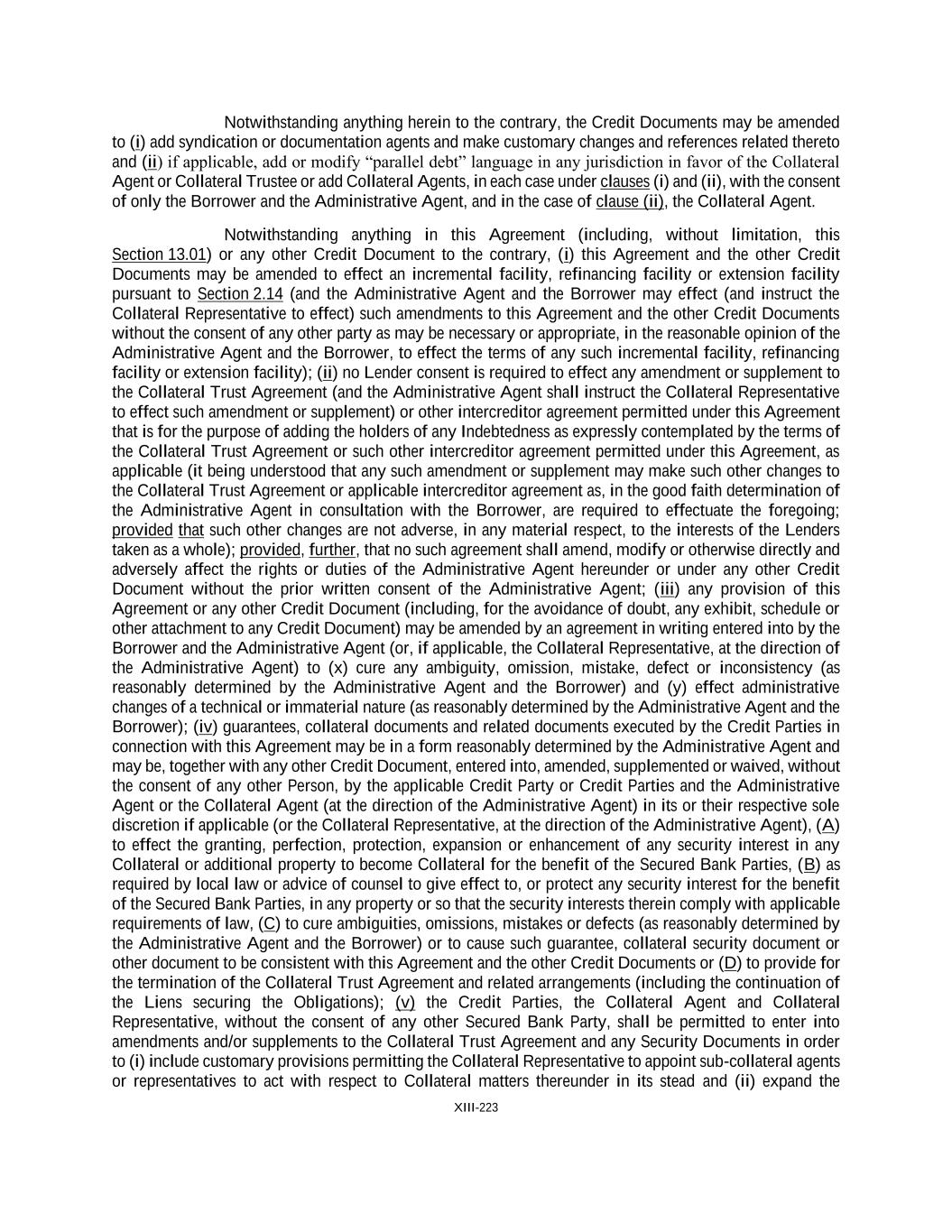 XIII-223 Notwithstanding anything herein to the contrary, the Credit Documents may be amended to (i) add syndication or documentation agents and make customary changes and references related thereto and (ii) if applicable, add or modify “parallel debt” language in any jurisdiction in favor of the Collateral Agent or Collateral Trustee or add Collateral Agents, in each case under clauses (i) and (ii), with the consent of only the Borrower and the Administrative Agent, and in the case of clause (ii), the Collateral Agent. Notwithstanding anything in this Agreement (including, without limitation, this Section 13.01) or any other Credit Document to the contrary, (i) this Agreement and the other Credit Documents may be amended to effect an incremental facility, refinancing facility or extension facility pursuant to Section 2.14 (and the Administrative Agent and the Borrower may effect (and instruct the Collateral Representative to effect) such amendments to this Agreement and the other Credit Documents without the consent of any other party as may be necessary or appropriate, in the reasonable opinion of the Administrative Agent and the Borrower, to effect the terms of any such incremental facility, refinancing facility or extension facility); (ii) no Lender consent is required to effect any amendment or supplement to the Collateral Trust Agreement (and the Administrative Agent shall instruct the Collateral Representative to effect such amendment or supplement) or other intercreditor agreement permitted under this Agreement that is for the purpose of adding the holders of any Indebtedness as expressly contemplated by the terms of the Collateral Trust Agreement or such other intercreditor agreement permitted under this Agreement, as applicable (it being understood that any such amendment or supplement may make such other changes to the Collateral Trust Agreement or applicable intercreditor agreement as, in the good faith determination of the Administrative Agent in consultation with the Borrower, are required to effectuate the foregoing; provided that such other changes are not adverse, in any material respect, to the interests of the Lenders taken as a whole); provided, further, that no such agreement shall amend, modify or otherwise directly and adversely affect the rights or duties of the Administrative Agent hereunder or under any other Credit Document without the prior written consent of the Administrative Agent; (iii) any provision of this Agreement or any other Credit Document (including, for the avoidance of doubt, any exhibit, schedule or other attachment to any Credit Document) may be amended by an agreement in writing entered into by the Borrower and the Administrative Agent (or, if applicable, the Collateral Representative, at the direction of the Administrative Agent) to (x) cure any ambiguity, omission, mistake, defect or inconsistency (as reasonably determined by the Administrative Agent and the Borrower) and (y) effect administrative changes of a technical or immaterial nature (as reasonably determined by the Administrative Agent and the Borrower); (iv) guarantees, collateral documents and related documents executed by the Credit Parties in connection with this Agreement may be in a form reasonably determined by the Administrative Agent and may be, together with any other Credit Document, entered into, amended, supplemented or waived, without the consent of any other Person, by the applicable Credit Party or Credit Parties and the Administrative Agent or the Collateral Agent (at the direction of the Administrative Agent) in its or their respective sole discretion if applicable (or the Collateral Representative, at the direction of the Administrative Agent), (A) to effect the granting, perfection, protection, expansion or enhancement of any security interest in any Collateral or additional property to become Collateral for the benefit of the Secured Bank Parties, (B) as required by local law or advice of counsel to give effect to, or protect any security interest for the benefit of the Secured Bank Parties, in any property or so that the security interests therein comply with applicable requirements of law, (C) to cure ambiguities, omissions, mistakes or defects (as reasonably determined by the Administrative Agent and the Borrower) or to cause such guarantee, collateral security document or other document to be consistent with this Agreement and the other Credit Documents or (D) to provide for the termination of the Collateral Trust Agreement and related arrangements (including the continuation of the Liens securing the Obligations); (v) the Credit Parties, the Collateral Agent and Collateral Representative, without the consent of any other Secured Bank Party, shall be permitted to enter into amendments and/or supplements to the Collateral Trust Agreement and any Security Documents in order to (i) include customary provisions permitting the Collateral Representative to appoint sub-collateral agents or representatives to act with respect to Collateral matters thereunder in its stead and (ii) expand the