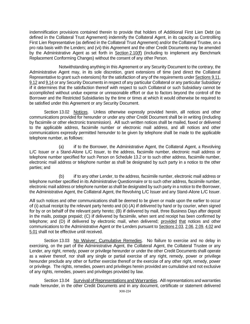 XIII-224 indemnification provisions contained therein to provide that holders of Additional First Lien Debt (as defined in the Collateral Trust Agreement) indemnify the Collateral Agent, in its capacity as Controlling First Lien Representative (as defined in the Collateral Trust Agreement) and/or the Collateral Trustee, on a pro rata basis with the Lenders; and (vi) this Agreement and the other Credit Documents may be amended by the Administrative Agent as set forth in Section 2.10(f) (including to implement any Benchmark Replacement Conforming Changes) without the consent of any other Person. Notwithstanding anything in this Agreement or any Security Document to the contrary, the Administrative Agent may, in its sole discretion, grant extensions of time (and direct the Collateral Representative to grant such extensions) for the satisfaction of any of the requirements under Sections 9.11, 9.12 and 9.14 or any Security Documents in respect of any particular Collateral or any particular Subsidiary if it determines that the satisfaction thereof with respect to such Collateral or such Subsidiary cannot be accomplished without undue expense or unreasonable effort or due to factors beyond the control of the Borrower and the Restricted Subsidiaries by the time or times at which it would otherwise be required to be satisfied under this Agreement or any Security Document. Section 13.02 Notices. Unless otherwise expressly provided herein, all notices and other communications provided for hereunder or under any other Credit Document shall be in writing (including by facsimile or other electronic transmission). All such written notices shall be mailed, faxed or delivered to the applicable address, facsimile number or electronic mail address, and all notices and other communications expressly permitted hereunder to be given by telephone shall be made to the applicable telephone number, as follows: (a) if to the Borrower, the Administrative Agent, the Collateral Agent, a Revolving L/C Issuer or a Stand-Alone L/C Issuer, to the address, facsimile number, electronic mail address or telephone number specified for such Person on Schedule 13.2 or to such other address, facsimile number, electronic mail address or telephone number as shall be designated by such party in a notice to the other parties; and (b) if to any other Lender, to the address, facsimile number, electronic mail address or telephone number specified in its Administrative Questionnaire or to such other address, facsimile number, electronic mail address or telephone number as shall be designated by such party in a notice to the Borrower, the Administrative Agent, the Collateral Agent, the Revolving L/C Issuer and any Stand-Alone L/C Issuer. All such notices and other communications shall be deemed to be given or made upon the earlier to occur of (i) actual receipt by the relevant party hereto and (ii) (A) if delivered by hand or by courier, when signed for by or on behalf of the relevant party hereto; (B) if delivered by mail, three Business Days after deposit in the mails, postage prepaid; (C) if delivered by facsimile, when sent and receipt has been confirmed by telephone; and (D) if delivered by electronic mail, when delivered; provided that notices and other communications to the Administrative Agent or the Lenders pursuant to Sections 2.03, 2.06, 2.09, 4.02 and 5.01 shall not be effective until received. Section 13.03 No Waiver; Cumulative Remedies. No failure to exercise and no delay in exercising, on the part of the Administrative Agent, the Collateral Agent, the Collateral Trustee or any Lender, any right, remedy, power or privilege hereunder or under the other Credit Documents shall operate as a waiver thereof, nor shall any single or partial exercise of any right, remedy, power or privilege hereunder preclude any other or further exercise thereof or the exercise of any other right, remedy, power or privilege. The rights, remedies, powers and privileges herein provided are cumulative and not exclusive of any rights, remedies, powers and privileges provided by law. Section 13.04 Survival of Representations and Warranties. All representations and warranties made hereunder, in the other Credit Documents and in any document, certificate or statement delivered