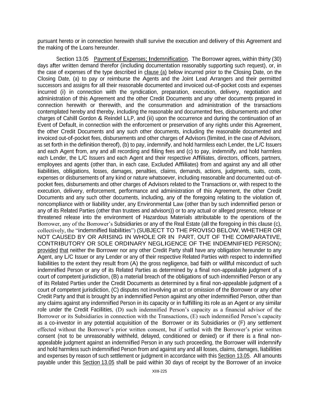 XIII-225 pursuant hereto or in connection herewith shall survive the execution and delivery of this Agreement and the making of the Loans hereunder. Section 13.05 Payment of Expenses; Indemnification. The Borrower agrees, within thirty (30) days after written demand therefor (including documentation reasonably supporting such request), or, in the case of expenses of the type described in clause (a) below incurred prior to the Closing Date, on the Closing Date, (a) to pay or reimburse the Agents and the Joint Lead Arrangers and their permitted successors and assigns for all their reasonable documented and invoiced out-of-pocket costs and expenses incurred (i) in connection with the syndication, preparation, execution, delivery, negotiation and administration of this Agreement and the other Credit Documents and any other documents prepared in connection herewith or therewith, and the consummation and administration of the transactions contemplated hereby and thereby, including the reasonable and documented fees, disbursements and other charges of Cahill Gordon & Reindel LLP, and (ii) upon the occurrence and during the continuation of an Event of Default, in connection with the enforcement or preservation of any rights under this Agreement, the other Credit Documents and any such other documents, including the reasonable documented and invoiced out-of-pocket fees, disbursements and other charges of Advisors (limited, in the case of Advisors, as set forth in the definition thereof), (b) to pay, indemnify, and hold harmless each Lender, the L/C Issuers and each Agent from, any and all recording and filing fees and (c) to pay, indemnify, and hold harmless each Lender, the L/C Issuers and each Agent and their respective Affiliates, directors, officers, partners, employees and agents (other than, in each case, Excluded Affiliates) from and against any and all other liabilities, obligations, losses, damages, penalties, claims, demands, actions, judgments, suits, costs, expenses or disbursements of any kind or nature whatsoever, including reasonable and documented out-of- pocket fees, disbursements and other charges of Advisors related to the Transactions or, with respect to the execution, delivery, enforcement, performance and administration of this Agreement, the other Credit Documents and any such other documents, including, any of the foregoing relating to the violation of, noncompliance with or liability under, any Environmental Law (other than by such indemnified person or any of its Related Parties (other than trustees and advisors)) or to any actual or alleged presence, release or threatened release into the environment of Hazardous Materials attributable to the operations of the Borrower, any of the Borrower’s Subsidiaries or any of the Real Estate (all the foregoing in this clause (c), collectively, the “indemnified liabilities”) (SUBJECT TO THE PROVISO BELOW, WHETHER OR NOT CAUSED BY OR ARISING IN WHOLE OR IN PART, OUT OF THE COMPARATIVE, CONTRIBUTORY OR SOLE ORDINARY NEGLIGENCE OF THE INDEMNIFIED PERSON); provided that neither the Borrower nor any other Credit Party shall have any obligation hereunder to any Agent, any L/C Issuer or any Lender or any of their respective Related Parties with respect to indemnified liabilities to the extent they result from (A) the gross negligence, bad faith or willful misconduct of such indemnified Person or any of its Related Parties as determined by a final non-appealable judgment of a court of competent jurisdiction, (B) a material breach of the obligations of such indemnified Person or any of its Related Parties under the Credit Documents as determined by a final non-appealable judgment of a court of competent jurisdiction, (C) disputes not involving an act or omission of the Borrower or any other Credit Party and that is brought by an indemnified Person against any other indemnified Person, other than any claims against any indemnified Person in its capacity or in fulfilling its role as an Agent or any similar role under the Credit Facilities, (D) such indemnified Person’s capacity as a financial advisor of the Borrower or its Subsidiaries in connection with the Transactions, (E) such indemnified Person’s capacity as a co-investor in any potential acquisition of the Borrower or its Subsidiaries or (F) any settlement effected without the Borrower’s prior written consent, but if settled with the Borrower’s prior written consent (not to be unreasonably withheld, delayed, conditioned or denied) or if there is a final non- appealable judgment against an indemnified Person in any such proceeding, the Borrower will indemnify and hold harmless such indemnified Person from and against any and all losses, claims, damages, liabilities and expenses by reason of such settlement or judgment in accordance with this Section 13.05. All amounts payable under this Section 13.05 shall be paid within 30 days of receipt by the Borrower of an invoice