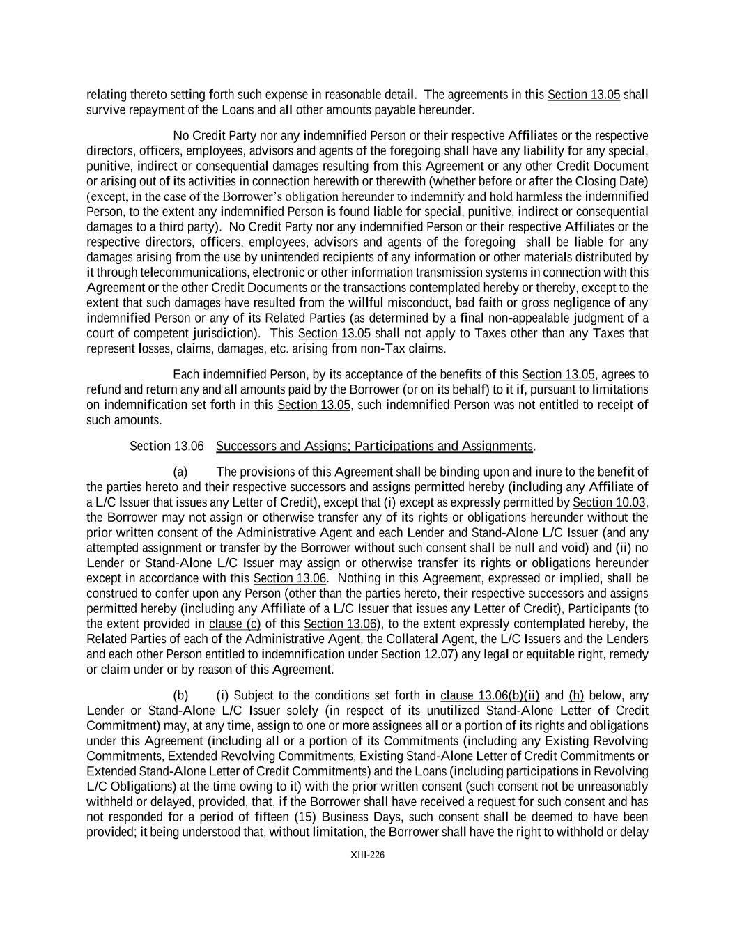 XIII-226 relating thereto setting forth such expense in reasonable detail. The agreements in this Section 13.05 shall survive repayment of the Loans and all other amounts payable hereunder. No Credit Party nor any indemnified Person or their respective Affiliates or the respective directors, officers, employees, advisors and agents of the foregoing shall have any liability for any special, punitive, indirect or consequential damages resulting from this Agreement or any other Credit Document or arising out of its activities in connection herewith or therewith (whether before or after the Closing Date) (except, in the case of the Borrower’s obligation hereunder to indemnify and hold harmless the indemnified Person, to the extent any indemnified Person is found liable for special, punitive, indirect or consequential damages to a third party). No Credit Party nor any indemnified Person or their respective Affiliates or the respective directors, officers, employees, advisors and agents of the foregoing shall be liable for any damages arising from the use by unintended recipients of any information or other materials distributed by it through telecommunications, electronic or other information transmission systems in connection with this Agreement or the other Credit Documents or the transactions contemplated hereby or thereby, except to the extent that such damages have resulted from the willful misconduct, bad faith or gross negligence of any indemnified Person or any of its Related Parties (as determined by a final non-appealable judgment of a court of competent jurisdiction). This Section 13.05 shall not apply to Taxes other than any Taxes that represent losses, claims, damages, etc. arising from non-Tax claims. Each indemnified Person, by its acceptance of the benefits of this Section 13.05, agrees to refund and return any and all amounts paid by the Borrower (or on its behalf) to it if, pursuant to limitations on indemnification set forth in this Section 13.05, such indemnified Person was not entitled to receipt of such amounts. Section 13.06 Successors and Assigns; Participations and Assignments. (a) The provisions of this Agreement shall be binding upon and inure to the benefit of the parties hereto and their respective successors and assigns permitted hereby (including any Affiliate of a L/C Issuer that issues any Letter of Credit), except that (i) except as expressly permitted by Section 10.03, the Borrower may not assign or otherwise transfer any of its rights or obligations hereunder without the prior written consent of the Administrative Agent and each Lender and Stand-Alone L/C Issuer (and any attempted assignment or transfer by the Borrower without such consent shall be null and void) and (ii) no Lender or Stand-Alone L/C Issuer may assign or otherwise transfer its rights or obligations hereunder except in accordance with this Section 13.06. Nothing in this Agreement, expressed or implied, shall be construed to confer upon any Person (other than the parties hereto, their respective successors and assigns permitted hereby (including any Affiliate of a L/C Issuer that issues any Letter of Credit), Participants (to the extent provided in clause (c) of this Section 13.06), to the extent expressly contemplated hereby, the Related Parties of each of the Administrative Agent, the Collateral Agent, the L/C Issuers and the Lenders and each other Person entitled to indemnification under Section 12.07) any legal or equitable right, remedy or claim under or by reason of this Agreement. (b) (i) Subject to the conditions set forth in clause 13.06(b)(ii) and (h) below, any Lender or Stand-Alone L/C Issuer solely (in respect of its unutilized Stand-Alone Letter of Credit Commitment) may, at any time, assign to one or more assignees all or a portion of its rights and obligations under this Agreement (including all or a portion of its Commitments (including any Existing Revolving Commitments, Extended Revolving Commitments, Existing Stand-Alone Letter of Credit Commitments or Extended Stand-Alone Letter of Credit Commitments) and the Loans (including participations in Revolving L/C Obligations) at the time owing to it) with the prior written consent (such consent not be unreasonably withheld or delayed, provided, that, if the Borrower shall have received a request for such consent and has not responded for a period of fifteen (15) Business Days, such consent shall be deemed to have been provided; it being understood that, without limitation, the Borrower shall have the right to withhold or delay