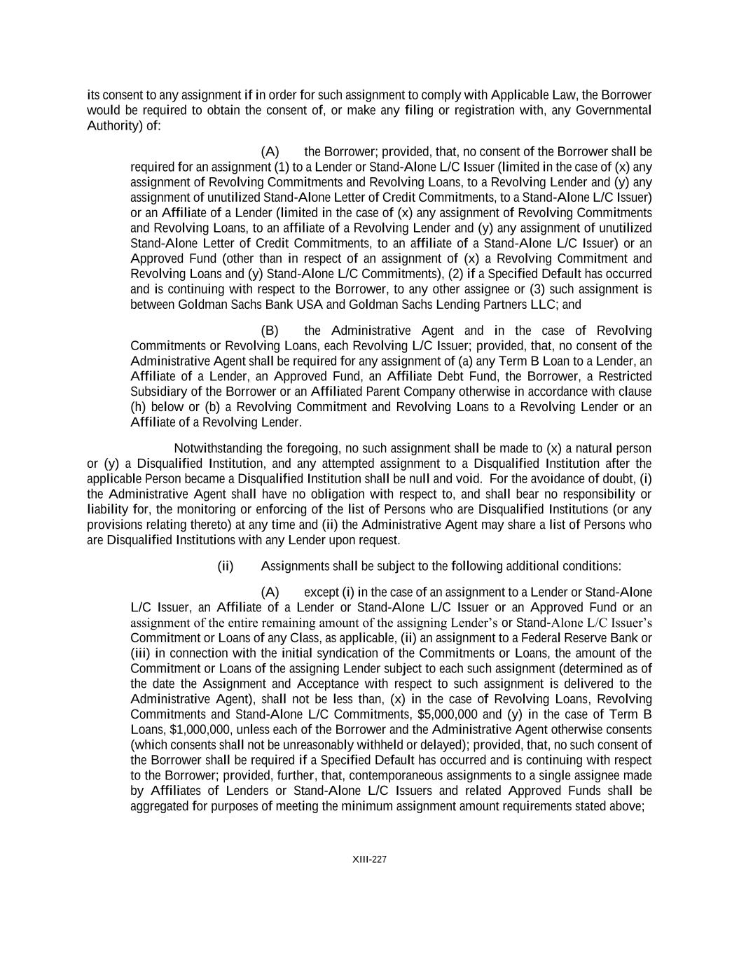 XIII-227 its consent to any assignment if in order for such assignment to comply with Applicable Law, the Borrower would be required to obtain the consent of, or make any filing or registration with, any Governmental Authority) of: (A) the Borrower; provided, that, no consent of the Borrower shall be required for an assignment (1) to a Lender or Stand-Alone L/C Issuer (limited in the case of (x) any assignment of Revolving Commitments and Revolving Loans, to a Revolving Lender and (y) any assignment of unutilized Stand-Alone Letter of Credit Commitments, to a Stand-Alone L/C Issuer) or an Affiliate of a Lender (limited in the case of (x) any assignment of Revolving Commitments and Revolving Loans, to an affiliate of a Revolving Lender and (y) any assignment of unutilized Stand-Alone Letter of Credit Commitments, to an affiliate of a Stand-Alone L/C Issuer) or an Approved Fund (other than in respect of an assignment of (x) a Revolving Commitment and Revolving Loans and (y) Stand-Alone L/C Commitments), (2) if a Specified Default has occurred and is continuing with respect to the Borrower, to any other assignee or (3) such assignment is between Goldman Sachs Bank USA and Goldman Sachs Lending Partners LLC; and (B) the Administrative Agent and in the case of Revolving Commitments or Revolving Loans, each Revolving L/C Issuer; provided, that, no consent of the Administrative Agent shall be required for any assignment of (a) any Term B Loan to a Lender, an Affiliate of a Lender, an Approved Fund, an Affiliate Debt Fund, the Borrower, a Restricted Subsidiary of the Borrower or an Affiliated Parent Company otherwise in accordance with clause (h) below or (b) a Revolving Commitment and Revolving Loans to a Revolving Lender or an Affiliate of a Revolving Lender. Notwithstanding the foregoing, no such assignment shall be made to (x) a natural person or (y) a Disqualified Institution, and any attempted assignment to a Disqualified Institution after the applicable Person became a Disqualified Institution shall be null and void. For the avoidance of doubt, (i) the Administrative Agent shall have no obligation with respect to, and shall bear no responsibility or liability for, the monitoring or enforcing of the list of Persons who are Disqualified Institutions (or any provisions relating thereto) at any time and (ii) the Administrative Agent may share a list of Persons who are Disqualified Institutions with any Lender upon request. (ii) Assignments shall be subject to the following additional conditions: (A) except (i) in the case of an assignment to a Lender or Stand-Alone L/C Issuer, an Affiliate of a Lender or Stand-Alone L/C Issuer or an Approved Fund or an assignment of the entire remaining amount of the assigning Lender’s or Stand-Alone L/C Issuer’s Commitment or Loans of any Class, as applicable, (ii) an assignment to a Federal Reserve Bank or (iii) in connection with the initial syndication of the Commitments or Loans, the amount of the Commitment or Loans of the assigning Lender subject to each such assignment (determined as of the date the Assignment and Acceptance with respect to such assignment is delivered to the Administrative Agent), shall not be less than, (x) in the case of Revolving Loans, Revolving Commitments and Stand-Alone L/C Commitments, $5,000,000 and (y) in the case of Term B Loans, $1,000,000, unless each of the Borrower and the Administrative Agent otherwise consents (which consents shall not be unreasonably withheld or delayed); provided, that, no such consent of the Borrower shall be required if a Specified Default has occurred and is continuing with respect to the Borrower; provided, further, that, contemporaneous assignments to a single assignee made by Affiliates of Lenders or Stand-Alone L/C Issuers and related Approved Funds shall be aggregated for purposes of meeting the minimum assignment amount requirements stated above;