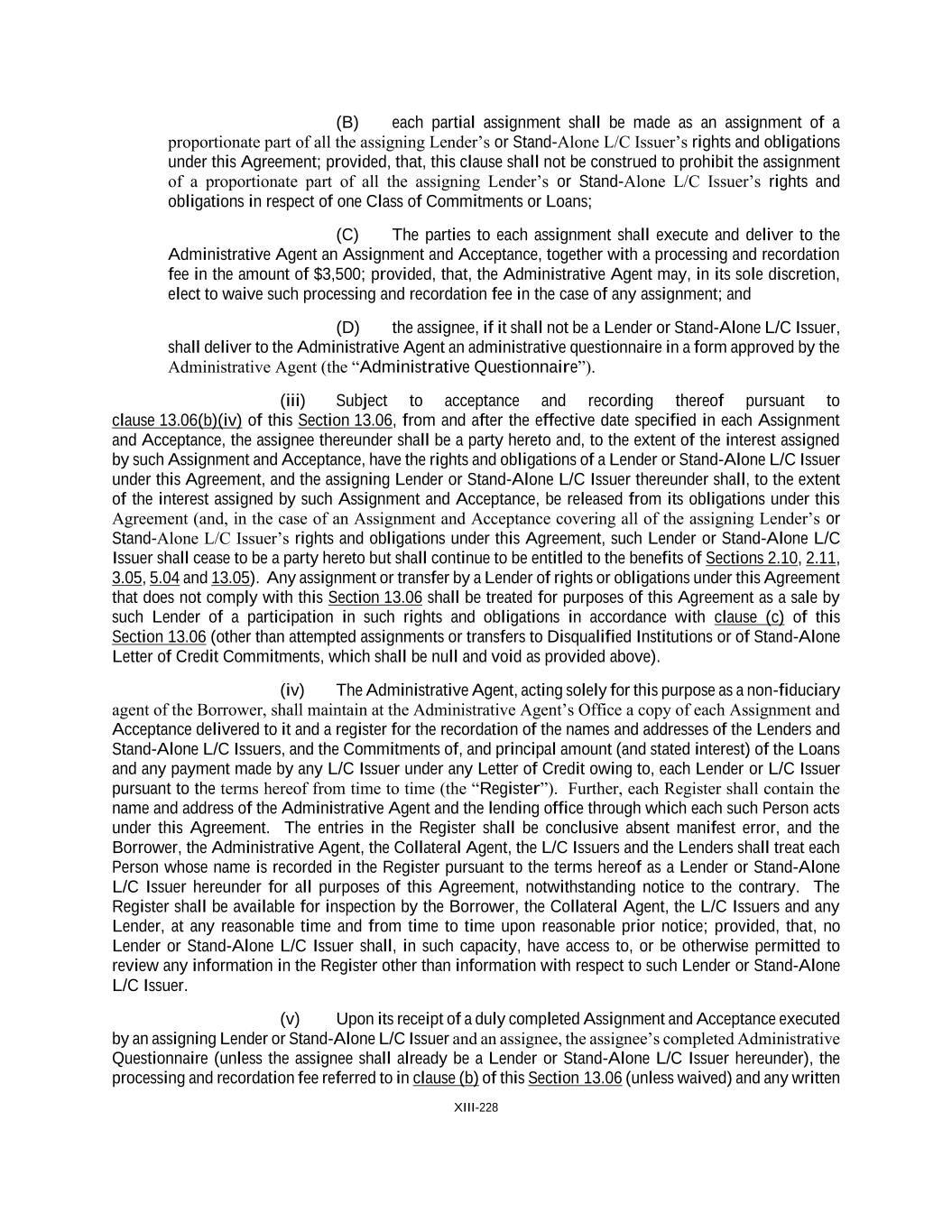 XIII-228 (B) each partial assignment shall be made as an assignment of a proportionate part of all the assigning Lender’s or Stand-Alone L/C Issuer’s rights and obligations under this Agreement; provided, that, this clause shall not be construed to prohibit the assignment of a proportionate part of all the assigning Lender’s or Stand-Alone L/C Issuer’s rights and obligations in respect of one Class of Commitments or Loans; (C) The parties to each assignment shall execute and deliver to the Administrative Agent an Assignment and Acceptance, together with a processing and recordation fee in the amount of $3,500; provided, that, the Administrative Agent may, in its sole discretion, elect to waive such processing and recordation fee in the case of any assignment; and (D) the assignee, if it shall not be a Lender or Stand-Alone L/C Issuer, shall deliver to the Administrative Agent an administrative questionnaire in a form approved by the Administrative Agent (the “Administrative Questionnaire”). (iii) Subject to acceptance and recording thereof pursuant to clause 13.06(b)(iv) of this Section 13.06, from and after the effective date specified in each Assignment and Acceptance, the assignee thereunder shall be a party hereto and, to the extent of the interest assigned by such Assignment and Acceptance, have the rights and obligations of a Lender or Stand-Alone L/C Issuer under this Agreement, and the assigning Lender or Stand-Alone L/C Issuer thereunder shall, to the extent of the interest assigned by such Assignment and Acceptance, be released from its obligations under this Agreement (and, in the case of an Assignment and Acceptance covering all of the assigning Lender’s or Stand-Alone L/C Issuer’s rights and obligations under this Agreement, such Lender or Stand-Alone L/C Issuer shall cease to be a party hereto but shall continue to be entitled to the benefits of Sections 2.10, 2.11, 3.05, 5.04 and 13.05). Any assignment or transfer by a Lender of rights or obligations under this Agreement that does not comply with this Section 13.06 shall be treated for purposes of this Agreement as a sale by such Lender of a participation in such rights and obligations in accordance with clause (c) of this Section 13.06 (other than attempted assignments or transfers to Disqualified Institutions or of Stand-Alone Letter of Credit Commitments, which shall be null and void as provided above). (iv) The Administrative Agent, acting solely for this purpose as a non-fiduciary agent of the Borrower, shall maintain at the Administrative Agent’s Office a copy of each Assignment and Acceptance delivered to it and a register for the recordation of the names and addresses of the Lenders and Stand-Alone L/C Issuers, and the Commitments of, and principal amount (and stated interest) of the Loans and any payment made by any L/C Issuer under any Letter of Credit owing to, each Lender or L/C Issuer pursuant to the terms hereof from time to time (the “Register”). Further, each Register shall contain the name and address of the Administrative Agent and the lending office through which each such Person acts under this Agreement. The entries in the Register shall be conclusive absent manifest error, and the Borrower, the Administrative Agent, the Collateral Agent, the L/C Issuers and the Lenders shall treat each Person whose name is recorded in the Register pursuant to the terms hereof as a Lender or Stand-Alone L/C Issuer hereunder for all purposes of this Agreement, notwithstanding notice to the contrary. The Register shall be available for inspection by the Borrower, the Collateral Agent, the L/C Issuers and any Lender, at any reasonable time and from time to time upon reasonable prior notice; provided, that, no Lender or Stand-Alone L/C Issuer shall, in such capacity, have access to, or be otherwise permitted to review any information in the Register other than information with respect to such Lender or Stand-Alone L/C Issuer. (v) Upon its receipt of a duly completed Assignment and Acceptance executed by an assigning Lender or Stand-Alone L/C Issuer and an assignee, the assignee’s completed Administrative Questionnaire (unless the assignee shall already be a Lender or Stand-Alone L/C Issuer hereunder), the processing and recordation fee referred to in clause (b) of this Section 13.06 (unless waived) and any written