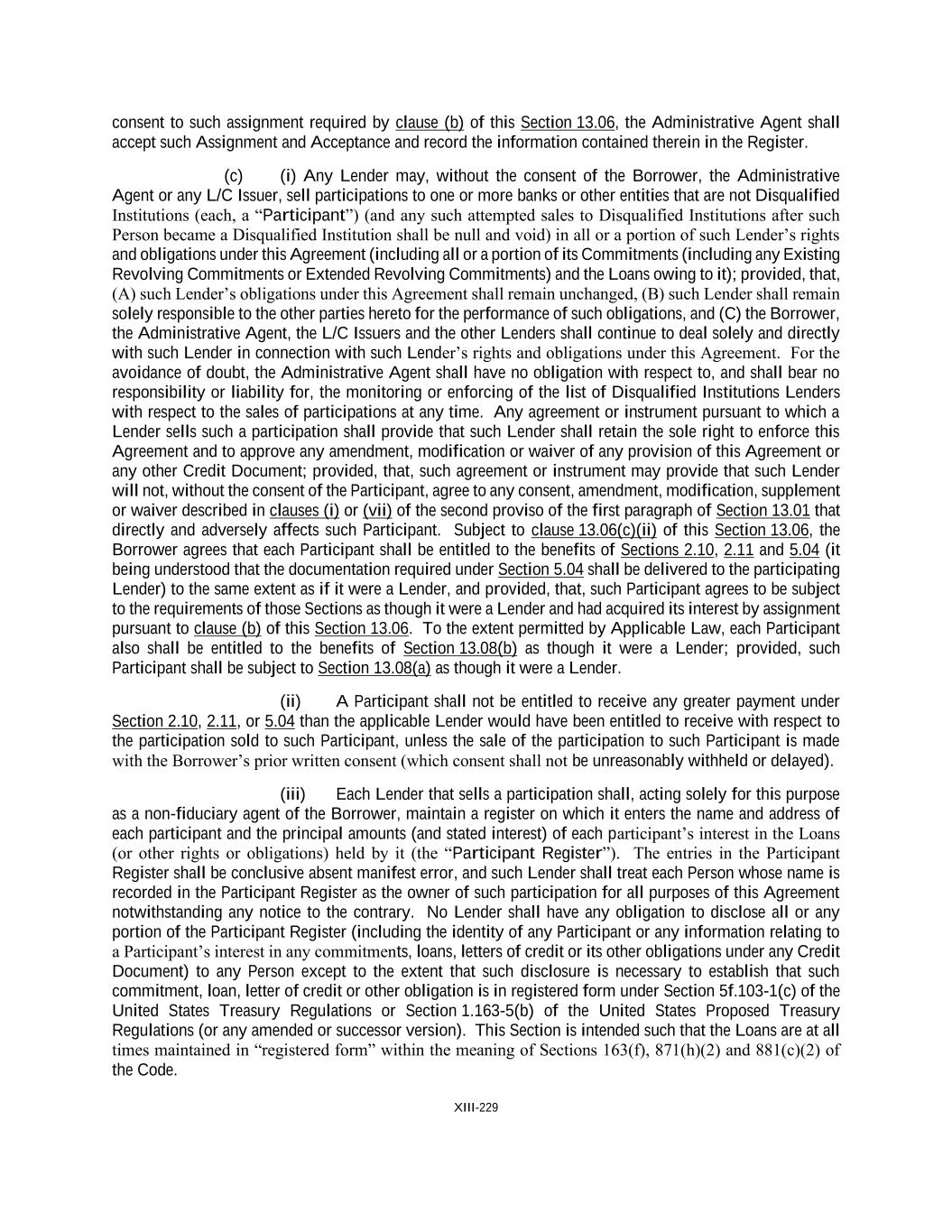 XIII-229 consent to such assignment required by clause (b) of this Section 13.06, the Administrative Agent shall accept such Assignment and Acceptance and record the information contained therein in the Register. (c) (i) Any Lender may, without the consent of the Borrower, the Administrative Agent or any L/C Issuer, sell participations to one or more banks or other entities that are not Disqualified Institutions (each, a “Participant”) (and any such attempted sales to Disqualified Institutions after such Person became a Disqualified Institution shall be null and void) in all or a portion of such Lender’s rights and obligations under this Agreement (including all or a portion of its Commitments (including any Existing Revolving Commitments or Extended Revolving Commitments) and the Loans owing to it); provided, that, (A) such Lender’s obligations under this Agreement shall remain unchanged, (B) such Lender shall remain solely responsible to the other parties hereto for the performance of such obligations, and (C) the Borrower, the Administrative Agent, the L/C Issuers and the other Lenders shall continue to deal solely and directly with such Lender in connection with such Lender’s rights and obligations under this Agreement. For the avoidance of doubt, the Administrative Agent shall have no obligation with respect to, and shall bear no responsibility or liability for, the monitoring or enforcing of the list of Disqualified Institutions Lenders with respect to the sales of participations at any time. Any agreement or instrument pursuant to which a Lender sells such a participation shall provide that such Lender shall retain the sole right to enforce this Agreement and to approve any amendment, modification or waiver of any provision of this Agreement or any other Credit Document; provided, that, such agreement or instrument may provide that such Lender will not, without the consent of the Participant, agree to any consent, amendment, modification, supplement or waiver described in clauses (i) or (vii) of the second proviso of the first paragraph of Section 13.01 that directly and adversely affects such Participant. Subject to clause 13.06(c)(ii) of this Section 13.06, the Borrower agrees that each Participant shall be entitled to the benefits of Sections 2.10, 2.11 and 5.04 (it being understood that the documentation required under Section 5.04 shall be delivered to the participating Lender) to the same extent as if it were a Lender, and provided, that, such Participant agrees to be subject to the requirements of those Sections as though it were a Lender and had acquired its interest by assignment pursuant to clause (b) of this Section 13.06. To the extent permitted by Applicable Law, each Participant also shall be entitled to the benefits of Section 13.08(b) as though it were a Lender; provided, such Participant shall be subject to Section 13.08(a) as though it were a Lender. (ii) A Participant shall not be entitled to receive any greater payment under Section 2.10, 2.11, or 5.04 than the applicable Lender would have been entitled to receive with respect to the participation sold to such Participant, unless the sale of the participation to such Participant is made with the Borrower’s prior written consent (which consent shall not be unreasonably withheld or delayed). (iii) Each Lender that sells a participation shall, acting solely for this purpose as a non-fiduciary agent of the Borrower, maintain a register on which it enters the name and address of each participant and the principal amounts (and stated interest) of each participant’s interest in the Loans (or other rights or obligations) held by it (the “Participant Register”). The entries in the Participant Register shall be conclusive absent manifest error, and such Lender shall treat each Person whose name is recorded in the Participant Register as the owner of such participation for all purposes of this Agreement notwithstanding any notice to the contrary. No Lender shall have any obligation to disclose all or any portion of the Participant Register (including the identity of any Participant or any information relating to a Participant’s interest in any commitments, loans, letters of credit or its other obligations under any Credit Document) to any Person except to the extent that such disclosure is necessary to establish that such commitment, loan, letter of credit or other obligation is in registered form under Section 5f.103-1(c) of the United States Treasury Regulations or Section 1.163-5(b) of the United States Proposed Treasury Regulations (or any amended or successor version). This Section is intended such that the Loans are at all times maintained in “registered form” within the meaning of Sections 163(f), 871(h)(2) and 881(c)(2) of the Code.