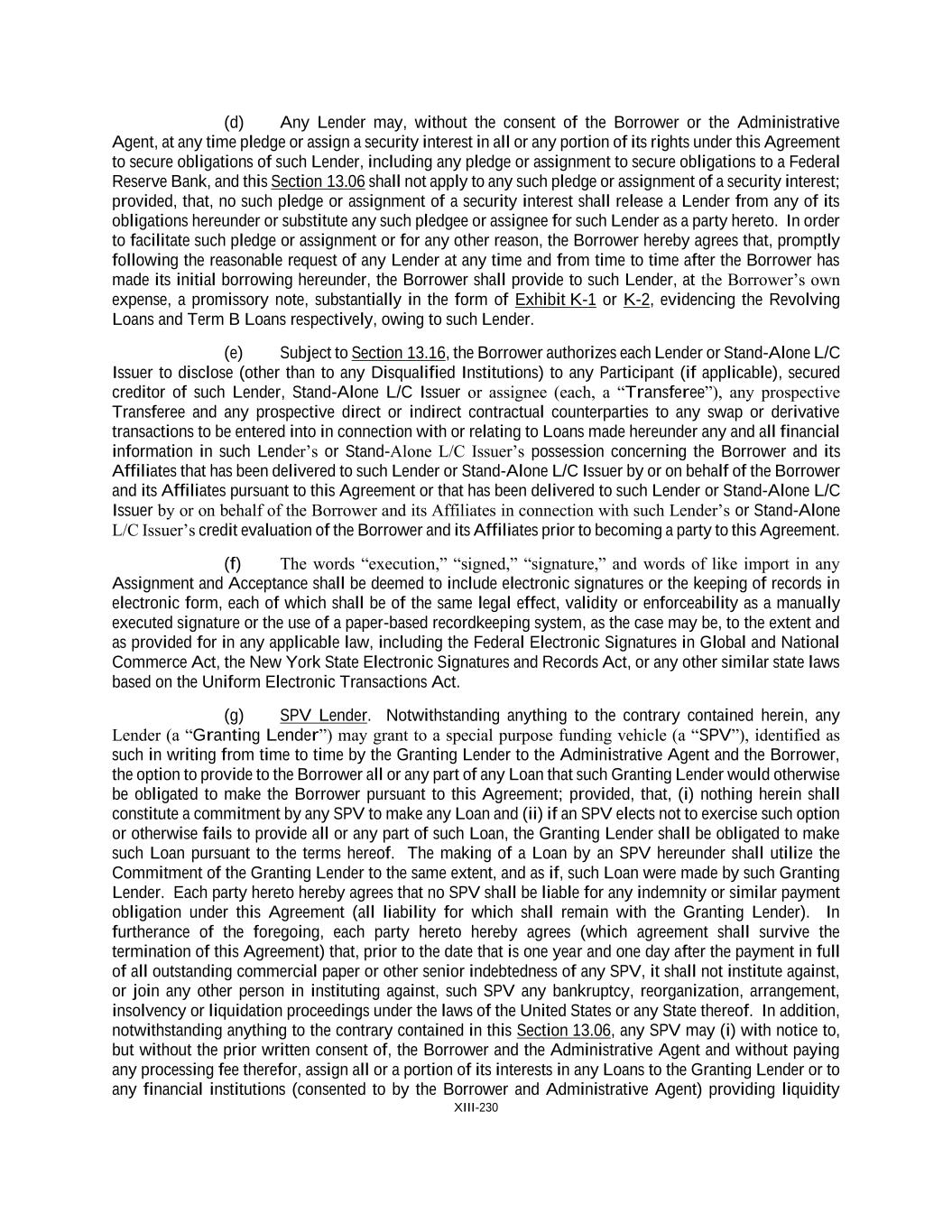 XIII-230 (d) Any Lender may, without the consent of the Borrower or the Administrative Agent, at any time pledge or assign a security interest in all or any portion of its rights under this Agreement to secure obligations of such Lender, including any pledge or assignment to secure obligations to a Federal Reserve Bank, and this Section 13.06 shall not apply to any such pledge or assignment of a security interest; provided, that, no such pledge or assignment of a security interest shall release a Lender from any of its obligations hereunder or substitute any such pledgee or assignee for such Lender as a party hereto. In order to facilitate such pledge or assignment or for any other reason, the Borrower hereby agrees that, promptly following the reasonable request of any Lender at any time and from time to time after the Borrower has made its initial borrowing hereunder, the Borrower shall provide to such Lender, at the Borrower’s own expense, a promissory note, substantially in the form of Exhibit K-1 or K-2, evidencing the Revolving Loans and Term B Loans respectively, owing to such Lender. (e) Subject to Section 13.16, the Borrower authorizes each Lender or Stand-Alone L/C Issuer to disclose (other than to any Disqualified Institutions) to any Participant (if applicable), secured creditor of such Lender, Stand-Alone L/C Issuer or assignee (each, a “Transferee”), any prospective Transferee and any prospective direct or indirect contractual counterparties to any swap or derivative transactions to be entered into in connection with or relating to Loans made hereunder any and all financial information in such Lender’s or Stand-Alone L/C Issuer’s possession concerning the Borrower and its Affiliates that has been delivered to such Lender or Stand-Alone L/C Issuer by or on behalf of the Borrower and its Affiliates pursuant to this Agreement or that has been delivered to such Lender or Stand-Alone L/C Issuer by or on behalf of the Borrower and its Affiliates in connection with such Lender’s or Stand-Alone L/C Issuer’s credit evaluation of the Borrower and its Affiliates prior to becoming a party to this Agreement. (f) The words “execution,” “signed,” “signature,” and words of like import in any Assignment and Acceptance shall be deemed to include electronic signatures or the keeping of records in electronic form, each of which shall be of the same legal effect, validity or enforceability as a manually executed signature or the use of a paper-based recordkeeping system, as the case may be, to the extent and as provided for in any applicable law, including the Federal Electronic Signatures in Global and National Commerce Act, the New York State Electronic Signatures and Records Act, or any other similar state laws based on the Uniform Electronic Transactions Act. (g) SPV Lender. Notwithstanding anything to the contrary contained herein, any Lender (a “Granting Lender”) may grant to a special purpose funding vehicle (a “SPV”), identified as such in writing from time to time by the Granting Lender to the Administrative Agent and the Borrower, the option to provide to the Borrower all or any part of any Loan that such Granting Lender would otherwise be obligated to make the Borrower pursuant to this Agreement; provided, that, (i) nothing herein shall constitute a commitment by any SPV to make any Loan and (ii) if an SPV elects not to exercise such option or otherwise fails to provide all or any part of such Loan, the Granting Lender shall be obligated to make such Loan pursuant to the terms hereof. The making of a Loan by an SPV hereunder shall utilize the Commitment of the Granting Lender to the same extent, and as if, such Loan were made by such Granting Lender. Each party hereto hereby agrees that no SPV shall be liable for any indemnity or similar payment obligation under this Agreement (all liability for which shall remain with the Granting Lender). In furtherance of the foregoing, each party hereto hereby agrees (which agreement shall survive the termination of this Agreement) that, prior to the date that is one year and one day after the payment in full of all outstanding commercial paper or other senior indebtedness of any SPV, it shall not institute against, or join any other person in instituting against, such SPV any bankruptcy, reorganization, arrangement, insolvency or liquidation proceedings under the laws of the United States or any State thereof. In addition, notwithstanding anything to the contrary contained in this Section 13.06, any SPV may (i) with notice to, but without the prior written consent of, the Borrower and the Administrative Agent and without paying any processing fee therefor, assign all or a portion of its interests in any Loans to the Granting Lender or to any financial institutions (consented to by the Borrower and Administrative Agent) providing liquidity
