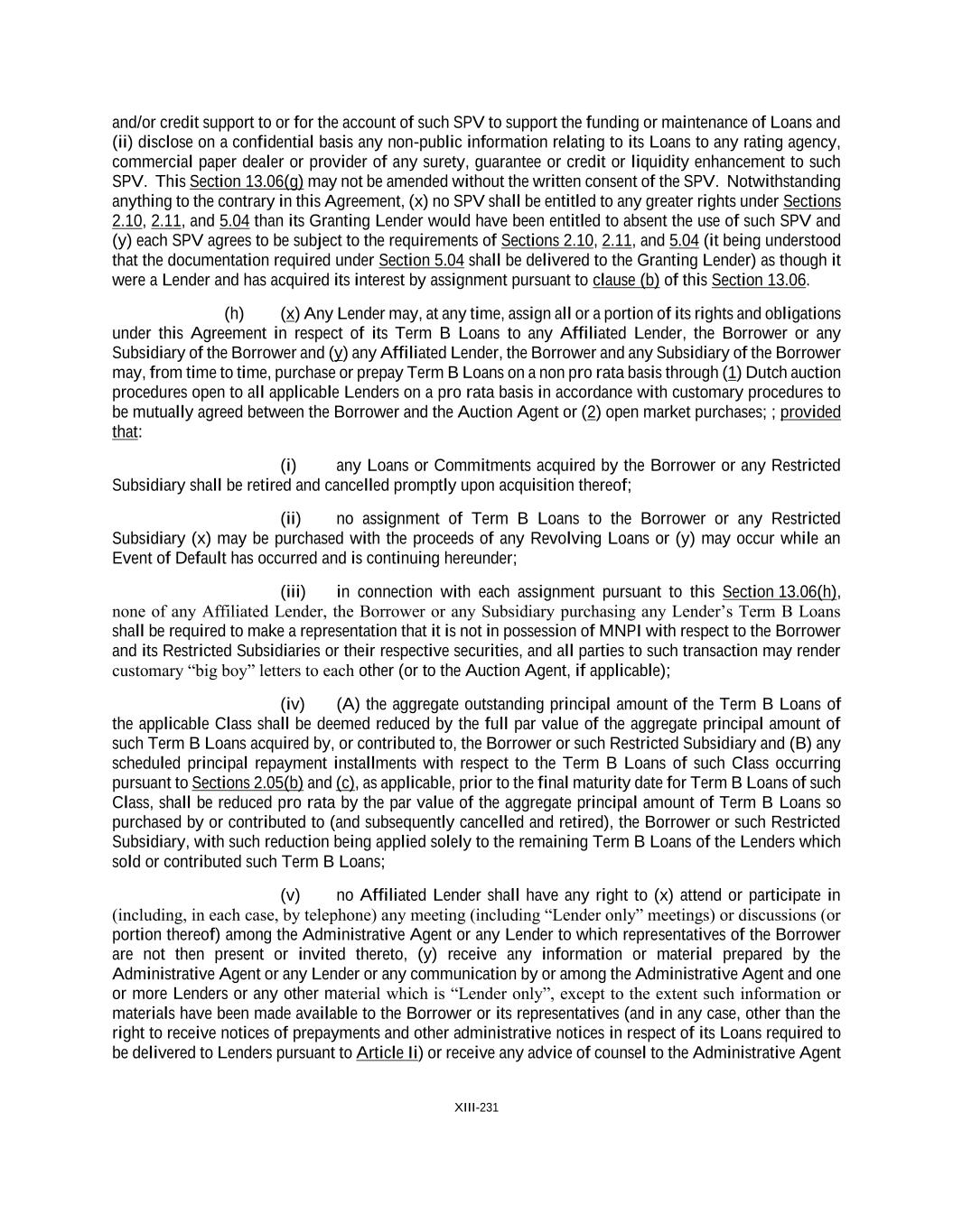 XIII-231 and/or credit support to or for the account of such SPV to support the funding or maintenance of Loans and (ii) disclose on a confidential basis any non-public information relating to its Loans to any rating agency, commercial paper dealer or provider of any surety, guarantee or credit or liquidity enhancement to such SPV. This Section 13.06(g) may not be amended without the written consent of the SPV. Notwithstanding anything to the contrary in this Agreement, (x) no SPV shall be entitled to any greater rights under Sections 2.10, 2.11, and 5.04 than its Granting Lender would have been entitled to absent the use of such SPV and (y) each SPV agrees to be subject to the requirements of Sections 2.10, 2.11, and 5.04 (it being understood that the documentation required under Section 5.04 shall be delivered to the Granting Lender) as though it were a Lender and has acquired its interest by assignment pursuant to clause (b) of this Section 13.06. (h) (x) Any Lender may, at any time, assign all or a portion of its rights and obligations under this Agreement in respect of its Term B Loans to any Affiliated Lender, the Borrower or any Subsidiary of the Borrower and (y) any Affiliated Lender, the Borrower and any Subsidiary of the Borrower may, from time to time, purchase or prepay Term B Loans on a non pro rata basis through (1) Dutch auction procedures open to all applicable Lenders on a pro rata basis in accordance with customary procedures to be mutually agreed between the Borrower and the Auction Agent or (2) open market purchases; ; provided that: (i) any Loans or Commitments acquired by the Borrower or any Restricted Subsidiary shall be retired and cancelled promptly upon acquisition thereof; (ii) no assignment of Term B Loans to the Borrower or any Restricted Subsidiary (x) may be purchased with the proceeds of any Revolving Loans or (y) may occur while an Event of Default has occurred and is continuing hereunder; (iii) in connection with each assignment pursuant to this Section 13.06(h), none of any Affiliated Lender, the Borrower or any Subsidiary purchasing any Lender’s Term B Loans shall be required to make a representation that it is not in possession of MNPI with respect to the Borrower and its Restricted Subsidiaries or their respective securities, and all parties to such transaction may render customary “big boy” letters to each other (or to the Auction Agent, if applicable); (iv) (A) the aggregate outstanding principal amount of the Term B Loans of the applicable Class shall be deemed reduced by the full par value of the aggregate principal amount of such Term B Loans acquired by, or contributed to, the Borrower or such Restricted Subsidiary and (B) any scheduled principal repayment installments with respect to the Term B Loans of such Class occurring pursuant to Sections 2.05(b) and (c), as applicable, prior to the final maturity date for Term B Loans of such Class, shall be reduced pro rata by the par value of the aggregate principal amount of Term B Loans so purchased by or contributed to (and subsequently cancelled and retired), the Borrower or such Restricted Subsidiary, with such reduction being applied solely to the remaining Term B Loans of the Lenders which sold or contributed such Term B Loans; (v) no Affiliated Lender shall have any right to (x) attend or participate in (including, in each case, by telephone) any meeting (including “Lender only” meetings) or discussions (or portion thereof) among the Administrative Agent or any Lender to which representatives of the Borrower are not then present or invited thereto, (y) receive any information or material prepared by the Administrative Agent or any Lender or any communication by or among the Administrative Agent and one or more Lenders or any other material which is “Lender only”, except to the extent such information or materials have been made available to the Borrower or its representatives (and in any case, other than the right to receive notices of prepayments and other administrative notices in respect of its Loans required to be delivered to Lenders pursuant to Article Ii) or receive any advice of counsel to the Administrative Agent