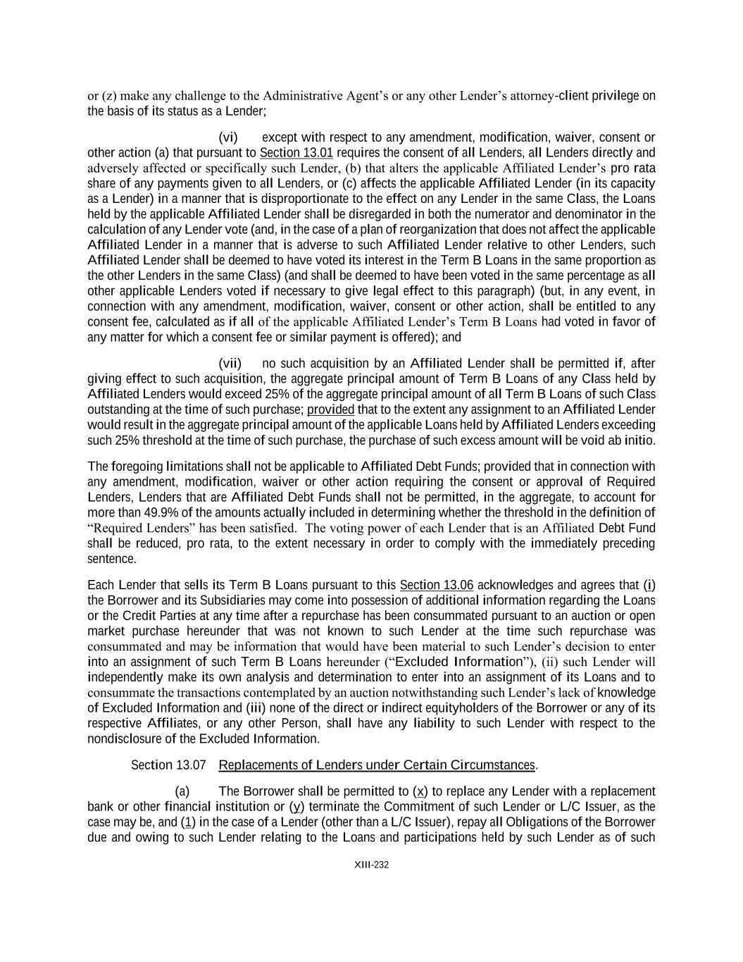 XIII-232 or (z) make any challenge to the Administrative Agent’s or any other Lender’s attorney-client privilege on the basis of its status as a Lender; (vi) except with respect to any amendment, modification, waiver, consent or other action (a) that pursuant to Section 13.01 requires the consent of all Lenders, all Lenders directly and adversely affected or specifically such Lender, (b) that alters the applicable Affiliated Lender’s pro rata share of any payments given to all Lenders, or (c) affects the applicable Affiliated Lender (in its capacity as a Lender) in a manner that is disproportionate to the effect on any Lender in the same Class, the Loans held by the applicable Affiliated Lender shall be disregarded in both the numerator and denominator in the calculation of any Lender vote (and, in the case of a plan of reorganization that does not affect the applicable Affiliated Lender in a manner that is adverse to such Affiliated Lender relative to other Lenders, such Affiliated Lender shall be deemed to have voted its interest in the Term B Loans in the same proportion as the other Lenders in the same Class) (and shall be deemed to have been voted in the same percentage as all other applicable Lenders voted if necessary to give legal effect to this paragraph) (but, in any event, in connection with any amendment, modification, waiver, consent or other action, shall be entitled to any consent fee, calculated as if all of the applicable Affiliated Lender’s Term B Loans had voted in favor of any matter for which a consent fee or similar payment is offered); and (vii) no such acquisition by an Affiliated Lender shall be permitted if, after giving effect to such acquisition, the aggregate principal amount of Term B Loans of any Class held by Affiliated Lenders would exceed 25% of the aggregate principal amount of all Term B Loans of such Class outstanding at the time of such purchase; provided that to the extent any assignment to an Affiliated Lender would result in the aggregate principal amount of the applicable Loans held by Affiliated Lenders exceeding such 25% threshold at the time of such purchase, the purchase of such excess amount will be void ab initio. The foregoing limitations shall not be applicable to Affiliated Debt Funds; provided that in connection with any amendment, modification, waiver or other action requiring the consent or approval of Required Lenders, Lenders that are Affiliated Debt Funds shall not be permitted, in the aggregate, to account for more than 49.9% of the amounts actually included in determining whether the threshold in the definition of “Required Lenders” has been satisfied. The voting power of each Lender that is an Affiliated Debt Fund shall be reduced, pro rata, to the extent necessary in order to comply with the immediately preceding sentence. Each Lender that sells its Term B Loans pursuant to this Section 13.06 acknowledges and agrees that (i) the Borrower and its Subsidiaries may come into possession of additional information regarding the Loans or the Credit Parties at any time after a repurchase has been consummated pursuant to an auction or open market purchase hereunder that was not known to such Lender at the time such repurchase was consummated and may be information that would have been material to such Lender’s decision to enter into an assignment of such Term B Loans hereunder (“Excluded Information”), (ii) such Lender will independently make its own analysis and determination to enter into an assignment of its Loans and to consummate the transactions contemplated by an auction notwithstanding such Lender’s lack of knowledge of Excluded Information and (iii) none of the direct or indirect equityholders of the Borrower or any of its respective Affiliates, or any other Person, shall have any liability to such Lender with respect to the nondisclosure of the Excluded Information. Section 13.07 Replacements of Lenders under Certain Circumstances. (a) The Borrower shall be permitted to (x) to replace any Lender with a replacement bank or other financial institution or (y) terminate the Commitment of such Lender or L/C Issuer, as the case may be, and (1) in the case of a Lender (other than a L/C Issuer), repay all Obligations of the Borrower due and owing to such Lender relating to the Loans and participations held by such Lender as of such