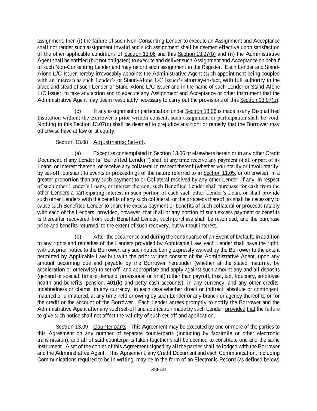 XIII-234 assignment, then (i) the failure of such Non-Consenting Lender to execute an Assignment and Acceptance shall not render such assignment invalid and such assignment shall be deemed effective upon satisfaction of the other applicable conditions of Section 13.06 and this Section 13.07(b) and (ii) the Administrative Agent shall be entitled (but not obligated) to execute and deliver such Assignment and Acceptance on behalf of such Non-Consenting Lender and may record such assignment in the Register. Each Lender and Stand- Alone L/C Issuer hereby irrevocably appoints the Administrative Agent (such appointment being coupled with an interest) as such Lender’s or Stand-Alone L/C Issuer’s attorney-in-fact, with full authority in the place and stead of such Lender or Stand-Alone L/C Issuer and in the name of such Lender or Stand-Alone L/C Issuer, to take any action and to execute any Assignment and Acceptance or other instrument that the Administrative Agent may deem reasonably necessary to carry out the provisions of this Section 13.07(b). (c) If any assignment or participation under Section 13.06 is made to any Disqualified Institution without the Borrower’s prior written consent, such assignment or participation shall be void. Nothing in this Section 13.07(c) shall be deemed to prejudice any right or remedy that the Borrower may otherwise have at law or at equity. Section 13.08 Adjustments; Set-off. (a) Except as contemplated in Section 13.06 or elsewhere herein or in any other Credit Document, if any Lender (a “Benefited Lender”) shall at any time receive any payment of all or part of its Loans, or interest thereon, or receive any collateral in respect thereof (whether voluntarily or involuntarily, by set-off, pursuant to events or proceedings of the nature referred to in Section 11.05, or otherwise), in a greater proportion than any such payment to or Collateral received by any other Lender, if any, in respect of such other Lender’s Loans, or interest thereon, such Benefited Lender shall purchase for cash from the other Lenders a participating interest in such portion of each such other Lender’s Loan, or shall provide such other Lenders with the benefits of any such collateral, or the proceeds thereof, as shall be necessary to cause such Benefited Lender to share the excess payment or benefits of such collateral or proceeds ratably with each of the Lenders; provided, however, that if all or any portion of such excess payment or benefits is thereafter recovered from such Benefited Lender, such purchase shall be rescinded, and the purchase price and benefits returned, to the extent of such recovery, but without interest. (b) After the occurrence and during the continuance of an Event of Default, in addition to any rights and remedies of the Lenders provided by Applicable Law, each Lender shall have the right, without prior notice to the Borrower, any such notice being expressly waived by the Borrower to the extent permitted by Applicable Law but with the prior written consent of the Administrative Agent, upon any amount becoming due and payable by the Borrower hereunder (whether at the stated maturity, by acceleration or otherwise) to set-off and appropriate and apply against such amount any and all deposits (general or special, time or demand, provisional or final) (other than payroll, trust, tax, fiduciary, employee health and benefits, pension, 401(k) and petty cash accounts), in any currency, and any other credits, indebtedness or claims, in any currency, in each case whether direct or indirect, absolute or contingent, matured or unmatured, at any time held or owing by such Lender or any branch or agency thereof to or for the credit or the account of the Borrower. Each Lender agrees promptly to notify the Borrower and the Administrative Agent after any such set-off and application made by such Lender; provided that the failure to give such notice shall not affect the validity of such set-off and application. Section 13.09 Counterparts. This Agreement may be executed by one or more of the parties to this Agreement on any number of separate counterparts (including by facsimile or other electronic transmission), and all of said counterparts taken together shall be deemed to constitute one and the same instrument. A set of the copies of this Agreement signed by all the parties shall be lodged with the Borrower and the Administrative Agent. This Agreement, any Credit Document and each Communication, including Communications required to be in writing, may be in the form of an Electronic Record (as defined below)
