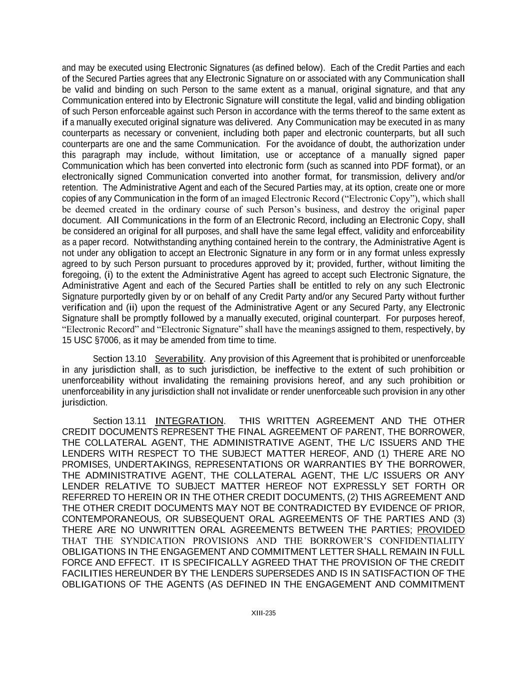 XIII-235 and may be executed using Electronic Signatures (as defined below). Each of the Credit Parties and each of the Secured Parties agrees that any Electronic Signature on or associated with any Communication shall be valid and binding on such Person to the same extent as a manual, original signature, and that any Communication entered into by Electronic Signature will constitute the legal, valid and binding obligation of such Person enforceable against such Person in accordance with the terms thereof to the same extent as if a manually executed original signature was delivered. Any Communication may be executed in as many counterparts as necessary or convenient, including both paper and electronic counterparts, but all such counterparts are one and the same Communication. For the avoidance of doubt, the authorization under this paragraph may include, without limitation, use or acceptance of a manually signed paper Communication which has been converted into electronic form (such as scanned into PDF format), or an electronically signed Communication converted into another format, for transmission, delivery and/or retention. The Administrative Agent and each of the Secured Parties may, at its option, create one or more copies of any Communication in the form of an imaged Electronic Record (“Electronic Copy”), which shall be deemed created in the ordinary course of such Person’s business, and destroy the original paper document. All Communications in the form of an Electronic Record, including an Electronic Copy, shall be considered an original for all purposes, and shall have the same legal effect, validity and enforceability as a paper record. Notwithstanding anything contained herein to the contrary, the Administrative Agent is not under any obligation to accept an Electronic Signature in any form or in any format unless expressly agreed to by such Person pursuant to procedures approved by it; provided, further, without limiting the foregoing, (i) to the extent the Administrative Agent has agreed to accept such Electronic Signature, the Administrative Agent and each of the Secured Parties shall be entitled to rely on any such Electronic Signature purportedly given by or on behalf of any Credit Party and/or any Secured Party without further verification and (ii) upon the request of the Administrative Agent or any Secured Party, any Electronic Signature shall be promptly followed by a manually executed, original counterpart. For purposes hereof, “Electronic Record” and “Electronic Signature” shall have the meanings assigned to them, respectively, by 15 USC §7006, as it may be amended from time to time. Section 13.10 Severability. Any provision of this Agreement that is prohibited or unenforceable in any jurisdiction shall, as to such jurisdiction, be ineffective to the extent of such prohibition or unenforceability without invalidating the remaining provisions hereof, and any such prohibition or unenforceability in any jurisdiction shall not invalidate or render unenforceable such provision in any other jurisdiction. Section 13.11 INTEGRATION. THIS WRITTEN AGREEMENT AND THE OTHER CREDIT DOCUMENTS REPRESENT THE FINAL AGREEMENT OF PARENT, THE BORROWER, THE COLLATERAL AGENT, THE ADMINISTRATIVE AGENT, THE L/C ISSUERS AND THE LENDERS WITH RESPECT TO THE SUBJECT MATTER HEREOF, AND (1) THERE ARE NO PROMISES, UNDERTAKINGS, REPRESENTATIONS OR WARRANTIES BY THE BORROWER, THE ADMINISTRATIVE AGENT, THE COLLATERAL AGENT, THE L/C ISSUERS OR ANY LENDER RELATIVE TO SUBJECT MATTER HEREOF NOT EXPRESSLY SET FORTH OR REFERRED TO HEREIN OR IN THE OTHER CREDIT DOCUMENTS, (2) THIS AGREEMENT AND THE OTHER CREDIT DOCUMENTS MAY NOT BE CONTRADICTED BY EVIDENCE OF PRIOR, CONTEMPORANEOUS, OR SUBSEQUENT ORAL AGREEMENTS OF THE PARTIES AND (3) THERE ARE NO UNWRITTEN ORAL AGREEMENTS BETWEEN THE PARTIES; PROVIDED THAT THE SYNDICATION PROVISIONS AND THE BORROWER’S CONFIDENTIALITY OBLIGATIONS IN THE ENGAGEMENT AND COMMITMENT LETTER SHALL REMAIN IN FULL FORCE AND EFFECT. IT IS SPECIFICALLY AGREED THAT THE PROVISION OF THE CREDIT FACILITIES HEREUNDER BY THE LENDERS SUPERSEDES AND IS IN SATISFACTION OF THE OBLIGATIONS OF THE AGENTS (AS DEFINED IN THE ENGAGEMENT AND COMMITMENT