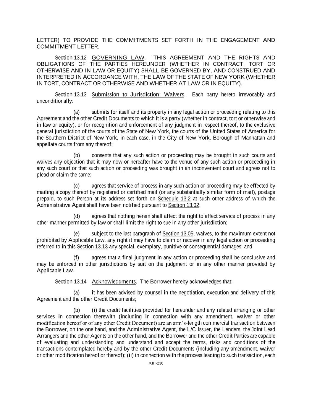 XIII-236 LETTER) TO PROVIDE THE COMMITMENTS SET FORTH IN THE ENGAGEMENT AND COMMITMENT LETTER. Section 13.12 GOVERNING LAW. THIS AGREEMENT AND THE RIGHTS AND OBLIGATIONS OF THE PARTIES HEREUNDER (WHETHER IN CONTRACT, TORT OR OTHERWISE AND IN LAW OR EQUITY) SHALL BE GOVERNED BY, AND CONSTRUED AND INTERPRETED IN ACCORDANCE WITH, THE LAW OF THE STATE OF NEW YORK (WHETHER IN TORT, CONTRACT OR OTHERWISE AND WHETHER AT LAW OR IN EQUITY). Section 13.13 Submission to Jurisdiction; Waivers. Each party hereto irrevocably and unconditionally: (a) submits for itself and its property in any legal action or proceeding relating to this Agreement and the other Credit Documents to which it is a party (whether in contract, tort or otherwise and in law or equity), or for recognition and enforcement of any judgment in respect thereof, to the exclusive general jurisdiction of the courts of the State of New York, the courts of the United States of America for the Southern District of New York, in each case, in the City of New York, Borough of Manhattan and appellate courts from any thereof; (b) consents that any such action or proceeding may be brought in such courts and waives any objection that it may now or hereafter have to the venue of any such action or proceeding in any such court or that such action or proceeding was brought in an inconvenient court and agrees not to plead or claim the same; (c) agrees that service of process in any such action or proceeding may be effected by mailing a copy thereof by registered or certified mail (or any substantially similar form of mail), postage prepaid, to such Person at its address set forth on Schedule 13.2 at such other address of which the Administrative Agent shall have been notified pursuant to Section 13.02; (d) agrees that nothing herein shall affect the right to effect service of process in any other manner permitted by law or shall limit the right to sue in any other jurisdiction; (e) subject to the last paragraph of Section 13.05, waives, to the maximum extent not prohibited by Applicable Law, any right it may have to claim or recover in any legal action or proceeding referred to in this Section 13.13 any special, exemplary, punitive or consequential damages; and (f) agrees that a final judgment in any action or proceeding shall be conclusive and may be enforced in other jurisdictions by suit on the judgment or in any other manner provided by Applicable Law. Section 13.14 Acknowledgments. The Borrower hereby acknowledges that: (a) it has been advised by counsel in the negotiation, execution and delivery of this Agreement and the other Credit Documents; (b) (i) the credit facilities provided for hereunder and any related arranging or other services in connection therewith (including in connection with any amendment, waiver or other modification hereof or of any other Credit Document) are an arm’s-length commercial transaction between the Borrower, on the one hand, and the Administrative Agent, the L/C Issuer, the Lenders, the Joint Lead Arrangers and the other Agents on the other hand, and the Borrower and the other Credit Parties are capable of evaluating and understanding and understand and accept the terms, risks and conditions of the transactions contemplated hereby and by the other Credit Documents (including any amendment, waiver or other modification hereof or thereof); (ii) in connection with the process leading to such transaction, each