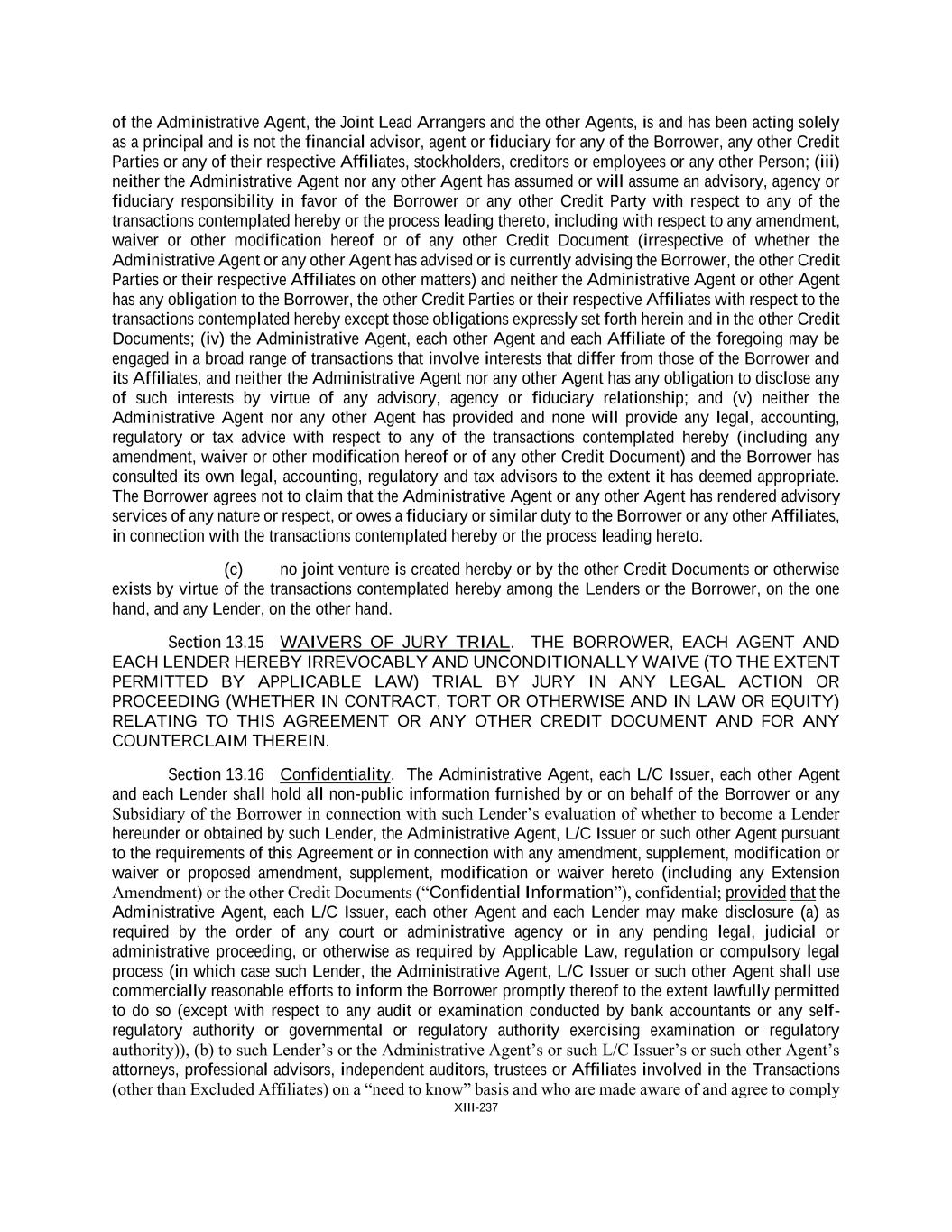 XIII-237 of the Administrative Agent, the Joint Lead Arrangers and the other Agents, is and has been acting solely as a principal and is not the financial advisor, agent or fiduciary for any of the Borrower, any other Credit Parties or any of their respective Affiliates, stockholders, creditors or employees or any other Person; (iii) neither the Administrative Agent nor any other Agent has assumed or will assume an advisory, agency or fiduciary responsibility in favor of the Borrower or any other Credit Party with respect to any of the transactions contemplated hereby or the process leading thereto, including with respect to any amendment, waiver or other modification hereof or of any other Credit Document (irrespective of whether the Administrative Agent or any other Agent has advised or is currently advising the Borrower, the other Credit Parties or their respective Affiliates on other matters) and neither the Administrative Agent or other Agent has any obligation to the Borrower, the other Credit Parties or their respective Affiliates with respect to the transactions contemplated hereby except those obligations expressly set forth herein and in the other Credit Documents; (iv) the Administrative Agent, each other Agent and each Affiliate of the foregoing may be engaged in a broad range of transactions that involve interests that differ from those of the Borrower and its Affiliates, and neither the Administrative Agent nor any other Agent has any obligation to disclose any of such interests by virtue of any advisory, agency or fiduciary relationship; and (v) neither the Administrative Agent nor any other Agent has provided and none will provide any legal, accounting, regulatory or tax advice with respect to any of the transactions contemplated hereby (including any amendment, waiver or other modification hereof or of any other Credit Document) and the Borrower has consulted its own legal, accounting, regulatory and tax advisors to the extent it has deemed appropriate. The Borrower agrees not to claim that the Administrative Agent or any other Agent has rendered advisory services of any nature or respect, or owes a fiduciary or similar duty to the Borrower or any other Affiliates, in connection with the transactions contemplated hereby or the process leading hereto. (c) no joint venture is created hereby or by the other Credit Documents or otherwise exists by virtue of the transactions contemplated hereby among the Lenders or the Borrower, on the one hand, and any Lender, on the other hand. Section 13.15 WAIVERS OF JURY TRIAL. THE BORROWER, EACH AGENT AND EACH LENDER HEREBY IRREVOCABLY AND UNCONDITIONALLY WAIVE (TO THE EXTENT PERMITTED BY APPLICABLE LAW) TRIAL BY JURY IN ANY LEGAL ACTION OR PROCEEDING (WHETHER IN CONTRACT, TORT OR OTHERWISE AND IN LAW OR EQUITY) RELATING TO THIS AGREEMENT OR ANY OTHER CREDIT DOCUMENT AND FOR ANY COUNTERCLAIM THEREIN. Section 13.16 Confidentiality. The Administrative Agent, each L/C Issuer, each other Agent and each Lender shall hold all non-public information furnished by or on behalf of the Borrower or any Subsidiary of the Borrower in connection with such Lender’s evaluation of whether to become a Lender hereunder or obtained by such Lender, the Administrative Agent, L/C Issuer or such other Agent pursuant to the requirements of this Agreement or in connection with any amendment, supplement, modification or waiver or proposed amendment, supplement, modification or waiver hereto (including any Extension Amendment) or the other Credit Documents (“Confidential Information”), confidential; provided that the Administrative Agent, each L/C Issuer, each other Agent and each Lender may make disclosure (a) as required by the order of any court or administrative agency or in any pending legal, judicial or administrative proceeding, or otherwise as required by Applicable Law, regulation or compulsory legal process (in which case such Lender, the Administrative Agent, L/C Issuer or such other Agent shall use commercially reasonable efforts to inform the Borrower promptly thereof to the extent lawfully permitted to do so (except with respect to any audit or examination conducted by bank accountants or any self- regulatory authority or governmental or regulatory authority exercising examination or regulatory authority)), (b) to such Lender’s or the Administrative Agent’s or such L/C Issuer’s or such other Agent’s attorneys, professional advisors, independent auditors, trustees or Affiliates involved in the Transactions (other than Excluded Affiliates) on a “need to know” basis and who are made aware of and agree to comply