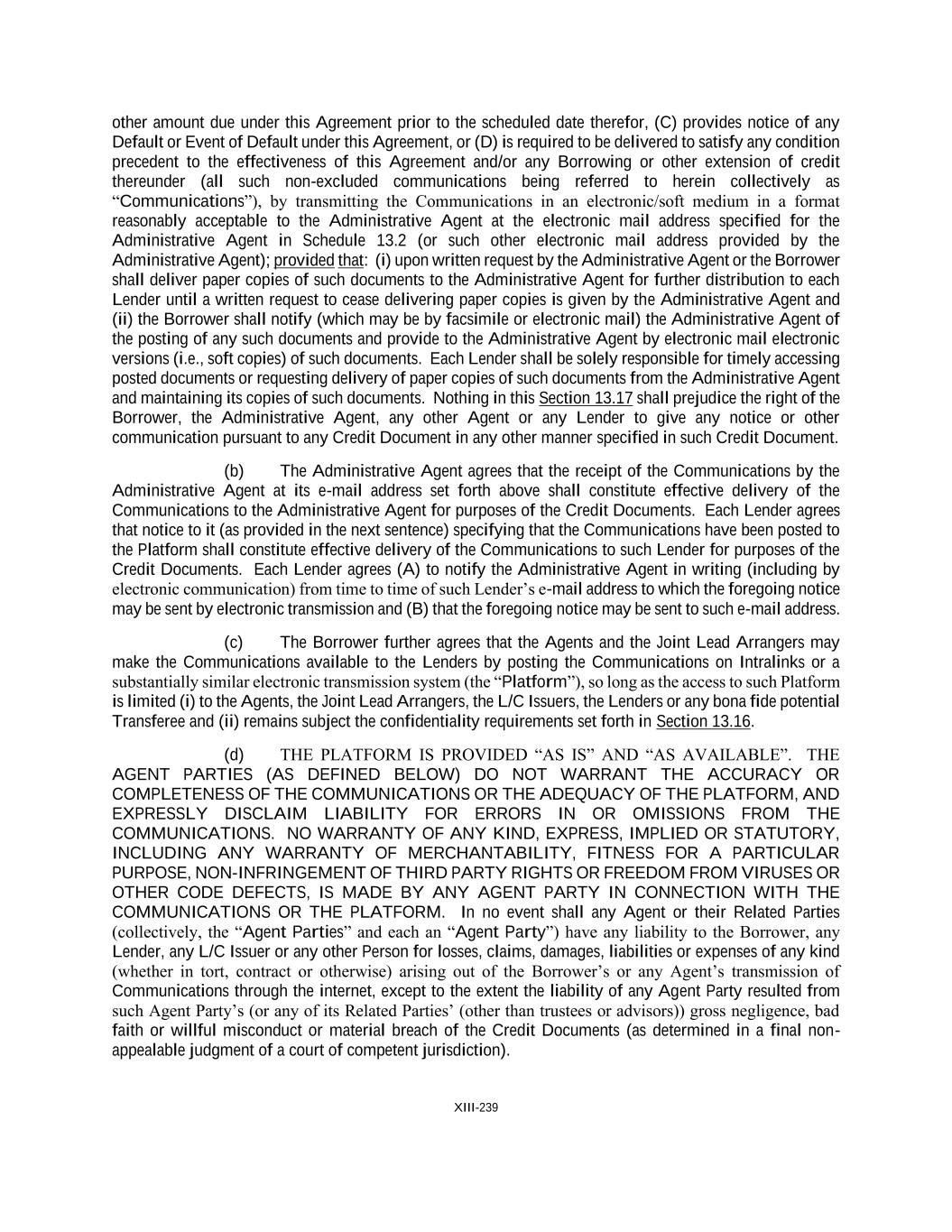 XIII-239 other amount due under this Agreement prior to the scheduled date therefor, (C) provides notice of any Default or Event of Default under this Agreement, or (D) is required to be delivered to satisfy any condition precedent to the effectiveness of this Agreement and/or any Borrowing or other extension of credit thereunder (all such non-excluded communications being referred to herein collectively as “Communications”), by transmitting the Communications in an electronic/soft medium in a format reasonably acceptable to the Administrative Agent at the electronic mail address specified for the Administrative Agent in Schedule 13.2 (or such other electronic mail address provided by the Administrative Agent); provided that: (i) upon written request by the Administrative Agent or the Borrower shall deliver paper copies of such documents to the Administrative Agent for further distribution to each Lender until a written request to cease delivering paper copies is given by the Administrative Agent and (ii) the Borrower shall notify (which may be by facsimile or electronic mail) the Administrative Agent of the posting of any such documents and provide to the Administrative Agent by electronic mail electronic versions (i.e., soft copies) of such documents. Each Lender shall be solely responsible for timely accessing posted documents or requesting delivery of paper copies of such documents from the Administrative Agent and maintaining its copies of such documents. Nothing in this Section 13.17 shall prejudice the right of the Borrower, the Administrative Agent, any other Agent or any Lender to give any notice or other communication pursuant to any Credit Document in any other manner specified in such Credit Document. (b) The Administrative Agent agrees that the receipt of the Communications by the Administrative Agent at its e-mail address set forth above shall constitute effective delivery of the Communications to the Administrative Agent for purposes of the Credit Documents. Each Lender agrees that notice to it (as provided in the next sentence) specifying that the Communications have been posted to the Platform shall constitute effective delivery of the Communications to such Lender for purposes of the Credit Documents. Each Lender agrees (A) to notify the Administrative Agent in writing (including by electronic communication) from time to time of such Lender’s e-mail address to which the foregoing notice may be sent by electronic transmission and (B) that the foregoing notice may be sent to such e-mail address. (c) The Borrower further agrees that the Agents and the Joint Lead Arrangers may make the Communications available to the Lenders by posting the Communications on Intralinks or a substantially similar electronic transmission system (the “Platform”), so long as the access to such Platform is limited (i) to the Agents, the Joint Lead Arrangers, the L/C Issuers, the Lenders or any bona fide potential Transferee and (ii) remains subject the confidentiality requirements set forth in Section 13.16. (d) THE PLATFORM IS PROVIDED “AS IS” AND “AS AVAILABLE”. THE AGENT PARTIES (AS DEFINED BELOW) DO NOT WARRANT THE ACCURACY OR COMPLETENESS OF THE COMMUNICATIONS OR THE ADEQUACY OF THE PLATFORM, AND EXPRESSLY DISCLAIM LIABILITY FOR ERRORS IN OR OMISSIONS FROM THE COMMUNICATIONS. NO WARRANTY OF ANY KIND, EXPRESS, IMPLIED OR STATUTORY, INCLUDING ANY WARRANTY OF MERCHANTABILITY, FITNESS FOR A PARTICULAR PURPOSE, NON-INFRINGEMENT OF THIRD PARTY RIGHTS OR FREEDOM FROM VIRUSES OR OTHER CODE DEFECTS, IS MADE BY ANY AGENT PARTY IN CONNECTION WITH THE COMMUNICATIONS OR THE PLATFORM. In no event shall any Agent or their Related Parties (collectively, the “Agent Parties” and each an “Agent Party”) have any liability to the Borrower, any Lender, any L/C Issuer or any other Person for losses, claims, damages, liabilities or expenses of any kind (whether in tort, contract or otherwise) arising out of the Borrower’s or any Agent’s transmission of Communications through the internet, except to the extent the liability of any Agent Party resulted from such Agent Party’s (or any of its Related Parties’ (other than trustees or advisors)) gross negligence, bad faith or willful misconduct or material breach of the Credit Documents (as determined in a final non- appealable judgment of a court of competent jurisdiction).