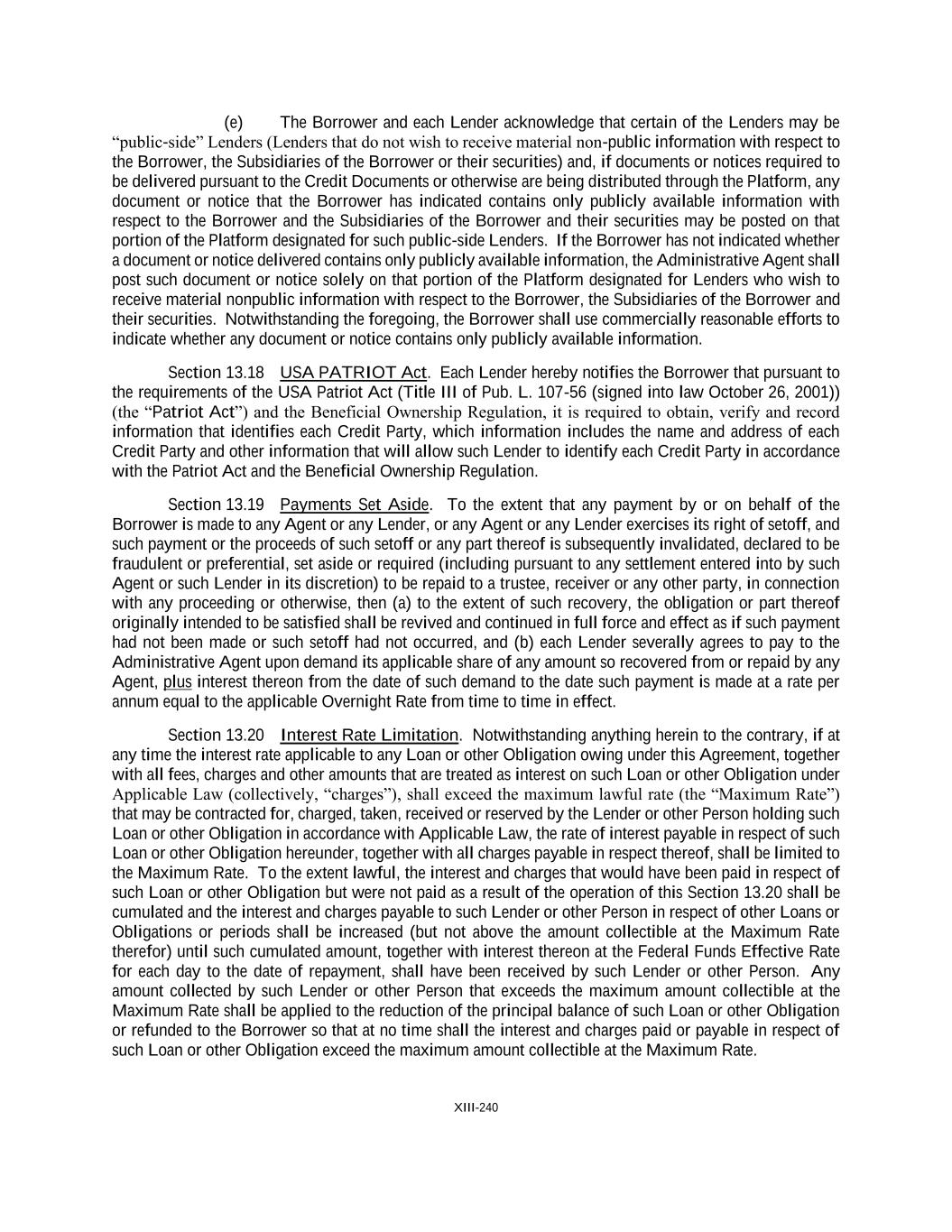 XIII-240 (e) The Borrower and each Lender acknowledge that certain of the Lenders may be “public-side” Lenders (Lenders that do not wish to receive material non-public information with respect to the Borrower, the Subsidiaries of the Borrower or their securities) and, if documents or notices required to be delivered pursuant to the Credit Documents or otherwise are being distributed through the Platform, any document or notice that the Borrower has indicated contains only publicly available information with respect to the Borrower and the Subsidiaries of the Borrower and their securities may be posted on that portion of the Platform designated for such public-side Lenders. If the Borrower has not indicated whether a document or notice delivered contains only publicly available information, the Administrative Agent shall post such document or notice solely on that portion of the Platform designated for Lenders who wish to receive material nonpublic information with respect to the Borrower, the Subsidiaries of the Borrower and their securities. Notwithstanding the foregoing, the Borrower shall use commercially reasonable efforts to indicate whether any document or notice contains only publicly available information. Section 13.18 USA PATRIOT Act. Each Lender hereby notifies the Borrower that pursuant to the requirements of the USA Patriot Act (Title III of Pub. L. 107-56 (signed into law October 26, 2001)) (the “Patriot Act”) and the Beneficial Ownership Regulation, it is required to obtain, verify and record information that identifies each Credit Party, which information includes the name and address of each Credit Party and other information that will allow such Lender to identify each Credit Party in accordance with the Patriot Act and the Beneficial Ownership Regulation. Section 13.19 Payments Set Aside. To the extent that any payment by or on behalf of the Borrower is made to any Agent or any Lender, or any Agent or any Lender exercises its right of setoff, and such payment or the proceeds of such setoff or any part thereof is subsequently invalidated, declared to be fraudulent or preferential, set aside or required (including pursuant to any settlement entered into by such Agent or such Lender in its discretion) to be repaid to a trustee, receiver or any other party, in connection with any proceeding or otherwise, then (a) to the extent of such recovery, the obligation or part thereof originally intended to be satisfied shall be revived and continued in full force and effect as if such payment had not been made or such setoff had not occurred, and (b) each Lender severally agrees to pay to the Administrative Agent upon demand its applicable share of any amount so recovered from or repaid by any Agent, plus interest thereon from the date of such demand to the date such payment is made at a rate per annum equal to the applicable Overnight Rate from time to time in effect. Section 13.20 Interest Rate Limitation. Notwithstanding anything herein to the contrary, if at any time the interest rate applicable to any Loan or other Obligation owing under this Agreement, together with all fees, charges and other amounts that are treated as interest on such Loan or other Obligation under Applicable Law (collectively, “charges”), shall exceed the maximum lawful rate (the “Maximum Rate”) that may be contracted for, charged, taken, received or reserved by the Lender or other Person holding such Loan or other Obligation in accordance with Applicable Law, the rate of interest payable in respect of such Loan or other Obligation hereunder, together with all charges payable in respect thereof, shall be limited to the Maximum Rate. To the extent lawful, the interest and charges that would have been paid in respect of such Loan or other Obligation but were not paid as a result of the operation of this Section 13.20 shall be cumulated and the interest and charges payable to such Lender or other Person in respect of other Loans or Obligations or periods shall be increased (but not above the amount collectible at the Maximum Rate therefor) until such cumulated amount, together with interest thereon at the Federal Funds Effective Rate for each day to the date of repayment, shall have been received by such Lender or other Person. Any amount collected by such Lender or other Person that exceeds the maximum amount collectible at the Maximum Rate shall be applied to the reduction of the principal balance of such Loan or other Obligation or refunded to the Borrower so that at no time shall the interest and charges paid or payable in respect of such Loan or other Obligation exceed the maximum amount collectible at the Maximum Rate.