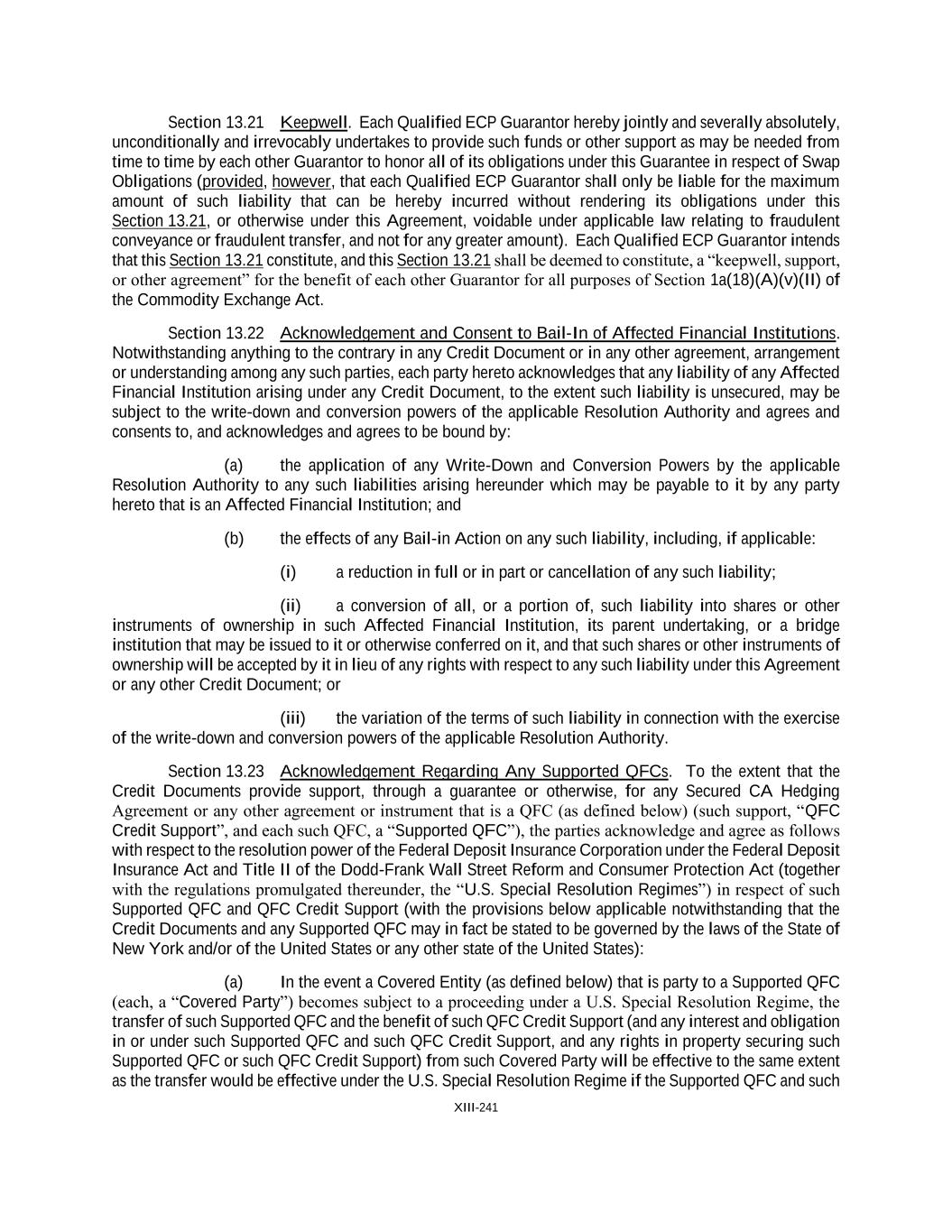 XIII-241 Section 13.21 Keepwell. Each Qualified ECP Guarantor hereby jointly and severally absolutely, unconditionally and irrevocably undertakes to provide such funds or other support as may be needed from time to time by each other Guarantor to honor all of its obligations under this Guarantee in respect of Swap Obligations (provided, however, that each Qualified ECP Guarantor shall only be liable for the maximum amount of such liability that can be hereby incurred without rendering its obligations under this Section 13.21, or otherwise under this Agreement, voidable under applicable law relating to fraudulent conveyance or fraudulent transfer, and not for any greater amount). Each Qualified ECP Guarantor intends that this Section 13.21 constitute, and this Section 13.21 shall be deemed to constitute, a “keepwell, support, or other agreement” for the benefit of each other Guarantor for all purposes of Section 1a(18)(A)(v)(II) of the Commodity Exchange Act. Section 13.22 Acknowledgement and Consent to Bail-In of Affected Financial Institutions. Notwithstanding anything to the contrary in any Credit Document or in any other agreement, arrangement or understanding among any such parties, each party hereto acknowledges that any liability of any Affected Financial Institution arising under any Credit Document, to the extent such liability is unsecured, may be subject to the write-down and conversion powers of the applicable Resolution Authority and agrees and consents to, and acknowledges and agrees to be bound by: (a) the application of any Write-Down and Conversion Powers by the applicable Resolution Authority to any such liabilities arising hereunder which may be payable to it by any party hereto that is an Affected Financial Institution; and (b) the effects of any Bail-in Action on any such liability, including, if applicable: (i) a reduction in full or in part or cancellation of any such liability; (ii) a conversion of all, or a portion of, such liability into shares or other instruments of ownership in such Affected Financial Institution, its parent undertaking, or a bridge institution that may be issued to it or otherwise conferred on it, and that such shares or other instruments of ownership will be accepted by it in lieu of any rights with respect to any such liability under this Agreement or any other Credit Document; or (iii) the variation of the terms of such liability in connection with the exercise of the write-down and conversion powers of the applicable Resolution Authority. Section 13.23 Acknowledgement Regarding Any Supported QFCs. To the extent that the Credit Documents provide support, through a guarantee or otherwise, for any Secured CA Hedging Agreement or any other agreement or instrument that is a QFC (as defined below) (such support, “QFC Credit Support”, and each such QFC, a “Supported QFC”), the parties acknowledge and agree as follows with respect to the resolution power of the Federal Deposit Insurance Corporation under the Federal Deposit Insurance Act and Title II of the Dodd-Frank Wall Street Reform and Consumer Protection Act (together with the regulations promulgated thereunder, the “U.S. Special Resolution Regimes”) in respect of such Supported QFC and QFC Credit Support (with the provisions below applicable notwithstanding that the Credit Documents and any Supported QFC may in fact be stated to be governed by the laws of the State of New York and/or of the United States or any other state of the United States): (a) In the event a Covered Entity (as defined below) that is party to a Supported QFC (each, a “Covered Party”) becomes subject to a proceeding under a U.S. Special Resolution Regime, the transfer of such Supported QFC and the benefit of such QFC Credit Support (and any interest and obligation in or under such Supported QFC and such QFC Credit Support, and any rights in property securing such Supported QFC or such QFC Credit Support) from such Covered Party will be effective to the same extent as the transfer would be effective under the U.S. Special Resolution Regime if the Supported QFC and such