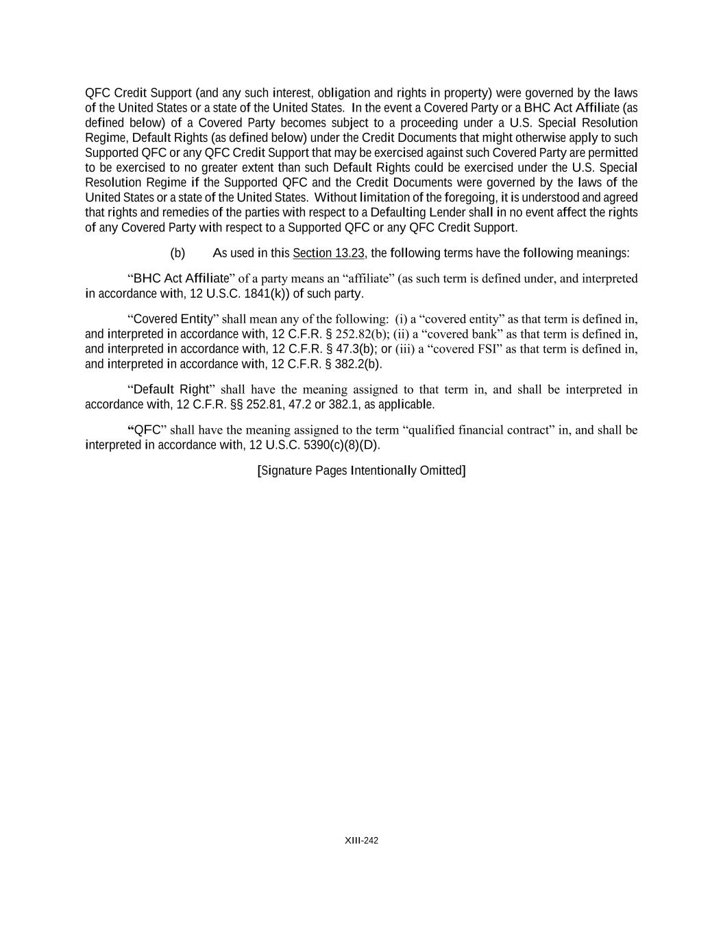 XIII-242 QFC Credit Support (and any such interest, obligation and rights in property) were governed by the laws of the United States or a state of the United States. In the event a Covered Party or a BHC Act Affiliate (as defined below) of a Covered Party becomes subject to a proceeding under a U.S. Special Resolution Regime, Default Rights (as defined below) under the Credit Documents that might otherwise apply to such Supported QFC or any QFC Credit Support that may be exercised against such Covered Party are permitted to be exercised to no greater extent than such Default Rights could be exercised under the U.S. Special Resolution Regime if the Supported QFC and the Credit Documents were governed by the laws of the United States or a state of the United States. Without limitation of the foregoing, it is understood and agreed that rights and remedies of the parties with respect to a Defaulting Lender shall in no event affect the rights of any Covered Party with respect to a Supported QFC or any QFC Credit Support. (b) As used in this Section 13.23, the following terms have the following meanings: “BHC Act Affiliate” of a party means an “affiliate” (as such term is defined under, and interpreted in accordance with, 12 U.S.C. 1841(k)) of such party. “Covered Entity” shall mean any of the following: (i) a “covered entity” as that term is defined in, and interpreted in accordance with, 12 C.F.R. § 252.82(b); (ii) a “covered bank” as that term is defined in, and interpreted in accordance with, 12 C.F.R. § 47.3(b); or (iii) a “covered FSI” as that term is defined in, and interpreted in accordance with, 12 C.F.R. § 382.2(b). “Default Right” shall have the meaning assigned to that term in, and shall be interpreted in accordance with, 12 C.F.R. §§ 252.81, 47.2 or 382.1, as applicable. “QFC” shall have the meaning assigned to the term “qualified financial contract” in, and shall be interpreted in accordance with, 12 U.S.C. 5390(c)(8)(D). [Signature Pages Intentionally Omitted]