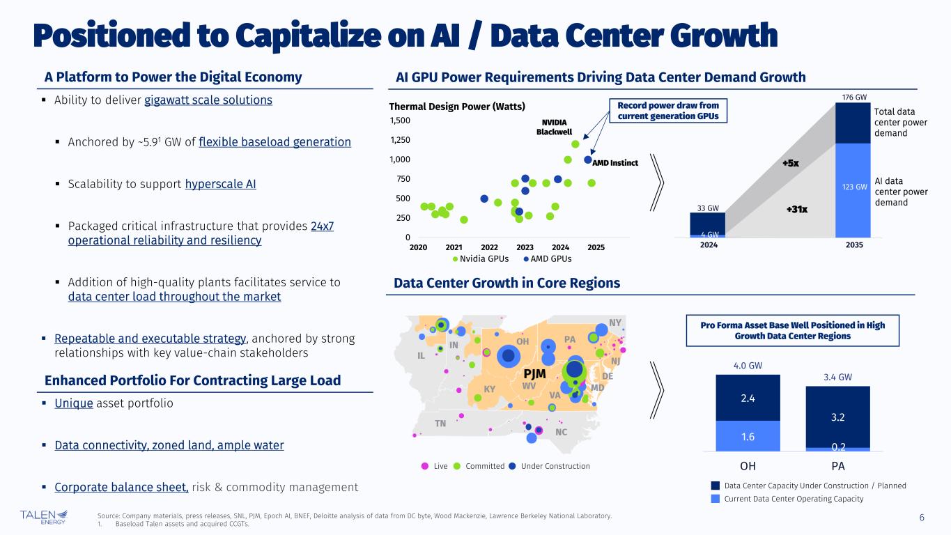 6 1.6 0.2 2.4 3.2 4.0 GW 3.4 GW OH PA A Platform to Power the Digital Economy AI GPU Power Requirements Driving Data Center Demand Growth Positioned to Capitalize on AI / Data Center Growth Source: Company materials, press releases, SNL, PJM, Epoch AI, BNEF, Deloitte analysis of data from DC byte, Wood Mackenzie, Lawrence Berkeley National Laboratory. 1. Baseload Talen assets and acquired CCGTs. +5x +31x Total data center power demand AI data center power demand 4 GW 123 GW 33 GW 176 GW 2024 2035 Data Center Capacity Under Construction / Planned Current Data Center Operating Capacity Record power draw from current generation GPUs Pro Forma Asset Base Well Positioned in High Growth Data Center Regions NVIDIA Blackwell AMD Instinct 0 250 500 750 1,000 1,250 1,500 2020 2021 2022 2023 2024 2025 Thermal Design Power (Watts) Nvidia GPUs AMD GPUs Live Under ConstructionCommitted Data Center Growth in Core Regions ▪ Ability to deliver gigawatt scale solutions ▪ Anchored by ~5.91 GW of flexible baseload generation ▪ Scalability to support hyperscale AI ▪ Packaged critical infrastructure that provides 24x7 operational reliability and resiliency ▪ Addition of high-quality plants facilitates service to data center load throughout the market ▪ Repeatable and executable strategy, anchored by strong relationships with key value-chain stakeholders NY Enhanced Portfolio For Contracting Large Load ▪ Unique asset portfolio ▪ Data connectivity, zoned land, ample water ▪ Corporate balance sheet, risk & commodity management