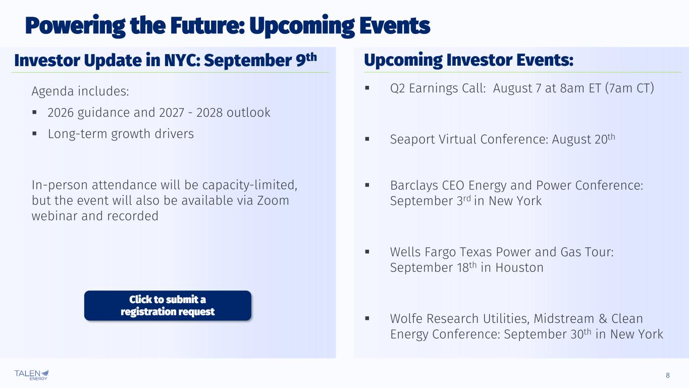 8 Upcoming Investor Events: ▪ Q2 Earnings Call: August 7 at 8am ET (7am CT) ▪ Seaport Virtual Conference: August 20th ▪ Barclays CEO Energy and Power Conference: September 3rd in New York ▪ Wells Fargo Texas Power and Gas Tour: September 18th in Houston ▪ Wolfe Research Utilities, Midstream & Clean Energy Conference: September 30th in New York Powering the Future: Upcoming Events Investor Update in NYC: September 9th Click to submit aregis ration request Click to submit a registration request Agenda includes: ▪ 2026 guidance and 2027 - 2028 outlook ▪ Long-term growth drivers In-person attendance will be capacity-limited, but the event will also be available via Zoom webinar and recorded