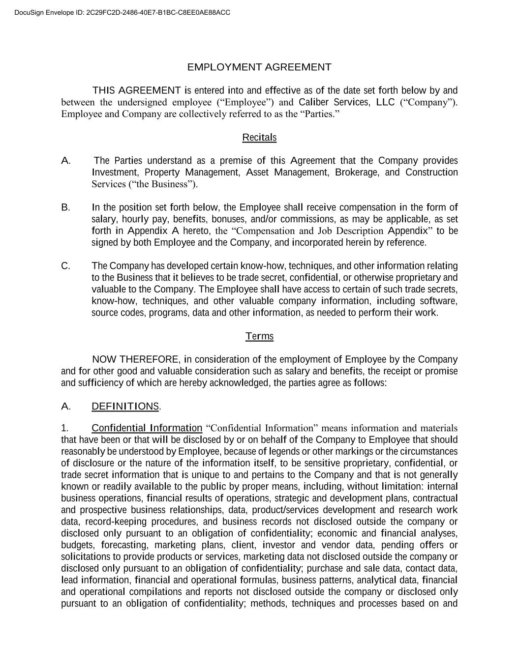 EMPLOYMENT AGREEMENT THIS AGREEMENT is entered into and effective as of the date set forth below by and between the undersigned employee (“Employee”) and Caliber Services, LLC (“Company”). Employee and Company are collectively referred to as the “Parties.” Recitals A. The Parties understand as a premise of this Agreement that the Company provides Investment, Property Management, Asset Management, Brokerage, and Construction Services (“the Business”). B. In the position set forth below, the Employee shall receive compensation in the form of salary, hourly pay, benefits, bonuses, and/or commissions, as may be applicable, as set forth in Appendix A hereto, the “Compensation and Job Description Appendix” to be signed by both Employee and the Company, and incorporated herein by reference. C. The Company has developed certain know-how, techniques, and other information relating to the Business that it believes to be trade secret, confidential, or otherwise proprietary and valuable to the Company. The Employee shall have access to certain of such trade secrets, know-how, techniques, and other valuable company information, including software, source codes, programs, data and other information, as needed to perform their work. Terms NOW THEREFORE, in consideration of the employment of Employee by the Company and for other good and valuable consideration such as salary and benefits, the receipt or promise and sufficiency of which are hereby acknowledged, the parties agree as follows: A. DEFINITIONS. 1. Confidential Information “Confidential Information” means information and materials that have been or that will be disclosed by or on behalf of the Company to Employee that should reasonably be understood by Employee, because of legends or other markings or the circumstances of disclosure or the nature of the information itself, to be sensitive proprietary, confidential, or trade secret information that is unique to and pertains to the Company and that is not generally known or readily available to the public by proper means, including, without limitation: internal business operations, financial results of operations, strategic and development plans, contractual and prospective business relationships, data, product/services development and research work data, record-keeping procedures, and business records not disclosed outside the company or disclosed only pursuant to an obligation of confidentiality; economic and financial analyses, budgets, forecasting, marketing plans, client, investor and vendor data, pending offers or solicitations to provide products or services, marketing data not disclosed outside the company or disclosed only pursuant to an obligation of confidentiality; purchase and sale data, contact data, lead information, financial and operational formulas, business patterns, analytical data, financial and operational compilations and reports not disclosed outside the company or disclosed only pursuant to an obligation of confidentiality; methods, techniques and processes based on and DocuSign Envelope ID: 2C29FC2D-2486-40E7-B1BC-C8EE0AE88ACC