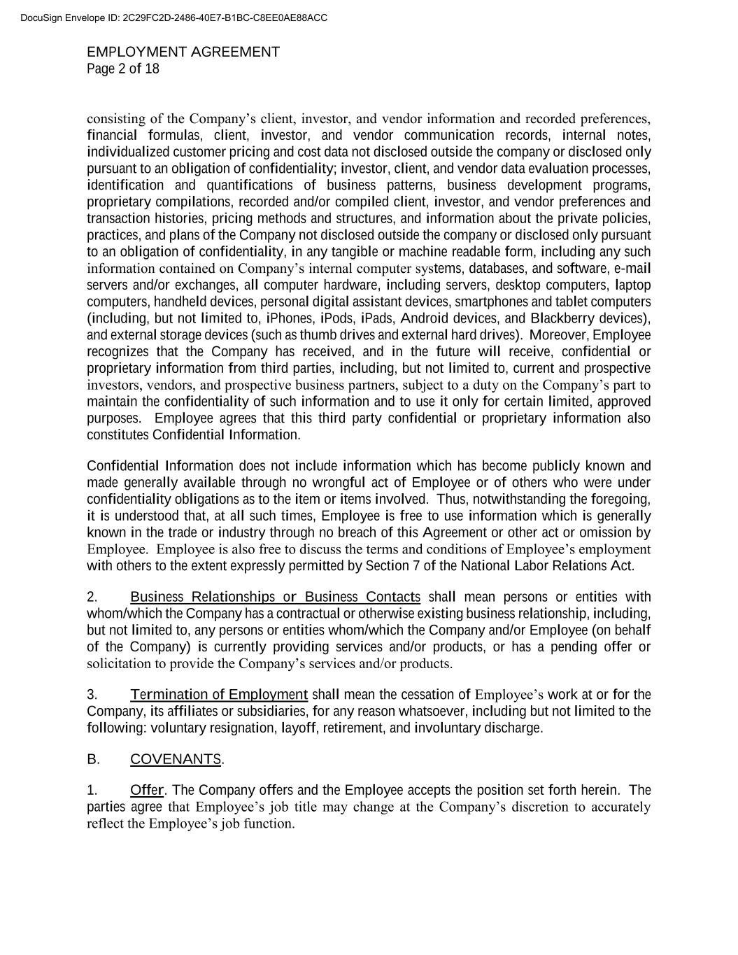 EMPLOYMENT AGREEMENT Page 2 of 18 consisting of the Company’s client, investor, and vendor information and recorded preferences, financial formulas, client, investor, and vendor communication records, internal notes, individualized customer pricing and cost data not disclosed outside the company or disclosed only pursuant to an obligation of confidentiality; investor, client, and vendor data evaluation processes, identification and quantifications of business patterns, business development programs, proprietary compilations, recorded and/or compiled client, investor, and vendor preferences and transaction histories, pricing methods and structures, and information about the private policies, practices, and plans of the Company not disclosed outside the company or disclosed only pursuant to an obligation of confidentiality, in any tangible or machine readable form, including any such information contained on Company’s internal computer systems, databases, and software, e-mail servers and/or exchanges, all computer hardware, including servers, desktop computers, laptop computers, handheld devices, personal digital assistant devices, smartphones and tablet computers (including, but not limited to, iPhones, iPods, iPads, Android devices, and Blackberry devices), and external storage devices (such as thumb drives and external hard drives). Moreover, Employee recognizes that the Company has received, and in the future will receive, confidential or proprietary information from third parties, including, but not limited to, current and prospective investors, vendors, and prospective business partners, subject to a duty on the Company’s part to maintain the confidentiality of such information and to use it only for certain limited, approved purposes. Employee agrees that this third party confidential or proprietary information also constitutes Confidential Information. Confidential Information does not include information which has become publicly known and made generally available through no wrongful act of Employee or of others who were under confidentiality obligations as to the item or items involved. Thus, notwithstanding the foregoing, it is understood that, at all such times, Employee is free to use information which is generally known in the trade or industry through no breach of this Agreement or other act or omission by Employee. Employee is also free to discuss the terms and conditions of Employee’s employment with others to the extent expressly permitted by Section 7 of the National Labor Relations Act. 2. Business Relationships or Business Contacts shall mean persons or entities with whom/which the Company has a contractual or otherwise existing business relationship, including, but not limited to, any persons or entities whom/which the Company and/or Employee (on behalf of the Company) is currently providing services and/or products, or has a pending offer or solicitation to provide the Company’s services and/or products. 3. Termination of Employment shall mean the cessation of Employee’s work at or for the Company, its affiliates or subsidiaries, for any reason whatsoever, including but not limited to the following: voluntary resignation, layoff, retirement, and involuntary discharge. B. COVENANTS. 1. Offer. The Company offers and the Employee accepts the position set forth herein. The parties agree that Employee’s job title may change at the Company’s discretion to accurately reflect the Employee’s job function. DocuSign Envelope ID: 2C29FC2D-2486-40E7-B1BC-C8EE0AE88ACC