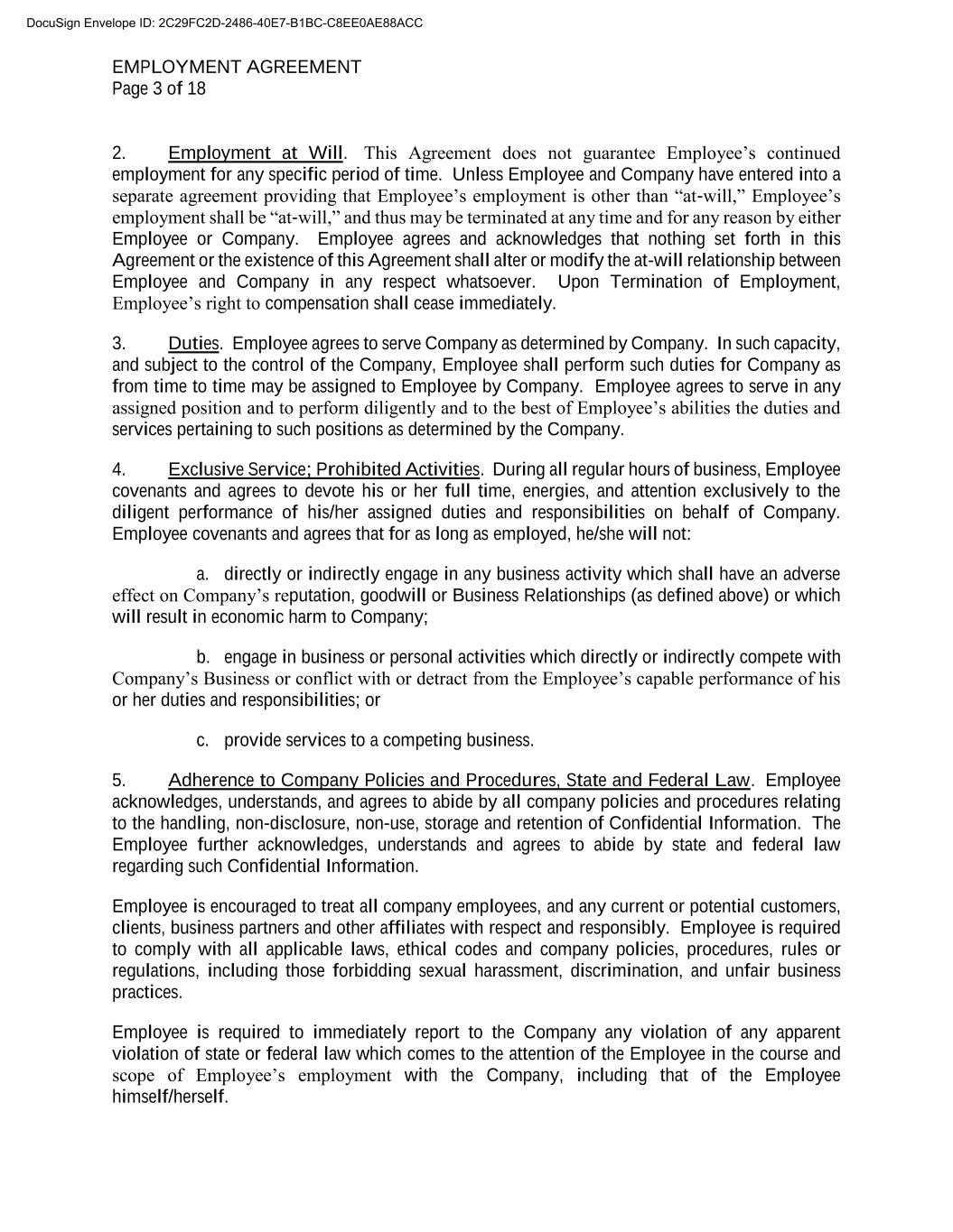 EMPLOYMENT AGREEMENT Page 3 of 18 2. Employment at Will. This Agreement does not guarantee Employee’s continued employment for any specific period of time. Unless Employee and Company have entered into a separate agreement providing that Employee’s employment is other than “at-will,” Employee’s employment shall be “at-will,” and thus may be terminated at any time and for any reason by either Employee or Company. Employee agrees and acknowledges that nothing set forth in this Agreement or the existence of this Agreement shall alter or modify the at-will relationship between Employee and Company in any respect whatsoever. Upon Termination of Employment, Employee’s right to compensation shall cease immediately. 3. Duties. Employee agrees to serve Company as determined by Company. In such capacity, and subject to the control of the Company, Employee shall perform such duties for Company as from time to time may be assigned to Employee by Company. Employee agrees to serve in any assigned position and to perform diligently and to the best of Employee’s abilities the duties and services pertaining to such positions as determined by the Company. 4. Exclusive Service; Prohibited Activities. During all regular hours of business, Employee covenants and agrees to devote his or her full time, energies, and attention exclusively to the diligent performance of his/her assigned duties and responsibilities on behalf of Company. Employee covenants and agrees that for as long as employed, he/she will not: a. directly or indirectly engage in any business activity which shall have an adverse effect on Company’s reputation, goodwill or Business Relationships (as defined above) or which will result in economic harm to Company; b. engage in business or personal activities which directly or indirectly compete with Company’s Business or conflict with or detract from the Employee’s capable performance of his or her duties and responsibilities; or c. provide services to a competing business. 5. Adherence to Company Policies and Procedures, State and Federal Law. Employee acknowledges, understands, and agrees to abide by all company policies and procedures relating to the handling, non-disclosure, non-use, storage and retention of Confidential Information. The Employee further acknowledges, understands and agrees to abide by state and federal law regarding such Confidential Information. Employee is encouraged to treat all company employees, and any current or potential customers, clients, business partners and other affiliates with respect and responsibly. Employee is required to comply with all applicable laws, ethical codes and company policies, procedures, rules or regulations, including those forbidding sexual harassment, discrimination, and unfair business practices. Employee is required to immediately report to the Company any violation of any apparent violation of state or federal law which comes to the attention of the Employee in the course and scope of Employee’s employment with the Company, including that of the Employee himself/herself. DocuSign Envelope ID: 2C29FC2D-2486-40E7-B1BC-C8EE0AE88ACC