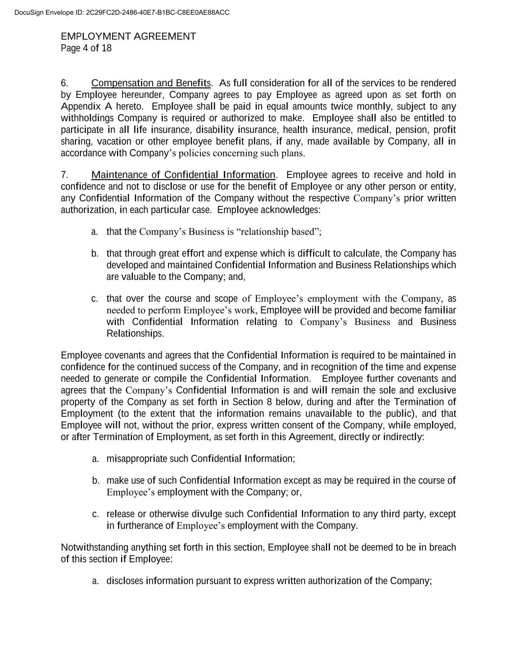 EMPLOYMENT AGREEMENT Page 4 of 18 6. Compensation and Benefits. As full consideration for all of the services to be rendered by Employee hereunder, Company agrees to pay Employee as agreed upon as set forth on Appendix A hereto. Employee shall be paid in equal amounts twice monthly, subject to any withholdings Company is required or authorized to make. Employee shall also be entitled to participate in all life insurance, disability insurance, health insurance, medical, pension, profit sharing, vacation or other employee benefit plans, if any, made available by Company, all in accordance with Company’s policies concerning such plans. 7. Maintenance of Confidential Information. Employee agrees to receive and hold in confidence and not to disclose or use for the benefit of Employee or any other person or entity, any Confidential Information of the Company without the respective Company’s prior written authorization, in each particular case. Employee acknowledges: a. that the Company’s Business is “relationship based”; b. that through great effort and expense which is difficult to calculate, the Company has developed and maintained Confidential Information and Business Relationships which are valuable to the Company; and, c. that over the course and scope of Employee’s employment with the Company, as needed to perform Employee’s work, Employee will be provided and become familiar with Confidential Information relating to Company’s Business and Business Relationships. Employee covenants and agrees that the Confidential Information is required to be maintained in confidence for the continued success of the Company, and in recognition of the time and expense needed to generate or compile the Confidential Information. Employee further covenants and agrees that the Company’s Confidential Information is and will remain the sole and exclusive property of the Company as set forth in Section 8 below, during and after the Termination of Employment (to the extent that the information remains unavailable to the public), and that Employee will not, without the prior, express written consent of the Company, while employed, or after Termination of Employment, as set forth in this Agreement, directly or indirectly: a. misappropriate such Confidential Information; b. make use of such Confidential Information except as may be required in the course of Employee’s employment with the Company; or, c. release or otherwise divulge such Confidential Information to any third party, except in furtherance of Employee’s employment with the Company. Notwithstanding anything set forth in this section, Employee shall not be deemed to be in breach of this section if Employee: a. discloses information pursuant to express written authorization of the Company; DocuSign Envelope ID: 2C29FC2D-2486-40E7-B1BC-C8EE0AE88ACC