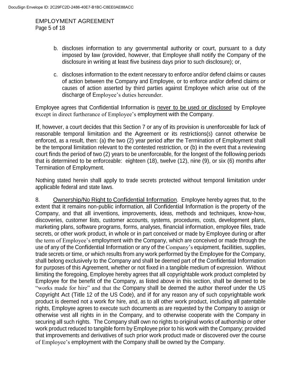 EMPLOYMENT AGREEMENT Page 5 of 18 b. discloses information to any governmental authority or court, pursuant to a duty imposed by law (provided, however, that Employee shall notify the Company of the disclosure in writing at least five business days prior to such disclosure); or, c. discloses information to the extent necessary to enforce and/or defend claims or causes of action between the Company and Employee, or to enforce and/or defend claims or causes of action asserted by third parties against Employee which arise out of the discharge of Employee’s duties hereunder. Employee agrees that Confidential Information is never to be used or disclosed by Employee except in direct furtherance of Employee’s employment with the Company. If, however, a court decides that this Section 7 or any of its provision is unenforceable for lack of reasonable temporal limitation and the Agreement or its restrictions(s) cannot otherwise be enforced, as a result, then: (a) the two (2) year period after the Termination of Employment shall be the temporal limitation relevant to the contested restriction, or (b) in the event that a reviewing court finds the period of two (2) years to be unenforceable, for the longest of the following periods that is determined to be enforceable: eighteen (18), twelve (12), nine (9), or six (6) months after Termination of Employment. Nothing stated herein shall apply to trade secrets protected without temporal limitation under applicable federal and state laws. 8. Ownership/No Right to Confidential Information. Employee hereby agrees that, to the extent that it remains non-public information, all Confidential Information is the property of the Company, and that all inventions, improvements, ideas, methods and techniques, know-how, discoveries, customer lists, customer accounts, systems, procedures, costs, development plans, marketing plans, software programs, forms, analyses, financial information, employee files, trade secrets, or other work product, in whole or in part conceived or made by Employee during or after the term of Employee’s employment with the Company, which are conceived or made through the use of any of the Confidential Information or any of the Company’s equipment, facilities, supplies, trade secrets or time, or which results from any work performed by the Employee for the Company, shall belong exclusively to the Company and shall be deemed part of the Confidential Information for purposes of this Agreement, whether or not fixed in a tangible medium of expression. Without limiting the foregoing, Employee hereby agrees that all copyrightable work product completed by Employee for the benefit of the Company, as listed above in this section, shall be deemed to be “works made for hire” and that the Company shall be deemed the author thereof under the US Copyright Act (Title 12 of the US Code), and if for any reason any of such copyrightable work product is deemed not a work for hire, and, as to all other work product, including all patentable rights, Employee agrees to execute such documents as are requested by the Company to assign or otherwise vest all rights in in the Company, and to otherwise cooperate with the Company in securing all such rights. The Company shall own no rights to original works of authorship or other work product reduced to tangible form by Employee prior to his work with the Company; provided that improvements and derivatives of such prior work product made or discovered over the course of Employee’s employment with the Company shall be owned by the Company. DocuSign Envelope ID: 2C29FC2D-2486-40E7-B1BC-C8EE0AE88ACC