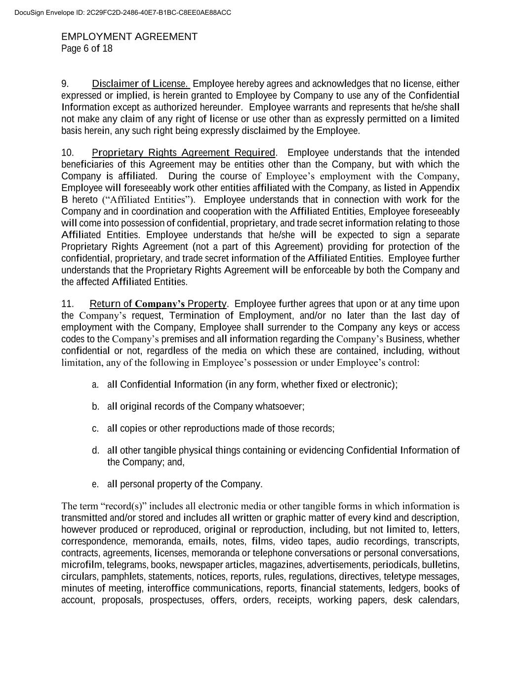 EMPLOYMENT AGREEMENT Page 6 of 18 9. Disclaimer of License. Employee hereby agrees and acknowledges that no license, either expressed or implied, is herein granted to Employee by Company to use any of the Confidential Information except as authorized hereunder. Employee warrants and represents that he/she shall not make any claim of any right of license or use other than as expressly permitted on a limited basis herein, any such right being expressly disclaimed by the Employee. 10. Proprietary Rights Agreement Required. Employee understands that the intended beneficiaries of this Agreement may be entities other than the Company, but with which the Company is affiliated. During the course of Employee’s employment with the Company, Employee will foreseeably work other entities affiliated with the Company, as listed in Appendix B hereto (“Affiliated Entities”). Employee understands that in connection with work for the Company and in coordination and cooperation with the Affiliated Entities, Employee foreseeably will come into possession of confidential, proprietary, and trade secret information relating to those Affiliated Entities. Employee understands that he/she will be expected to sign a separate Proprietary Rights Agreement (not a part of this Agreement) providing for protection of the confidential, proprietary, and trade secret information of the Affiliated Entities. Employee further understands that the Proprietary Rights Agreement will be enforceable by both the Company and the affected Affiliated Entities. 11. Return of Company’s Property. Employee further agrees that upon or at any time upon the Company’s request, Termination of Employment, and/or no later than the last day of employment with the Company, Employee shall surrender to the Company any keys or access codes to the Company’s premises and all information regarding the Company’s Business, whether confidential or not, regardless of the media on which these are contained, including, without limitation, any of the following in Employee’s possession or under Employee’s control: a. all Confidential Information (in any form, whether fixed or electronic); b. all original records of the Company whatsoever; c. all copies or other reproductions made of those records; d. all other tangible physical things containing or evidencing Confidential Information of the Company; and, e. all personal property of the Company. The term “record(s)” includes all electronic media or other tangible forms in which information is transmitted and/or stored and includes all written or graphic matter of every kind and description, however produced or reproduced, original or reproduction, including, but not limited to, letters, correspondence, memoranda, emails, notes, films, video tapes, audio recordings, transcripts, contracts, agreements, licenses, memoranda or telephone conversations or personal conversations, microfilm, telegrams, books, newspaper articles, magazines, advertisements, periodicals, bulletins, circulars, pamphlets, statements, notices, reports, rules, regulations, directives, teletype messages, minutes of meeting, interoffice communications, reports, financial statements, ledgers, books of account, proposals, prospectuses, offers, orders, receipts, working papers, desk calendars, DocuSign Envelope ID: 2C29FC2D-2486-40E7-B1BC-C8EE0AE88ACC