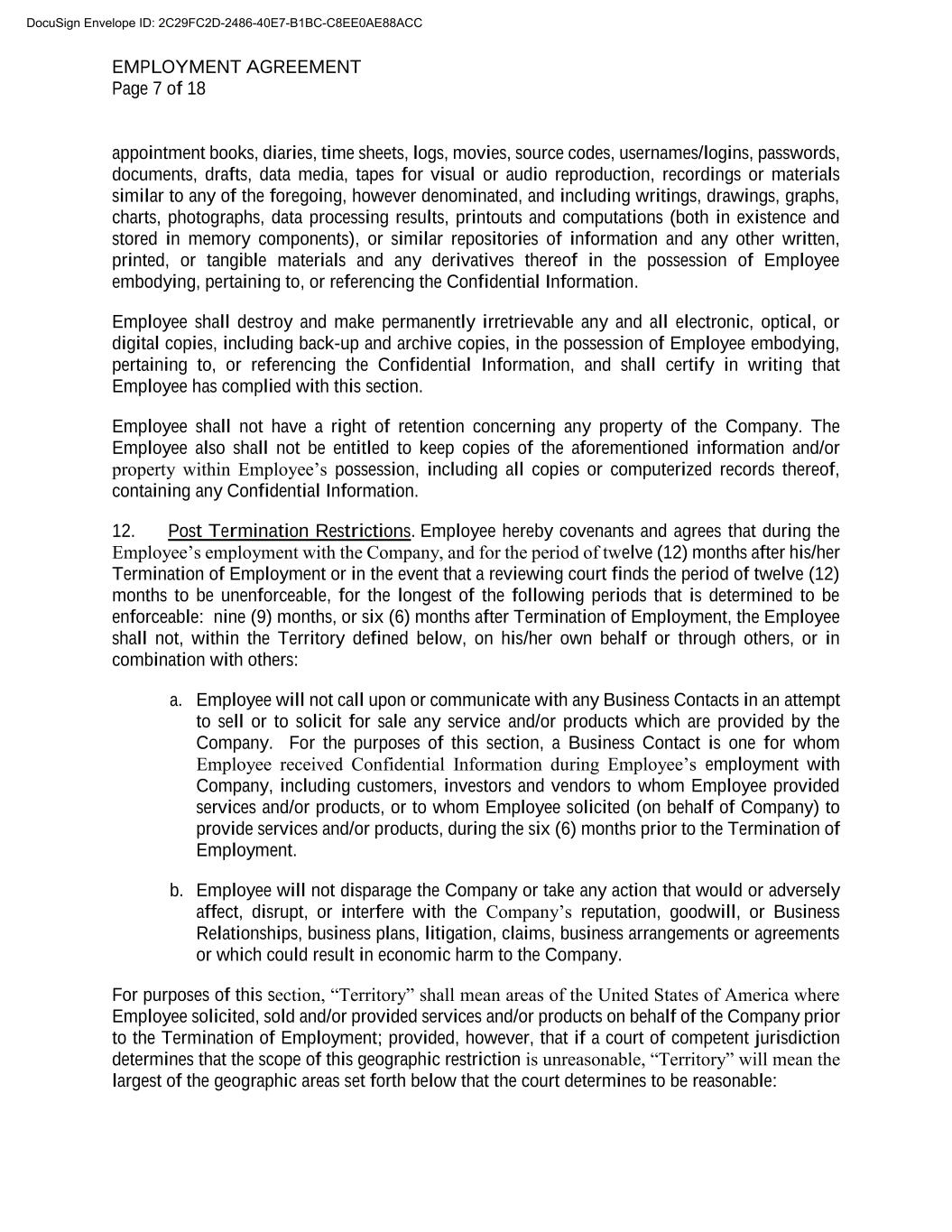 EMPLOYMENT AGREEMENT Page 7 of 18 appointment books, diaries, time sheets, logs, movies, source codes, usernames/logins, passwords, documents, drafts, data media, tapes for visual or audio reproduction, recordings or materials similar to any of the foregoing, however denominated, and including writings, drawings, graphs, charts, photographs, data processing results, printouts and computations (both in existence and stored in memory components), or similar repositories of information and any other written, printed, or tangible materials and any derivatives thereof in the possession of Employee embodying, pertaining to, or referencing the Confidential Information. Employee shall destroy and make permanently irretrievable any and all electronic, optical, or digital copies, including back-up and archive copies, in the possession of Employee embodying, pertaining to, or referencing the Confidential Information, and shall certify in writing that Employee has complied with this section. Employee shall not have a right of retention concerning any property of the Company. The Employee also shall not be entitled to keep copies of the aforementioned information and/or property within Employee’s possession, including all copies or computerized records thereof, containing any Confidential Information. 12. Post Termination Restrictions. Employee hereby covenants and agrees that during the Employee’s employment with the Company, and for the period of twelve (12) months after his/her Termination of Employment or in the event that a reviewing court finds the period of twelve (12) months to be unenforceable, for the longest of the following periods that is determined to be enforceable: nine (9) months, or six (6) months after Termination of Employment, the Employee shall not, within the Territory defined below, on his/her own behalf or through others, or in combination with others: a. Employee will not call upon or communicate with any Business Contacts in an attempt to sell or to solicit for sale any service and/or products which are provided by the Company. For the purposes of this section, a Business Contact is one for whom Employee received Confidential Information during Employee’s employment with Company, including customers, investors and vendors to whom Employee provided services and/or products, or to whom Employee solicited (on behalf of Company) to provide services and/or products, during the six (6) months prior to the Termination of Employment. b. Employee will not disparage the Company or take any action that would or adversely affect, disrupt, or interfere with the Company’s reputation, goodwill, or Business Relationships, business plans, litigation, claims, business arrangements or agreements or which could result in economic harm to the Company. For purposes of this section, “Territory” shall mean areas of the United States of America where Employee solicited, sold and/or provided services and/or products on behalf of the Company prior to the Termination of Employment; provided, however, that if a court of competent jurisdiction determines that the scope of this geographic restriction is unreasonable, “Territory” will mean the largest of the geographic areas set forth below that the court determines to be reasonable: DocuSign Envelope ID: 2C29FC2D-2486-40E7-B1BC-C8EE0AE88ACC