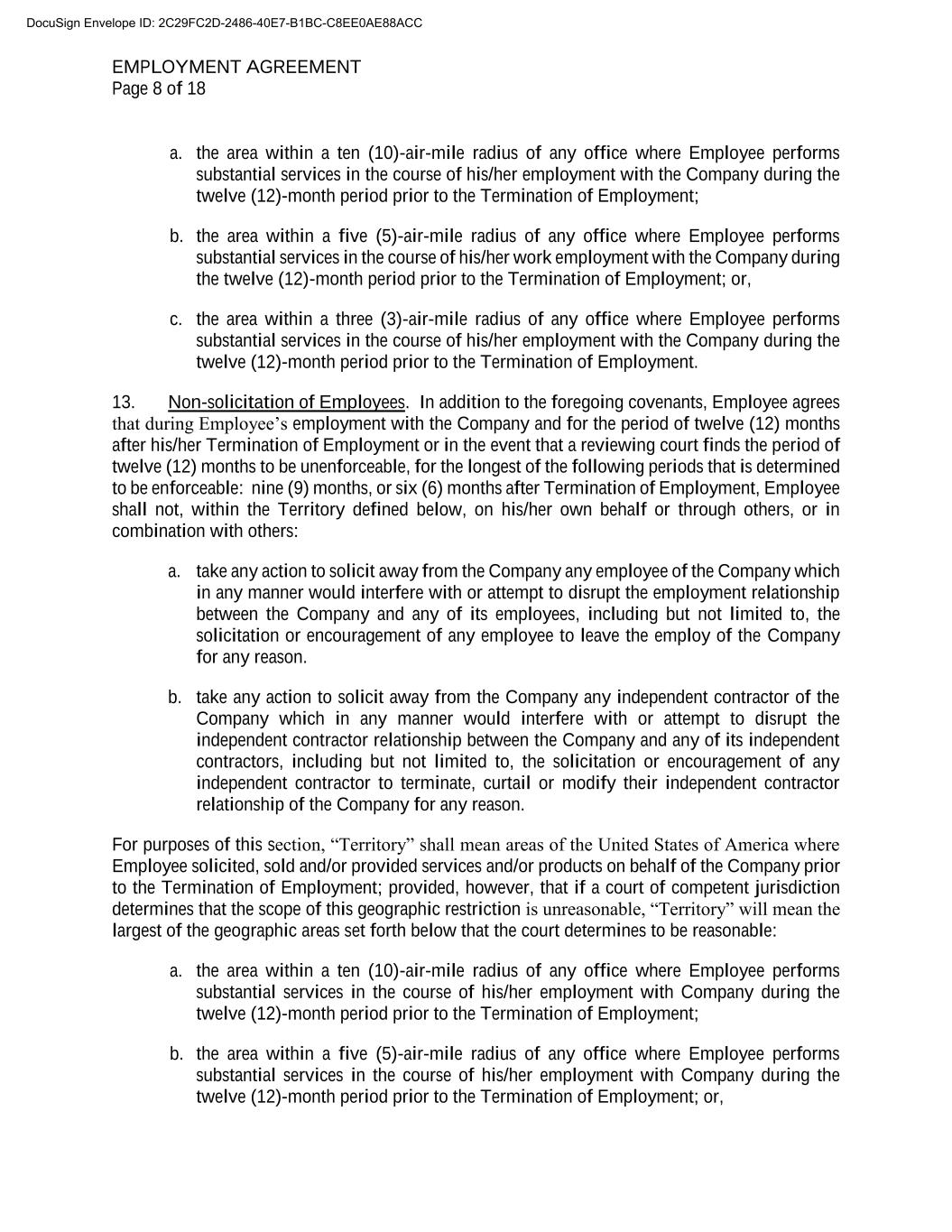 EMPLOYMENT AGREEMENT Page 8 of 18 a. the area within a ten (10)-air-mile radius of any office where Employee performs substantial services in the course of his/her employment with the Company during the twelve (12)-month period prior to the Termination of Employment; b. the area within a five (5)-air-mile radius of any office where Employee performs substantial services in the course of his/her work employment with the Company during the twelve (12)-month period prior to the Termination of Employment; or, c. the area within a three (3)-air-mile radius of any office where Employee performs substantial services in the course of his/her employment with the Company during the twelve (12)-month period prior to the Termination of Employment. 13. Non-solicitation of Employees. In addition to the foregoing covenants, Employee agrees that during Employee’s employment with the Company and for the period of twelve (12) months after his/her Termination of Employment or in the event that a reviewing court finds the period of twelve (12) months to be unenforceable, for the longest of the following periods that is determined to be enforceable: nine (9) months, or six (6) months after Termination of Employment, Employee shall not, within the Territory defined below, on his/her own behalf or through others, or in combination with others: a. take any action to solicit away from the Company any employee of the Company which in any manner would interfere with or attempt to disrupt the employment relationship between the Company and any of its employees, including but not limited to, the solicitation or encouragement of any employee to leave the employ of the Company for any reason. b. take any action to solicit away from the Company any independent contractor of the Company which in any manner would interfere with or attempt to disrupt the independent contractor relationship between the Company and any of its independent contractors, including but not limited to, the solicitation or encouragement of any independent contractor to terminate, curtail or modify their independent contractor relationship of the Company for any reason. For purposes of this section, “Territory” shall mean areas of the United States of America where Employee solicited, sold and/or provided services and/or products on behalf of the Company prior to the Termination of Employment; provided, however, that if a court of competent jurisdiction determines that the scope of this geographic restriction is unreasonable, “Territory” will mean the largest of the geographic areas set forth below that the court determines to be reasonable: a. the area within a ten (10)-air-mile radius of any office where Employee performs substantial services in the course of his/her employment with Company during the twelve (12)-month period prior to the Termination of Employment; b. the area within a five (5)-air-mile radius of any office where Employee performs substantial services in the course of his/her employment with Company during the twelve (12)-month period prior to the Termination of Employment; or, DocuSign Envelope ID: 2C29FC2D-2486-40E7-B1BC-C8EE0AE88ACC
