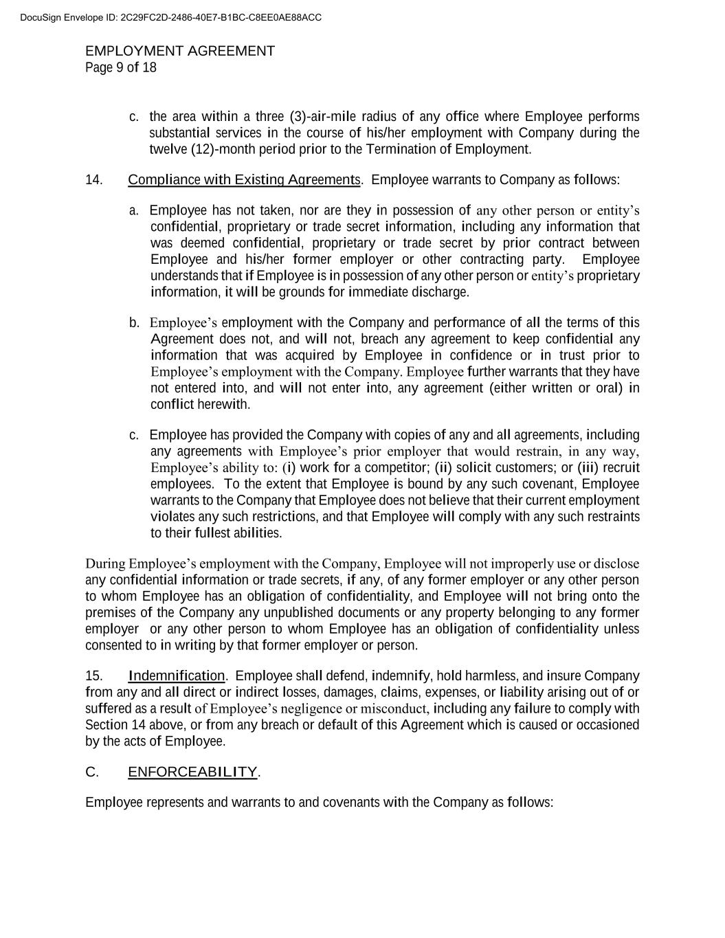 EMPLOYMENT AGREEMENT Page 9 of 18 c. the area within a three (3)-air-mile radius of any office where Employee performs substantial services in the course of his/her employment with Company during the twelve (12)-month period prior to the Termination of Employment. 14. Compliance with Existing Agreements. Employee warrants to Company as follows: a. Employee has not taken, nor are they in possession of any other person or entity’s confidential, proprietary or trade secret information, including any information that was deemed confidential, proprietary or trade secret by prior contract between Employee and his/her former employer or other contracting party. Employee understands that if Employee is in possession of any other person or entity’s proprietary information, it will be grounds for immediate discharge. b. Employee’s employment with the Company and performance of all the terms of this Agreement does not, and will not, breach any agreement to keep confidential any information that was acquired by Employee in confidence or in trust prior to Employee’s employment with the Company. Employee further warrants that they have not entered into, and will not enter into, any agreement (either written or oral) in conflict herewith. c. Employee has provided the Company with copies of any and all agreements, including any agreements with Employee’s prior employer that would restrain, in any way, Employee’s ability to: (i) work for a competitor; (ii) solicit customers; or (iii) recruit employees. To the extent that Employee is bound by any such covenant, Employee warrants to the Company that Employee does not believe that their current employment violates any such restrictions, and that Employee will comply with any such restraints to their fullest abilities. During Employee’s employment with the Company, Employee will not improperly use or disclose any confidential information or trade secrets, if any, of any former employer or any other person to whom Employee has an obligation of confidentiality, and Employee will not bring onto the premises of the Company any unpublished documents or any property belonging to any former employer or any other person to whom Employee has an obligation of confidentiality unless consented to in writing by that former employer or person. 15. Indemnification. Employee shall defend, indemnify, hold harmless, and insure Company from any and all direct or indirect losses, damages, claims, expenses, or liability arising out of or suffered as a result of Employee’s negligence or misconduct, including any failure to comply with Section 14 above, or from any breach or default of this Agreement which is caused or occasioned by the acts of Employee. C. ENFORCEABILITY. Employee represents and warrants to and covenants with the Company as follows: DocuSign Envelope ID: 2C29FC2D-2486-40E7-B1BC-C8EE0AE88ACC