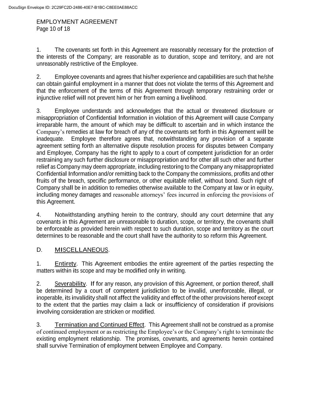 EMPLOYMENT AGREEMENT Page 10 of 18 1. The covenants set forth in this Agreement are reasonably necessary for the protection of the interests of the Company; are reasonable as to duration, scope and territory, and are not unreasonably restrictive of the Employee. 2. Employee covenants and agrees that his/her experience and capabilities are such that he/she can obtain gainful employment in a manner that does not violate the terms of this Agreement and that the enforcement of the terms of this Agreement through temporary restraining order or injunctive relief will not prevent him or her from earning a livelihood. 3. Employee understands and acknowledges that the actual or threatened disclosure or misappropriation of Confidential Information in violation of this Agreement will cause Company irreparable harm, the amount of which may be difficult to ascertain and in which instance the Company’s remedies at law for breach of any of the covenants set forth in this Agreement will be inadequate. Employee therefore agrees that, notwithstanding any provision of a separate agreement setting forth an alternative dispute resolution process for disputes between Company and Employee, Company has the right to apply to a court of competent jurisdiction for an order restraining any such further disclosure or misappropriation and for other all such other and further relief as Company may deem appropriate, including restoring to the Company any misappropriated Confidential Information and/or remitting back to the Company the commissions, profits and other fruits of the breach, specific performance, or other equitable relief, without bond. Such right of Company shall be in addition to remedies otherwise available to the Company at law or in equity, including money damages and reasonable attorneys’ fees incurred in enforcing the provisions of this Agreement. 4. Notwithstanding anything herein to the contrary, should any court determine that any covenants in this Agreement are unreasonable to duration, scope, or territory, the covenants shall be enforceable as provided herein with respect to such duration, scope and territory as the court determines to be reasonable and the court shall have the authority to so reform this Agreement. D. MISCELLANEOUS. 1. Entirety. This Agreement embodies the entire agreement of the parties respecting the matters within its scope and may be modified only in writing. 2. Severability. If for any reason, any provision of this Agreement, or portion thereof, shall be determined by a court of competent jurisdiction to be invalid, unenforceable, illegal, or inoperable, its invalidity shall not affect the validity and effect of the other provisions hereof except to the extent that the parties may claim a lack or insufficiency of consideration if provisions involving consideration are stricken or modified. 3. Termination and Continued Effect. This Agreement shall not be construed as a promise of continued employment or as restricting the Employee’s or the Company’s right to terminate the existing employment relationship. The promises, covenants, and agreements herein contained shall survive Termination of employment between Employee and Company. DocuSign Envelope ID: 2C29FC2D-2486-40E7-B1BC-C8EE0AE88ACC