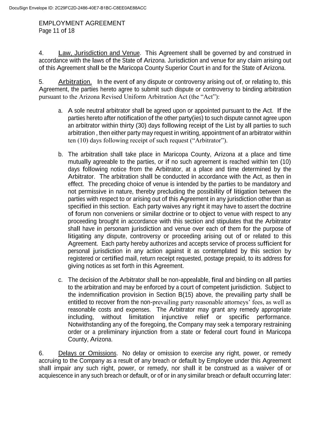 EMPLOYMENT AGREEMENT Page 11 of 18 4. Law, Jurisdiction and Venue. This Agreement shall be governed by and construed in accordance with the laws of the State of Arizona. Jurisdiction and venue for any claim arising out of this Agreement shall be the Maricopa County Superior Court in and for the State of Arizona. 5. Arbitration. In the event of any dispute or controversy arising out of, or relating to, this Agreement, the parties hereto agree to submit such dispute or controversy to binding arbitration pursuant to the Arizona Revised Uniform Arbitration Act (the “Act”): a. A sole neutral arbitrator shall be agreed upon or appointed pursuant to the Act. If the parties hereto after notification of the other party(ies) to such dispute cannot agree upon an arbitrator within thirty (30) days following receipt of the List by all parties to such arbitration , then either party may request in writing, appointment of an arbitrator within ten (10) days following receipt of such request (“Arbitrator”). b. The arbitration shall take place in Maricopa County, Arizona at a place and time mutually agreeable to the parties, or if no such agreement is reached within ten (10) days following notice from the Arbitrator, at a place and time determined by the Arbitrator. The arbitration shall be conducted in accordance with the Act, as then in effect. The preceding choice of venue is intended by the parties to be mandatory and not permissive in nature, thereby precluding the possibility of litigation between the parties with respect to or arising out of this Agreement in any jurisdiction other than as specified in this section. Each party waives any right it may have to assert the doctrine of forum non conveniens or similar doctrine or to object to venue with respect to any proceeding brought in accordance with this section and stipulates that the Arbitrator shall have in personam jurisdiction and venue over each of them for the purpose of litigating any dispute, controversy or proceeding arising out of or related to this Agreement. Each party hereby authorizes and accepts service of process sufficient for personal jurisdiction in any action against it as contemplated by this section by registered or certified mail, return receipt requested, postage prepaid, to its address for giving notices as set forth in this Agreement. c. The decision of the Arbitrator shall be non-appealable, final and binding on all parties to the arbitration and may be enforced by a court of competent jurisdiction. Subject to the indemnification provision in Section B(15) above, the prevailing party shall be entitled to recover from the non-prevailing party reasonable attorneys’ fees, as well as reasonable costs and expenses. The Arbitrator may grant any remedy appropriate including, without limitation injunctive relief or specific performance. Notwithstanding any of the foregoing, the Company may seek a temporary restraining order or a preliminary injunction from a state or federal court found in Maricopa County, Arizona. 6. Delays or Omissions. No delay or omission to exercise any right, power, or remedy accruing to the Company as a result of any breach or default by Employee under this Agreement shall impair any such right, power, or remedy, nor shall it be construed as a waiver of or acquiescence in any such breach or default, or of or in any similar breach or default occurring later: DocuSign Envelope ID: 2C29FC2D-2486-40E7-B1BC-C8EE0AE88ACC