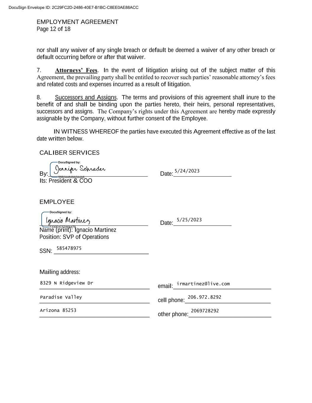 EMPLOYMENT AGREEMENT Page 12 of 18 nor shall any waiver of any single breach or default be deemed a waiver of any other breach or default occurring before or after that waiver. 7. Attorneys’ Fees. In the event of litigation arising out of the subject matter of this Agreement, the prevailing party shall be entitled to recover such parties’ reasonable attorney’s fees and related costs and expenses incurred as a result of litigation. 8. Successors and Assigns. The terms and provisions of this agreement shall inure to the benefit of and shall be binding upon the parties hereto, their heirs, personal representatives, successors and assigns. The Company’s rights under this Agreement are hereby made expressly assignable by the Company, without further consent of the Employee. IN WITNESS WHEREOF the parties have executed this Agreement effective as of the last date written below. CALIBER SERVICES By: Its: President & COO Date: EMPLOYEE Name (print): Ignacio Martinez Position: SVP of Operations SSN: _______________________________ Date: Mailing address: ____________________________________ email:________________________________ ____________________________________ cell phone:____________________________ ____________________________________ other phone:___________________________ DocuSign Envelope ID: 2C29FC2D-2486-40E7-B1BC-C8EE0AE88ACC 5/24/2023 5/25/2023 2069728292 8329 N Ridgeview Dr Arizona 85253 Paradise Valley irmartinez@live.com 206.972.8292 585478975